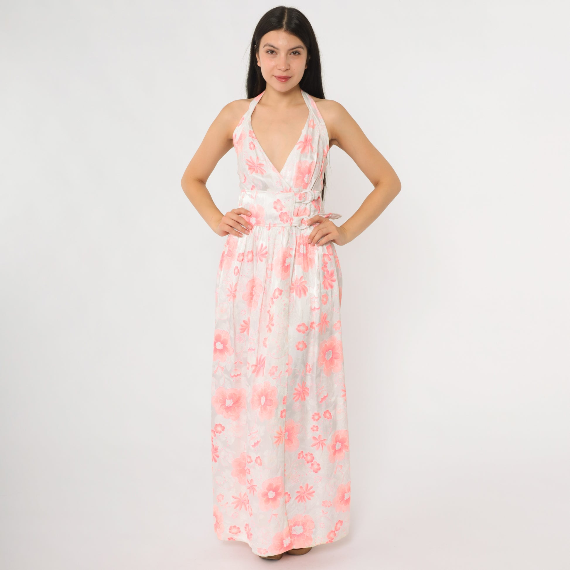 70s Courrèges Paris maxi wrap dress in white with a pink floral print. Features a plunging halter neckline and a fitted bodice that ties at the waist. The waist is cinched with two matching fabric belts finished with round white rings, leading into a full-length skirt.