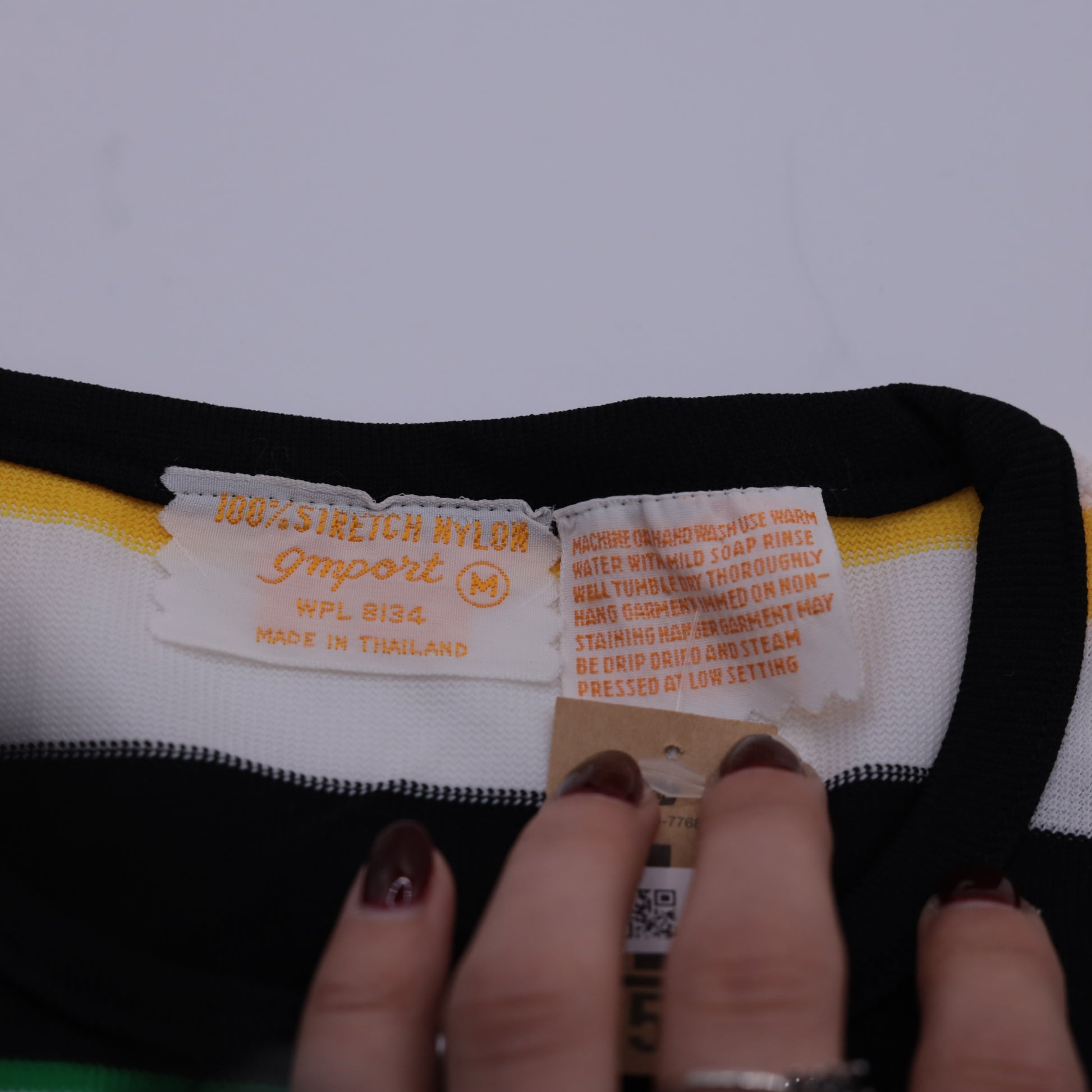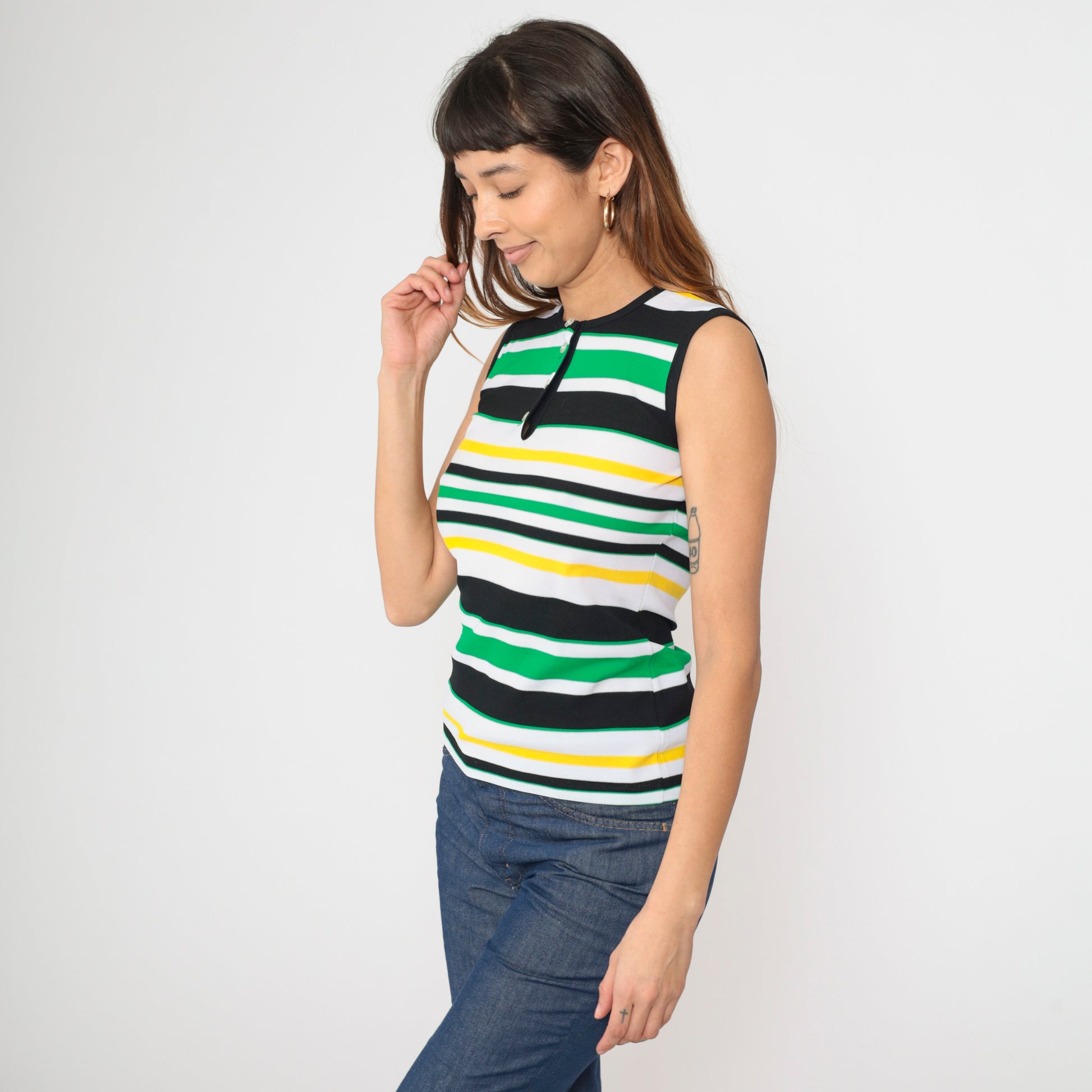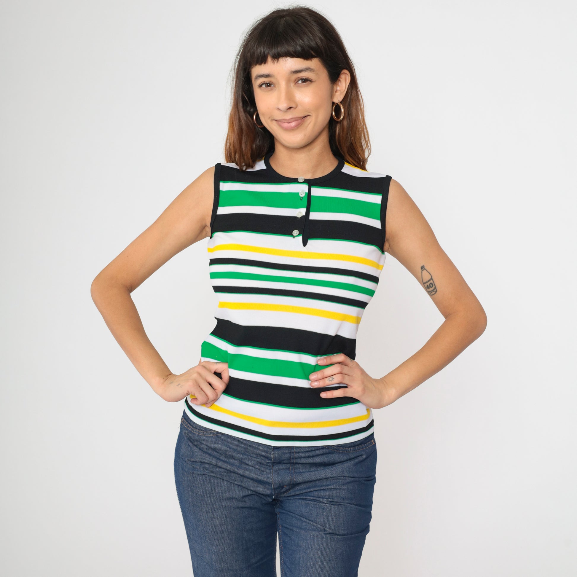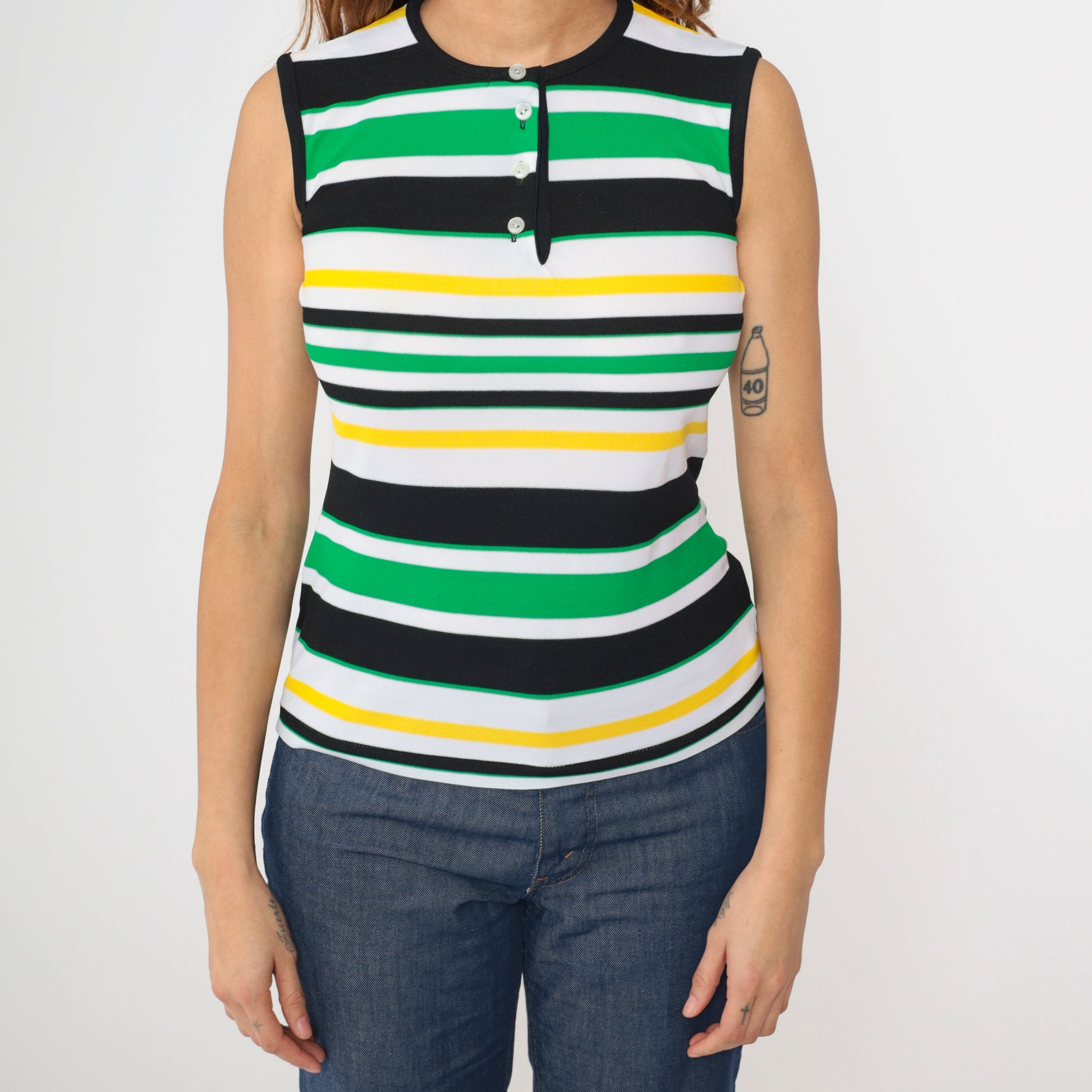 Vintage 70s tank top in white, black, green and yellow stripes. Sleeveless with a button up henley neckline.