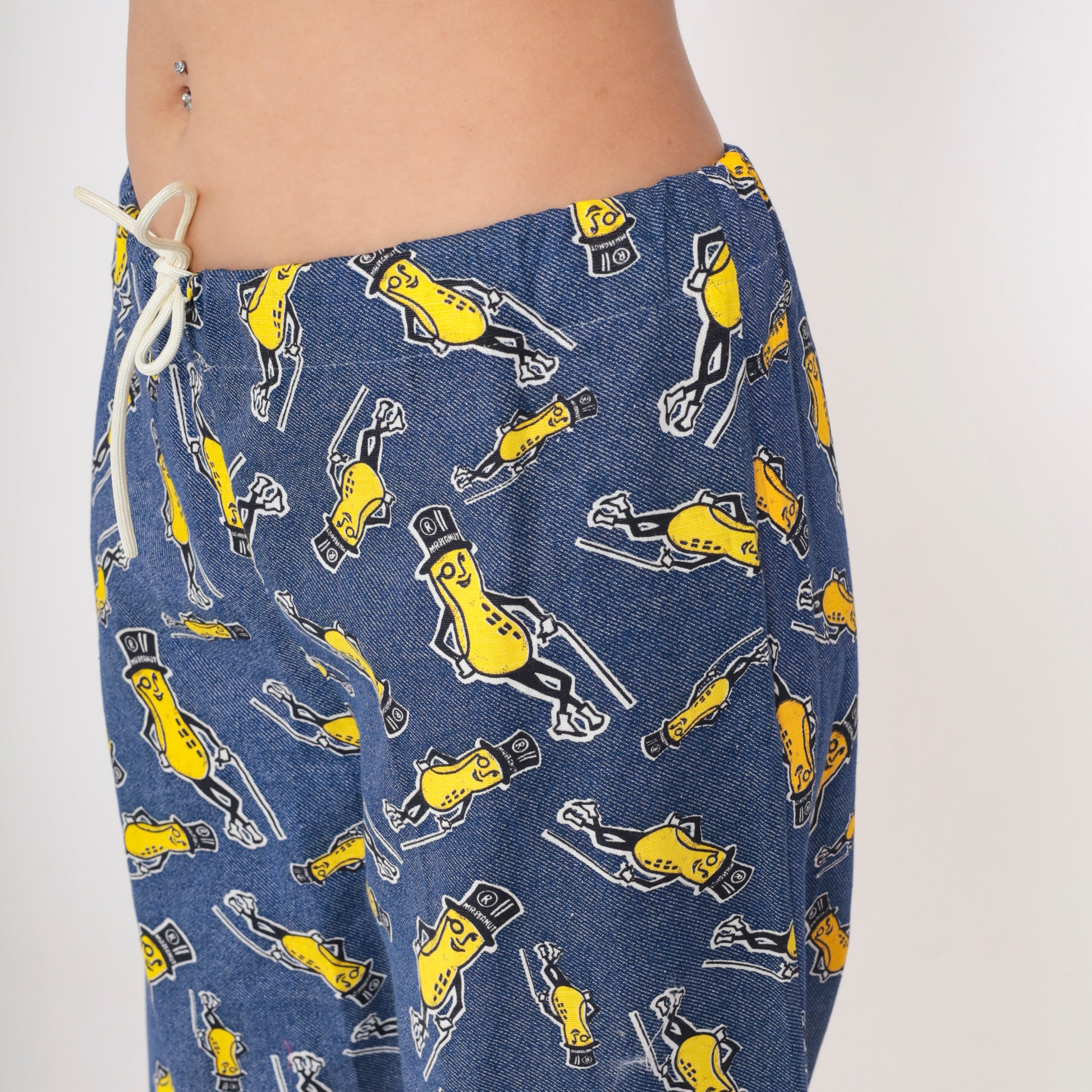 70s Planters Peanuts Pants Blue Yellow Mascot Pajama Lounge Wide Leg Drawstring Waist Palazzo Novelty Character Vintage Sleep Wear Medium M