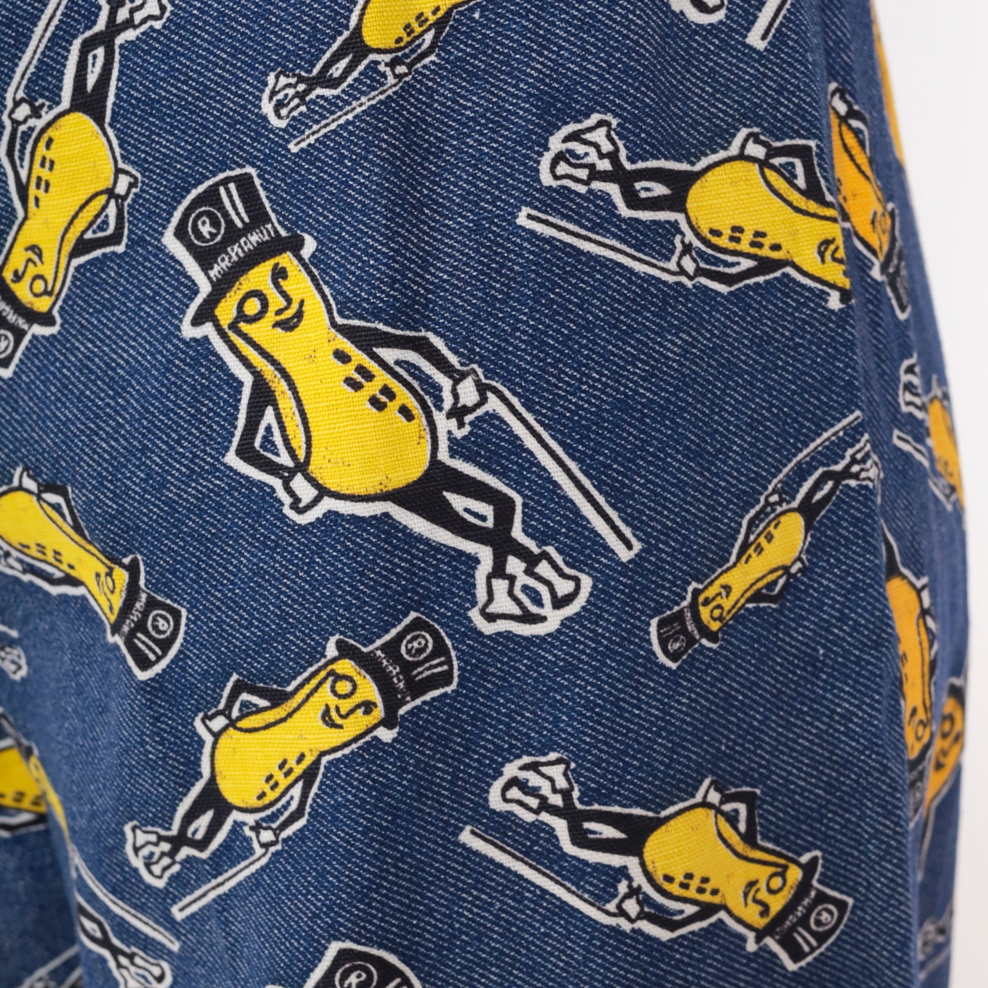 70s navy blue wide leg pants with all-over Planters Mr. Peanut mascot print in yellow and white. Cartoon peanut character with top hat, monocle, and cane repeated across the fabric. Elastic drawstring waist with white ties, wide flared leg opening.