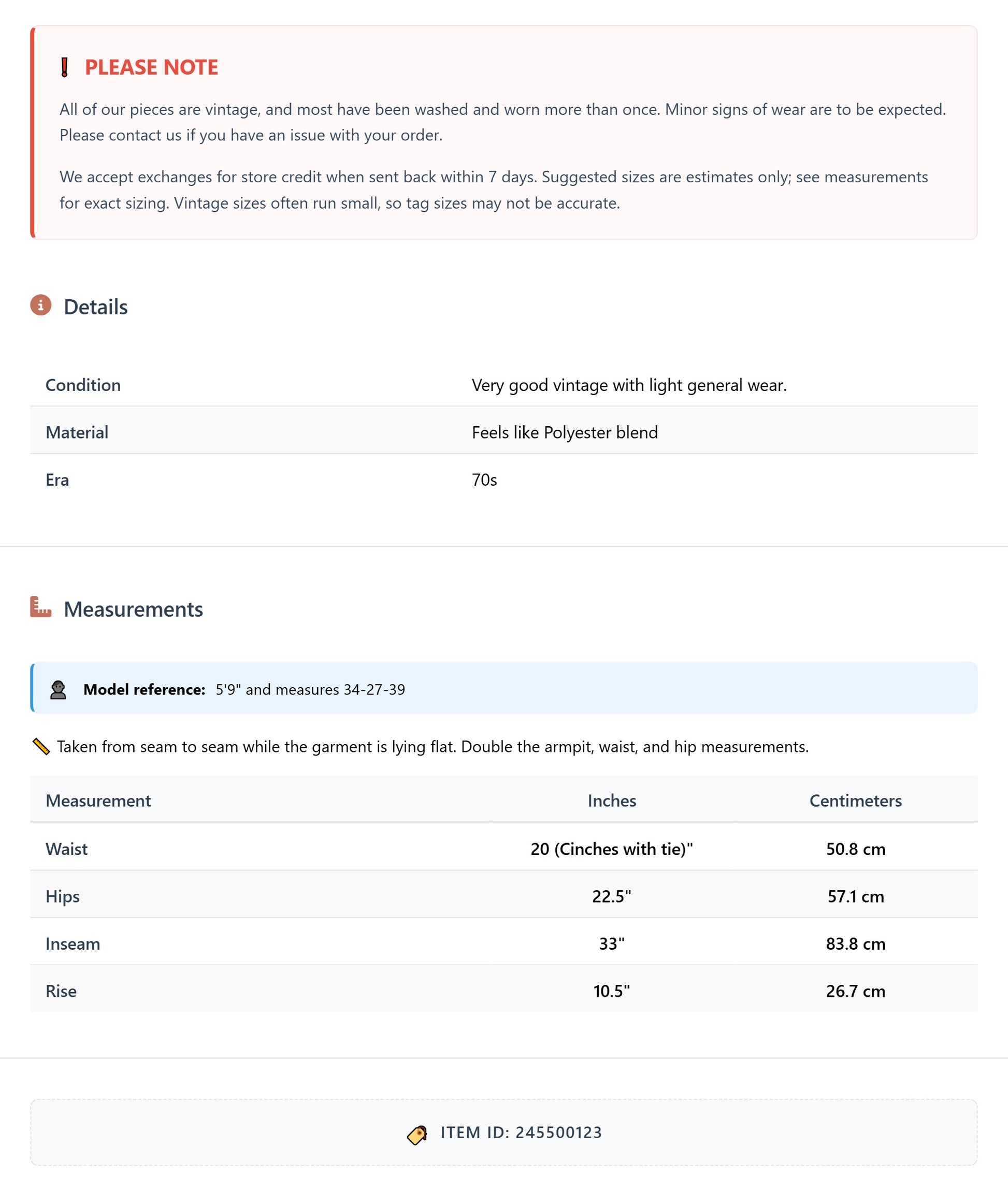 All of our pieces are vintage, and most have been washed and worn more than once. Minor signs of wear are to be expected. Please contact us if you have an issue with your order. We accept exchanges for store credit when sent back within 7 days.