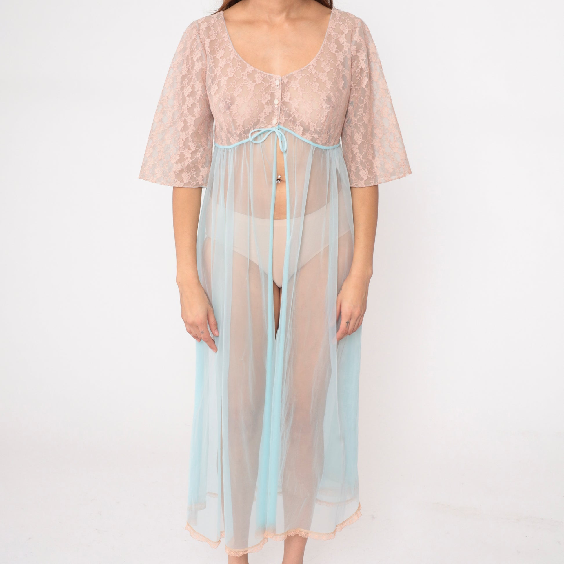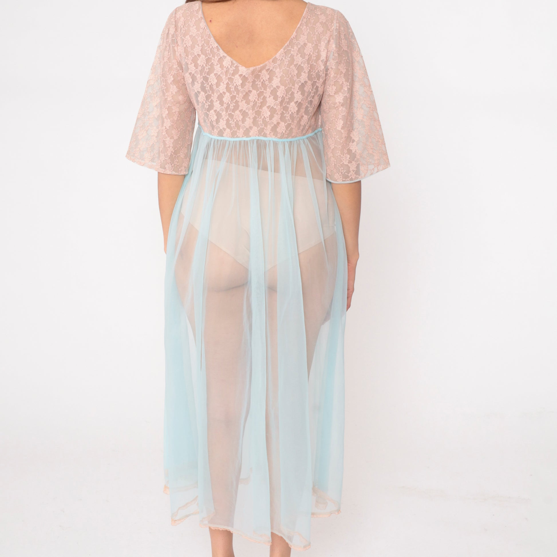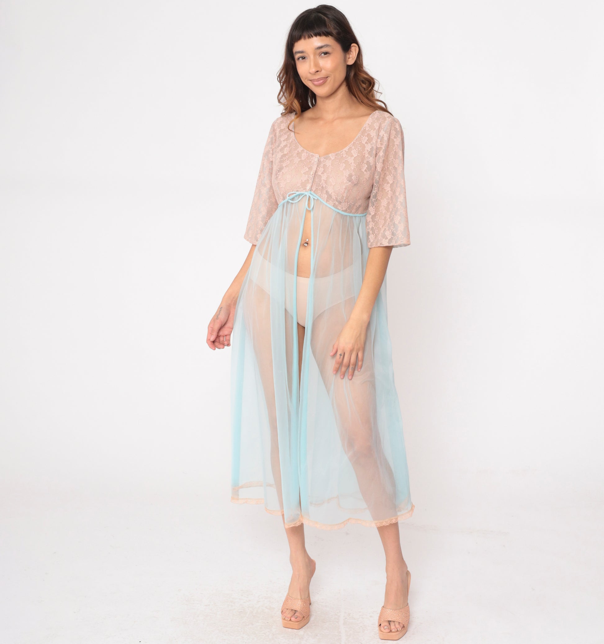 70s Sheer Nightgown Beige Lace Blue Chiffon Maxi Peignoir Empire Waist Tie Fairy Coquette Lingerie Robe Babydoll Vintage Romantic Small S