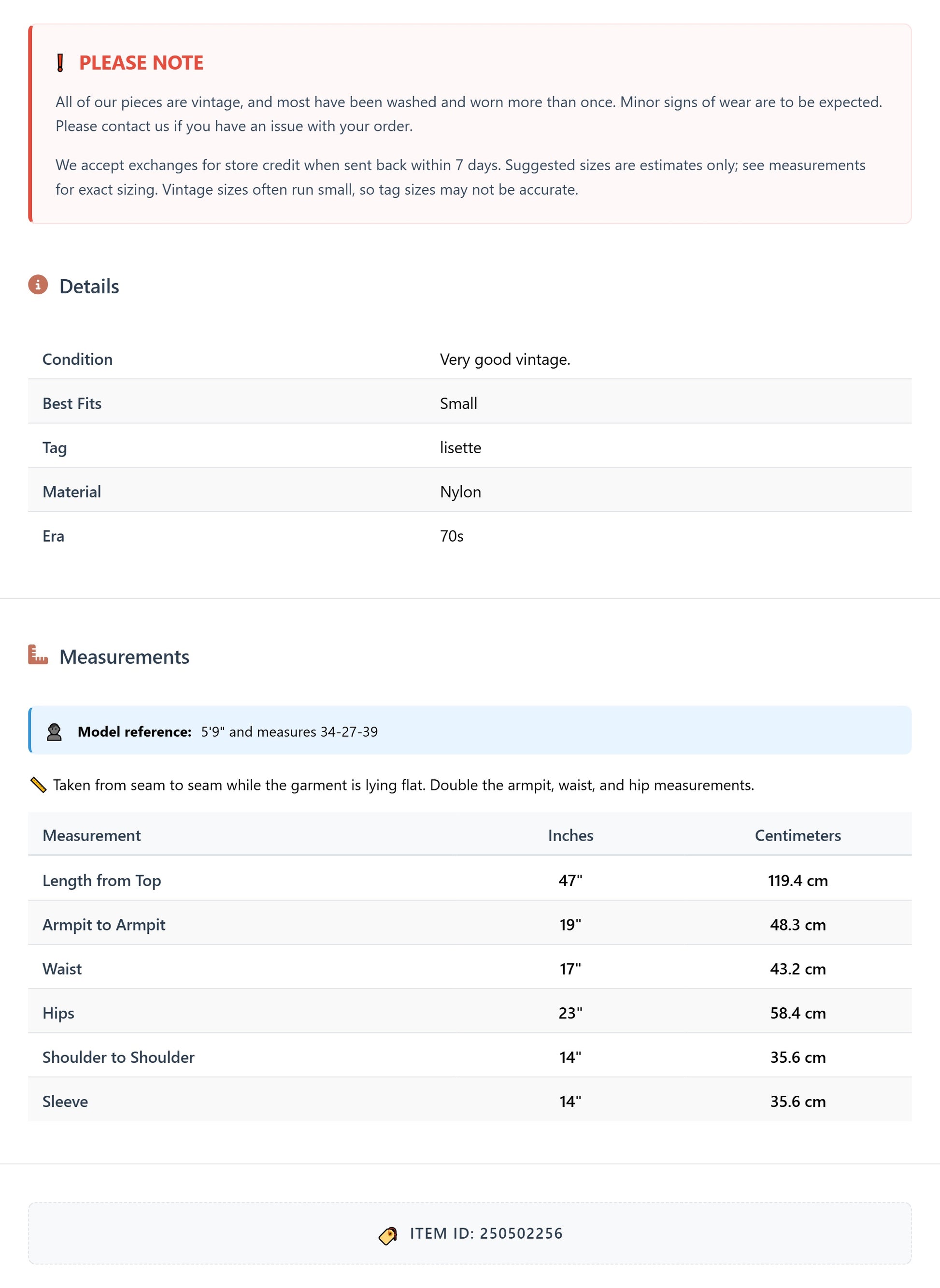 All of our pieces are vintage, and most have been washed and worn more than once. Minor signs of wear are to be expected. Please contact us if you have an issue with your order. We accept exchanges for store credit when sent back within 7 days.