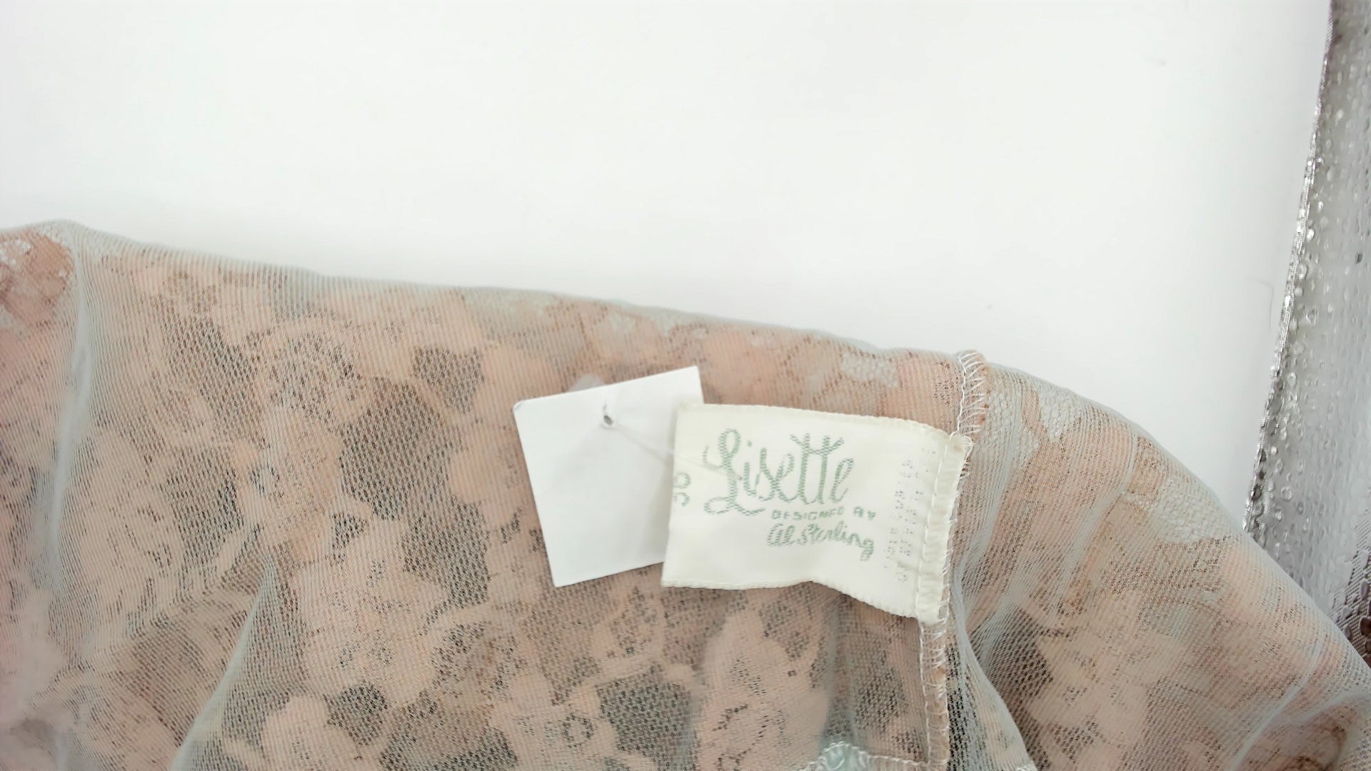 70s beige and light blue nightgown with floral lace bodice and sheer skirt. V-neckline with button front closure, short sleeves, empire waist with blue ribbon tie detail. Long sheer skirt with light blue trim at hem.