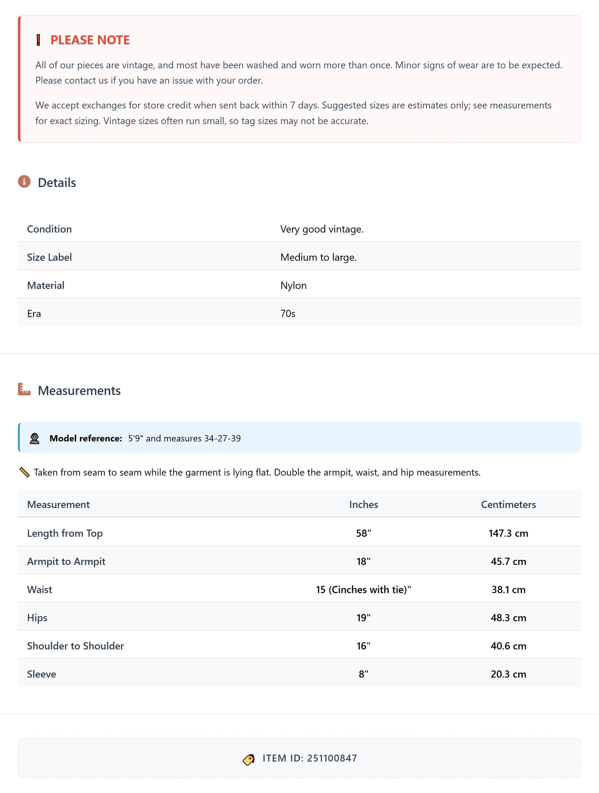 All of our pieces are vintage, and most have been washed and worn more than once. Minor signs of wear are to be expected. Please contact us if you have an issue with your order. We accept exchanges for store credit when sent back within 7 days.