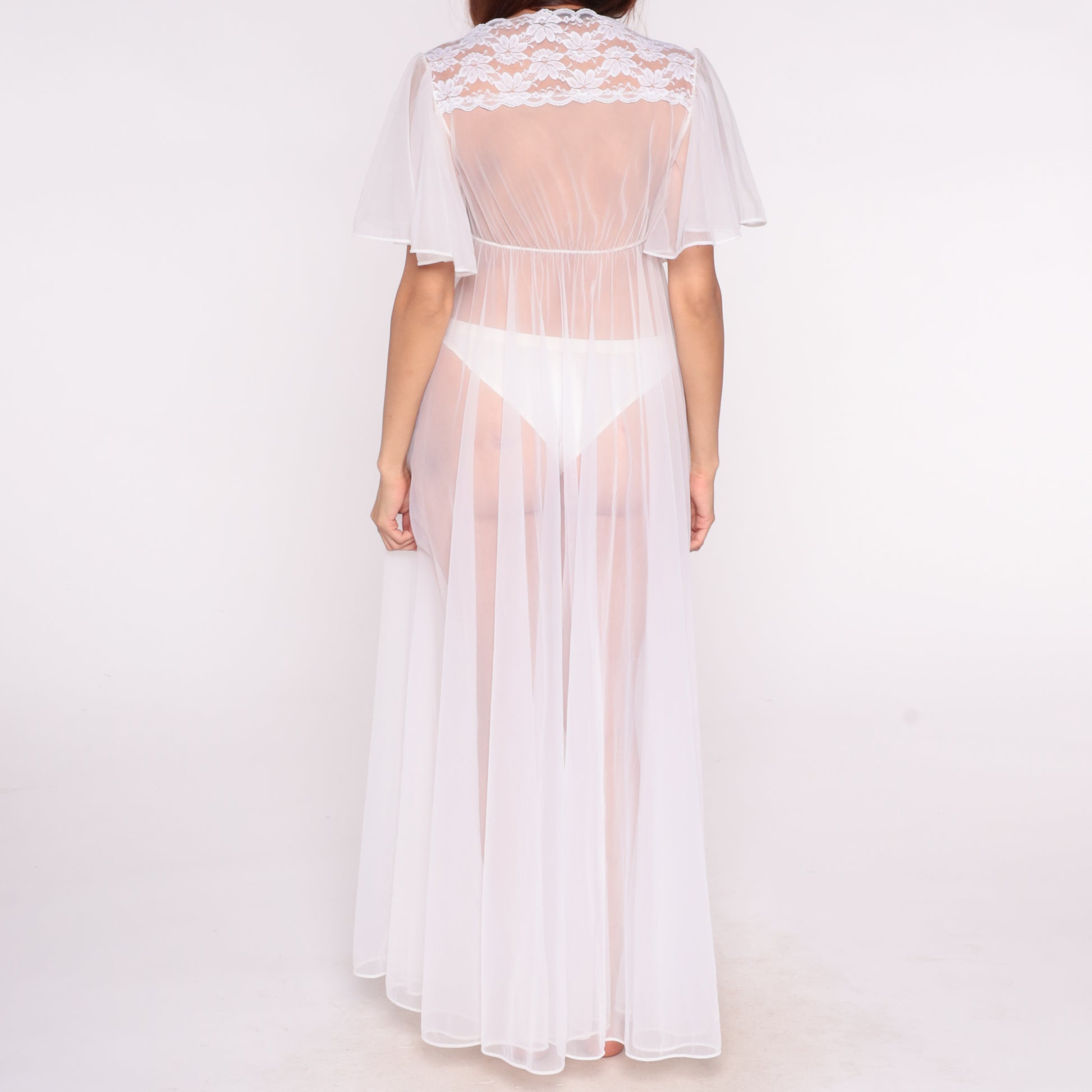 70s White Lace Robe Duster Sheer Flutter Sleeve Coquette Fairycore Victorian Bridal Lingerie Nightgown Loungewear Medium To Large M L