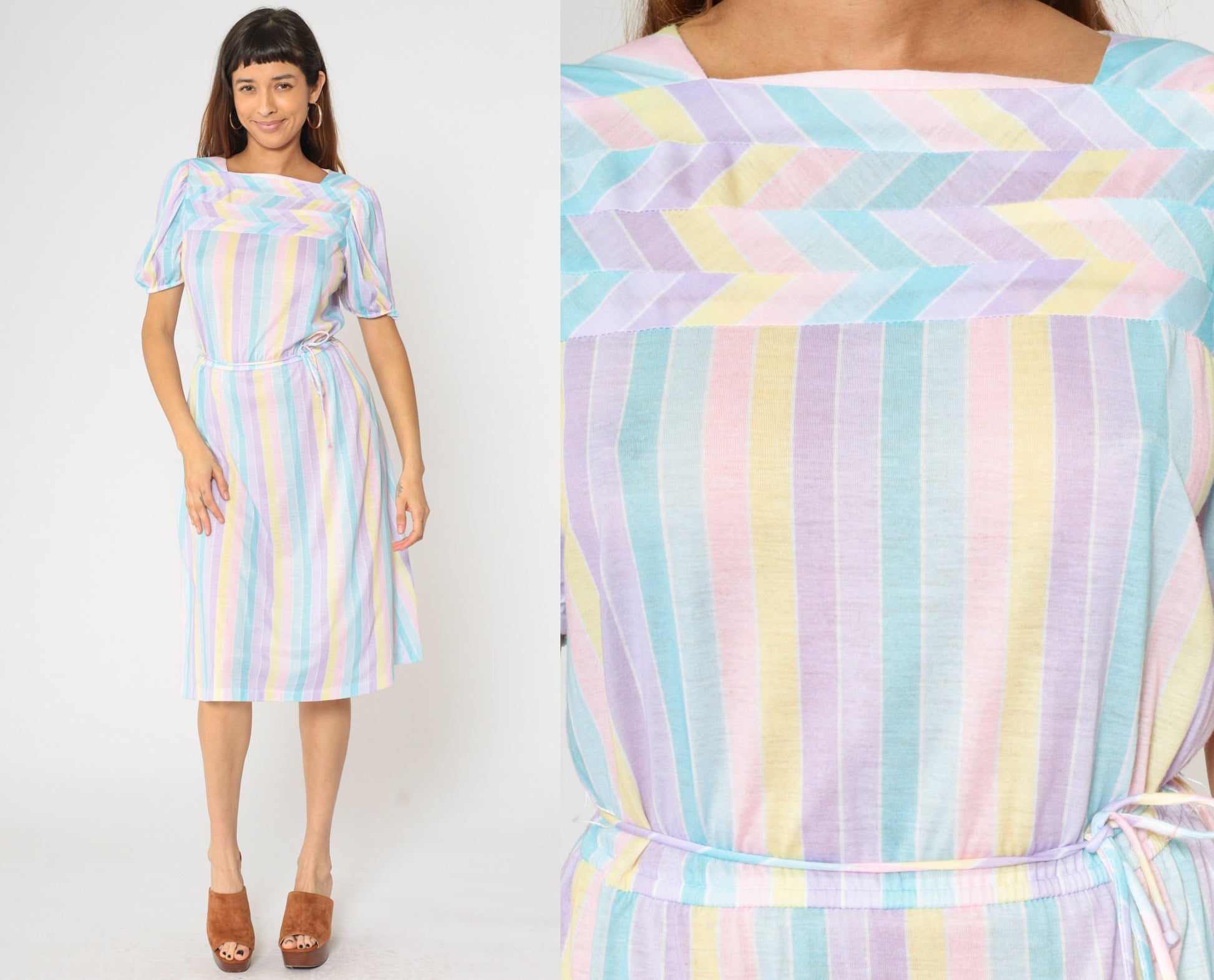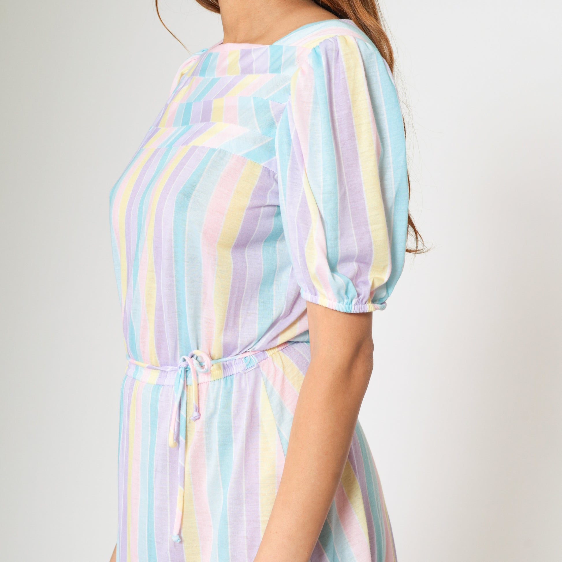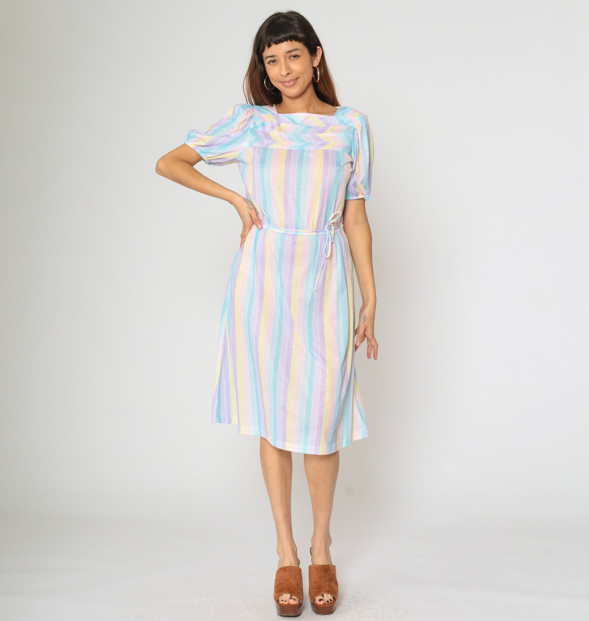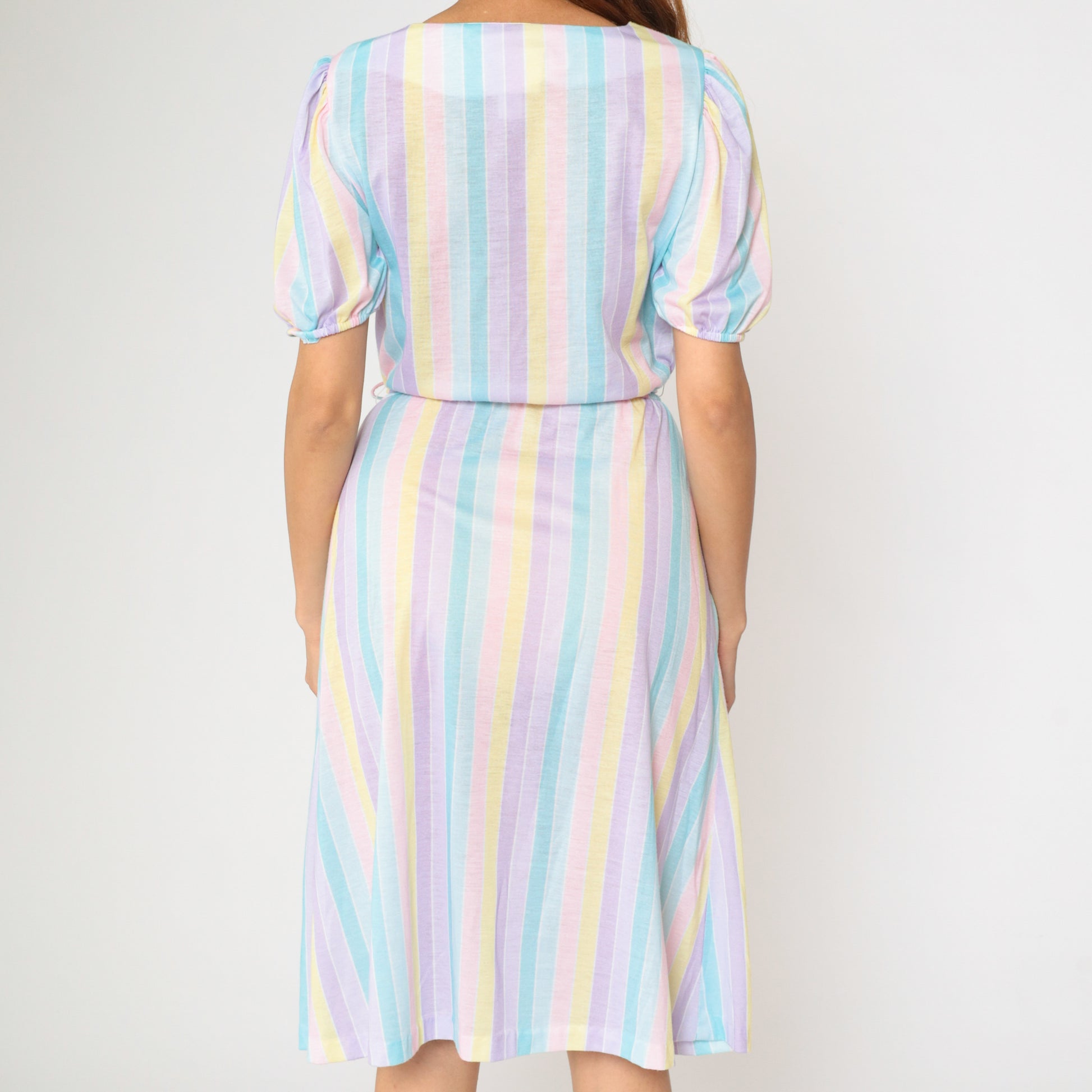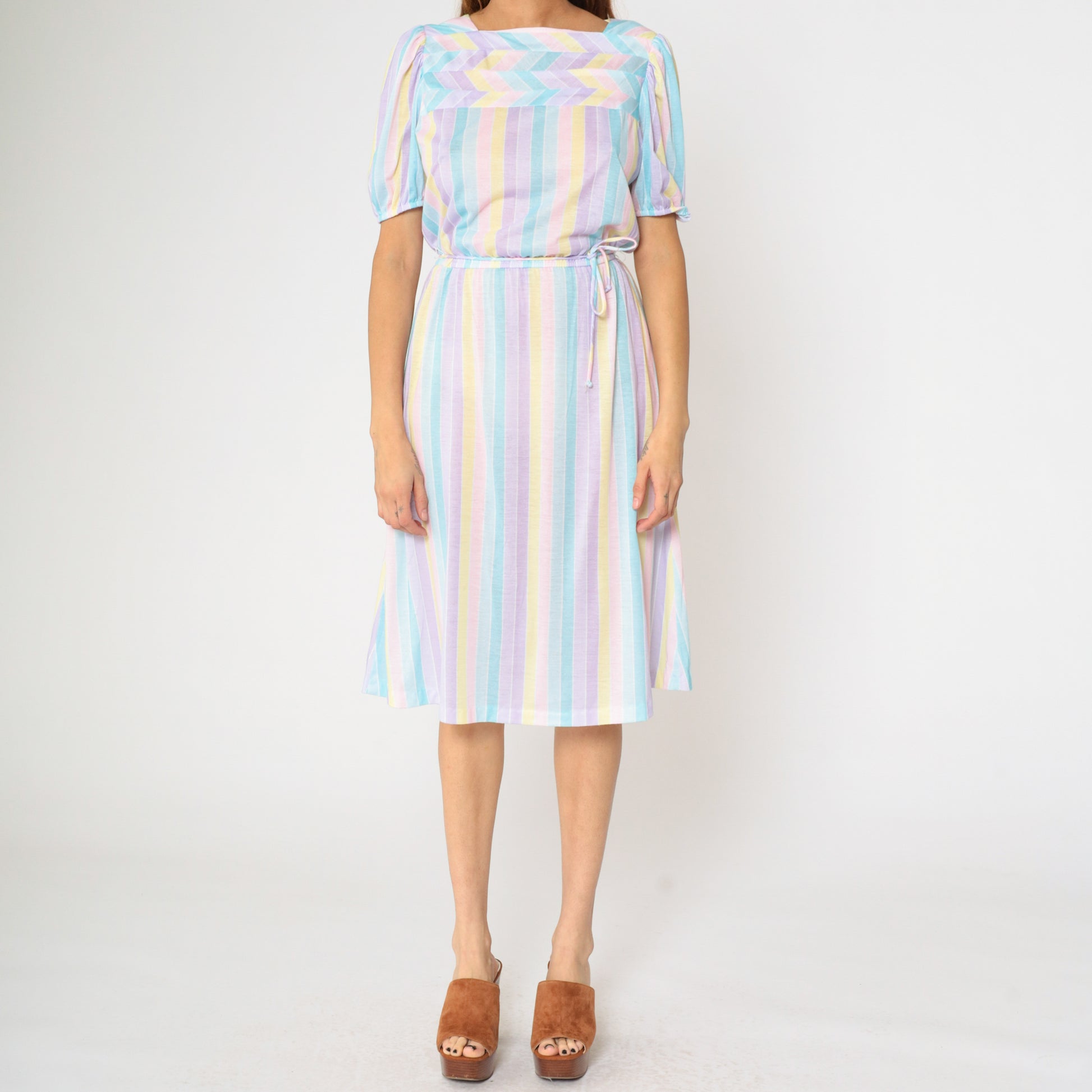 Vintage 80s dress with pastel stripes. It features an elastic waist with a tie belt, and short puff sleeves. Midi length.