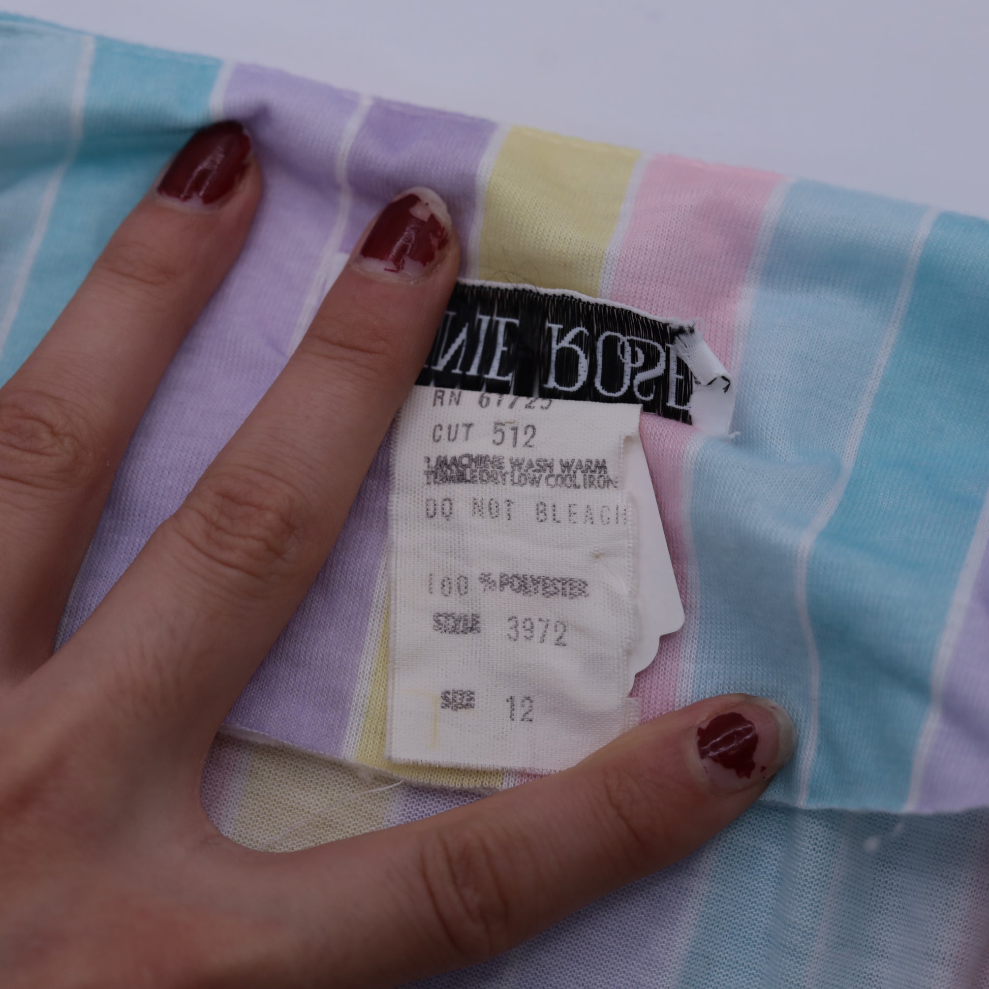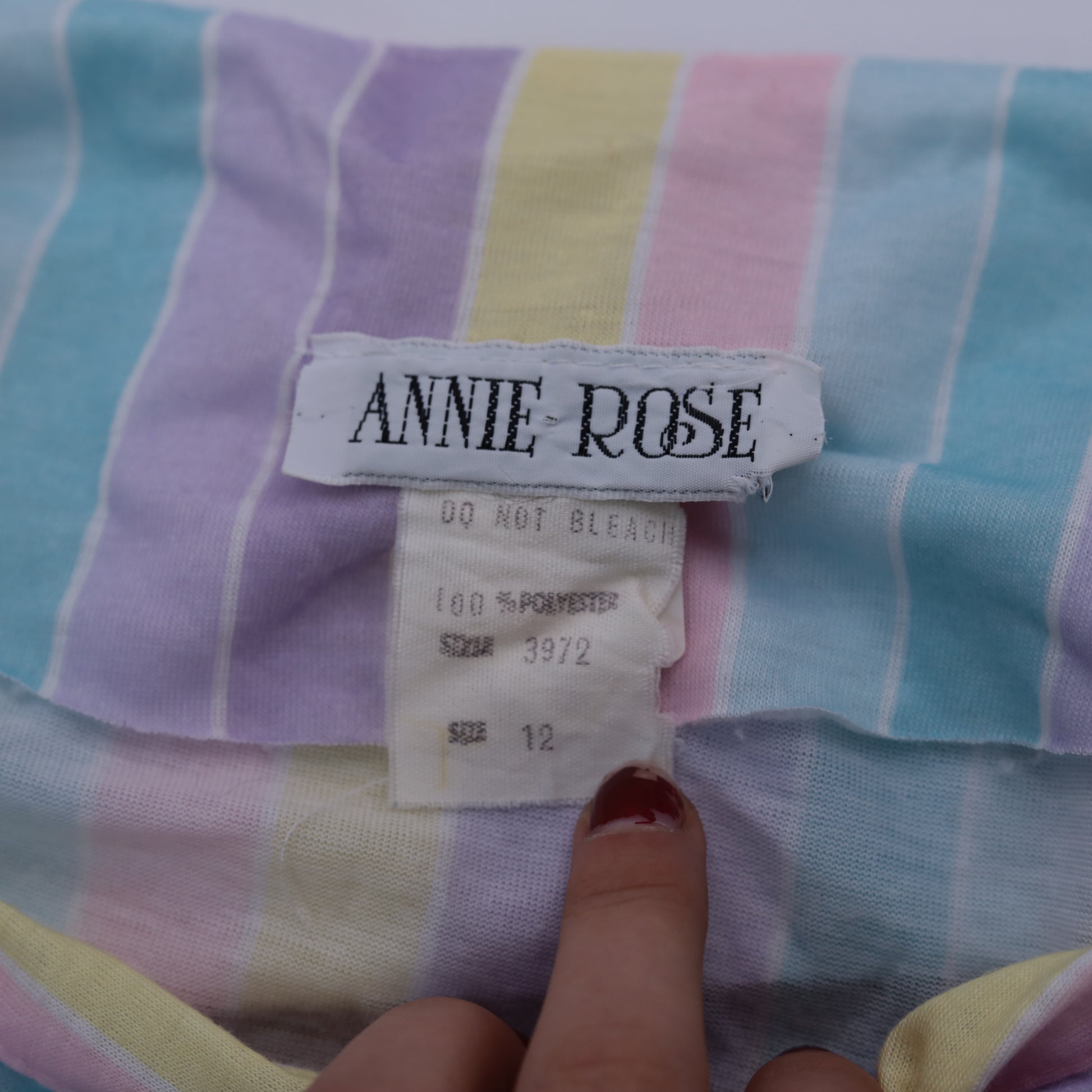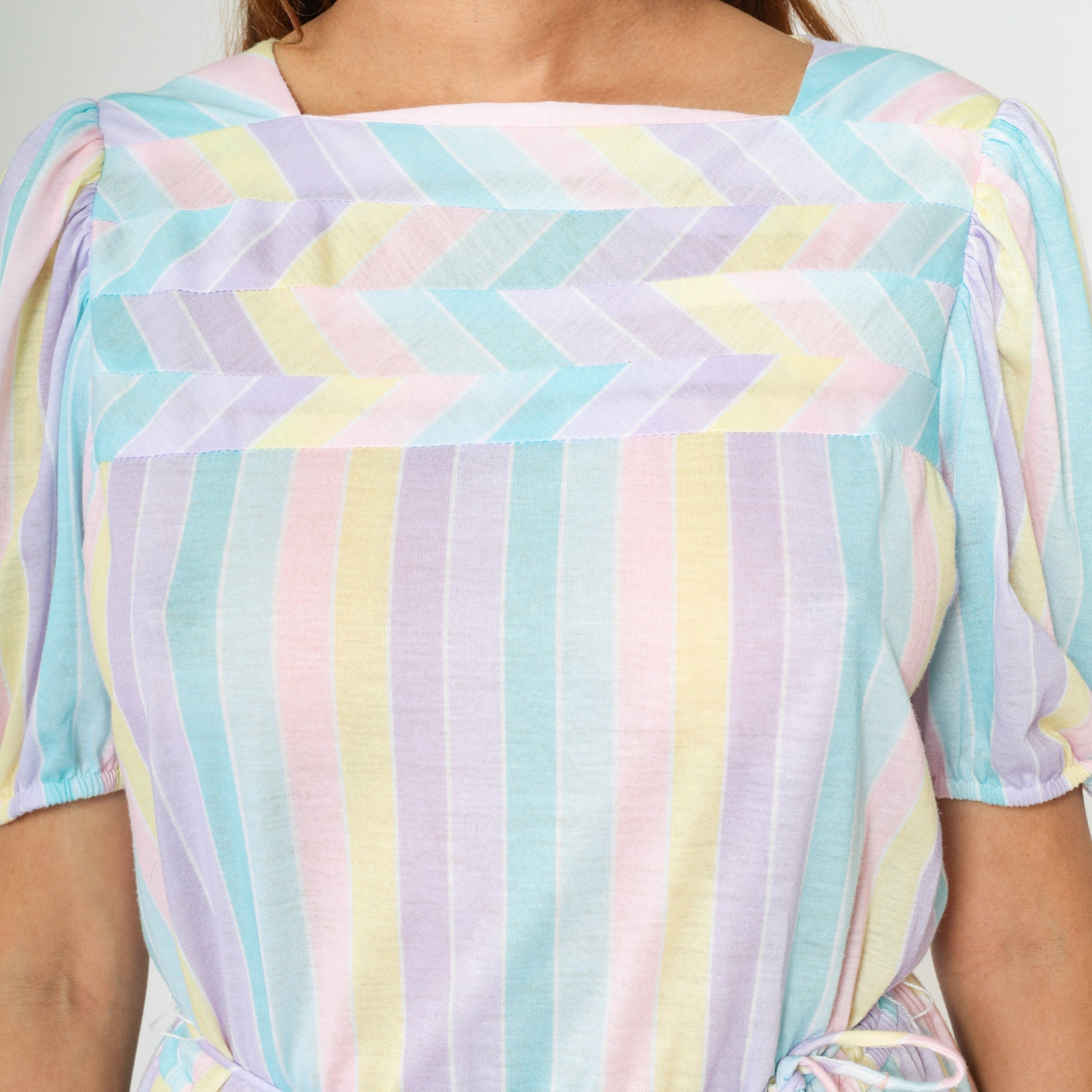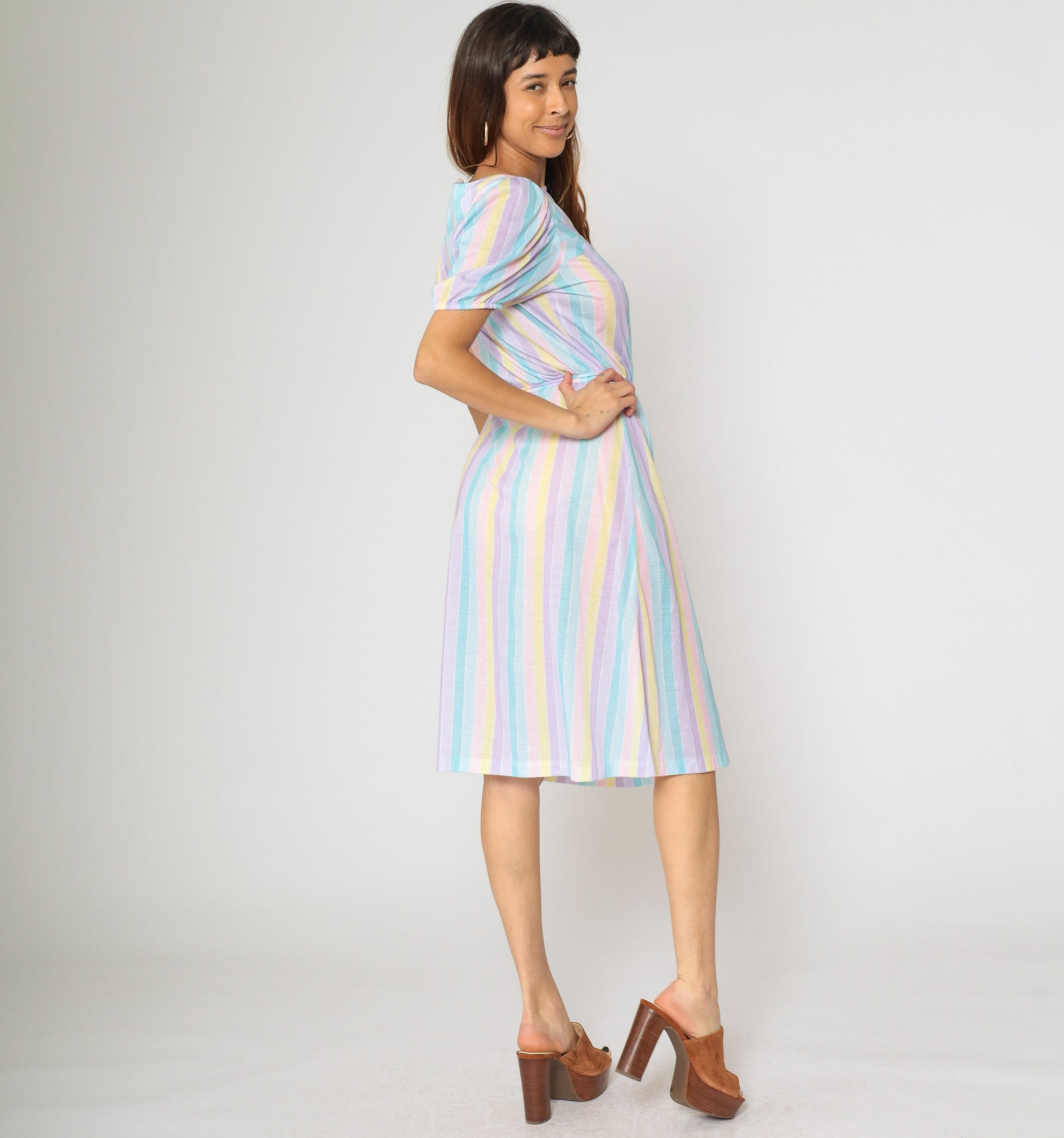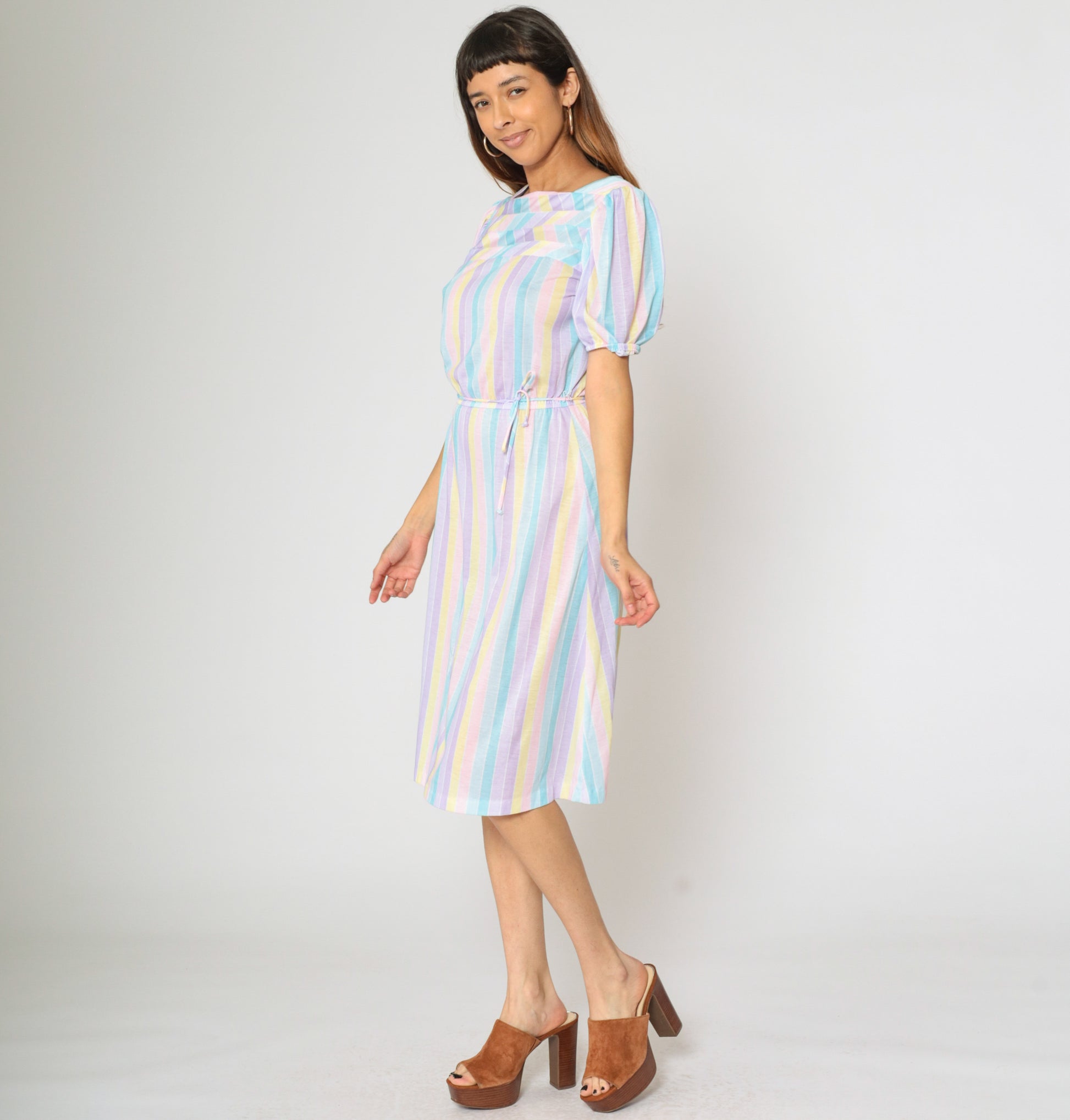 Vintage 80s dress with pastel stripes. It features an elastic waist with a tie belt, and short puff sleeves. Midi length.