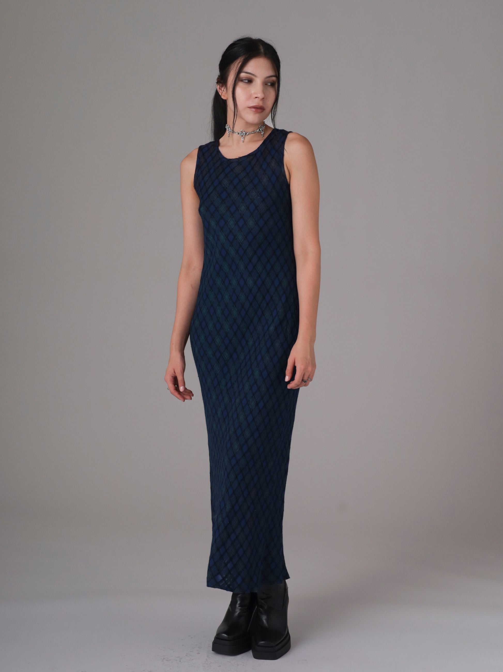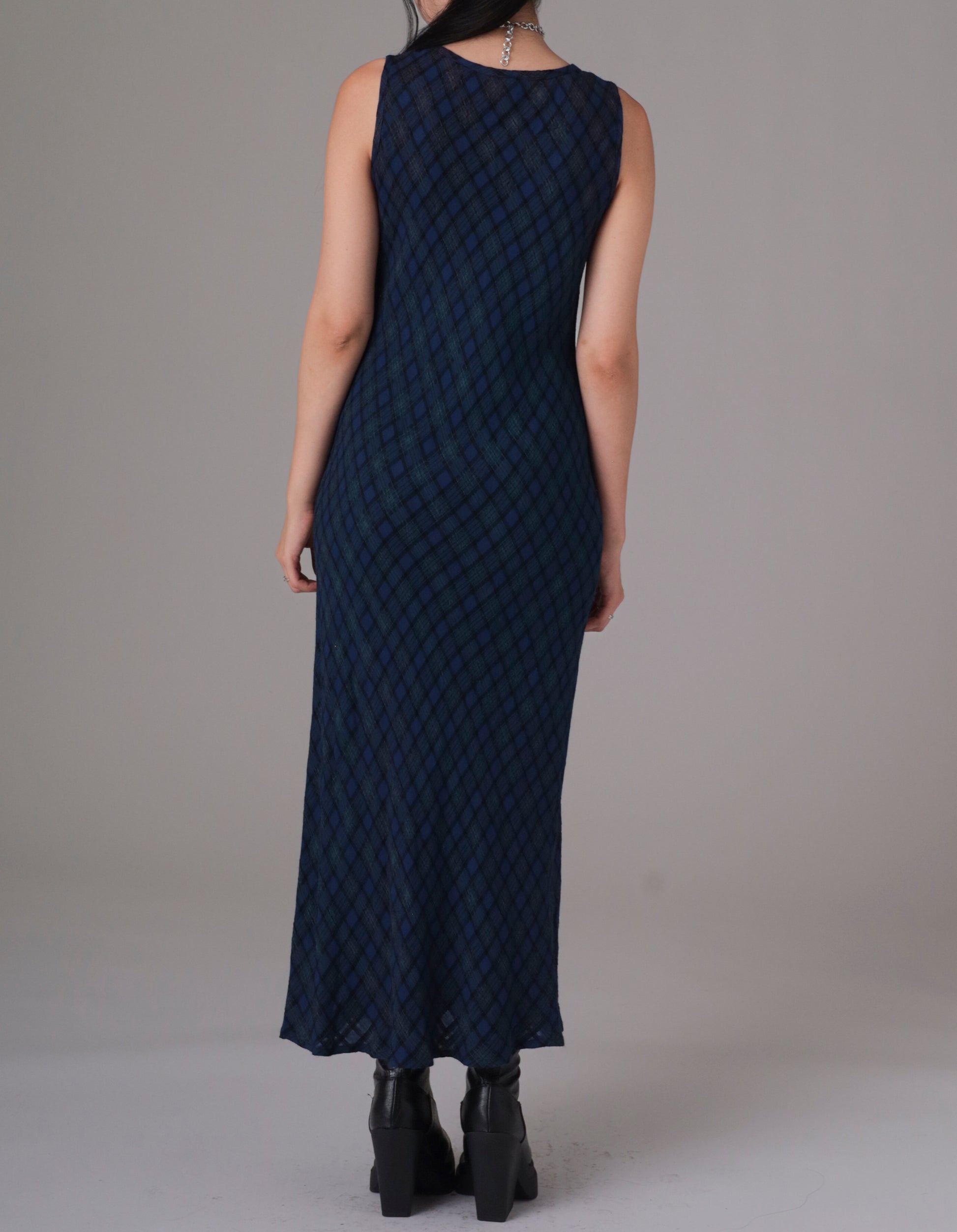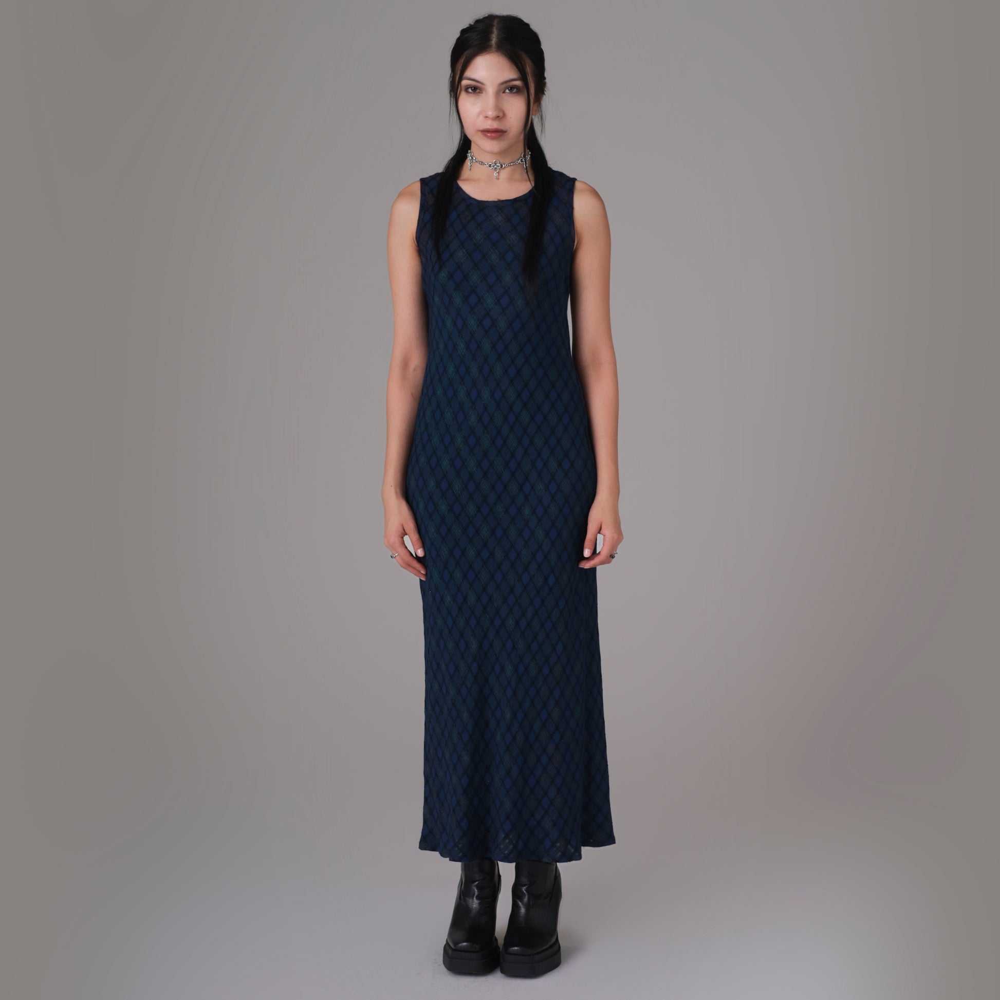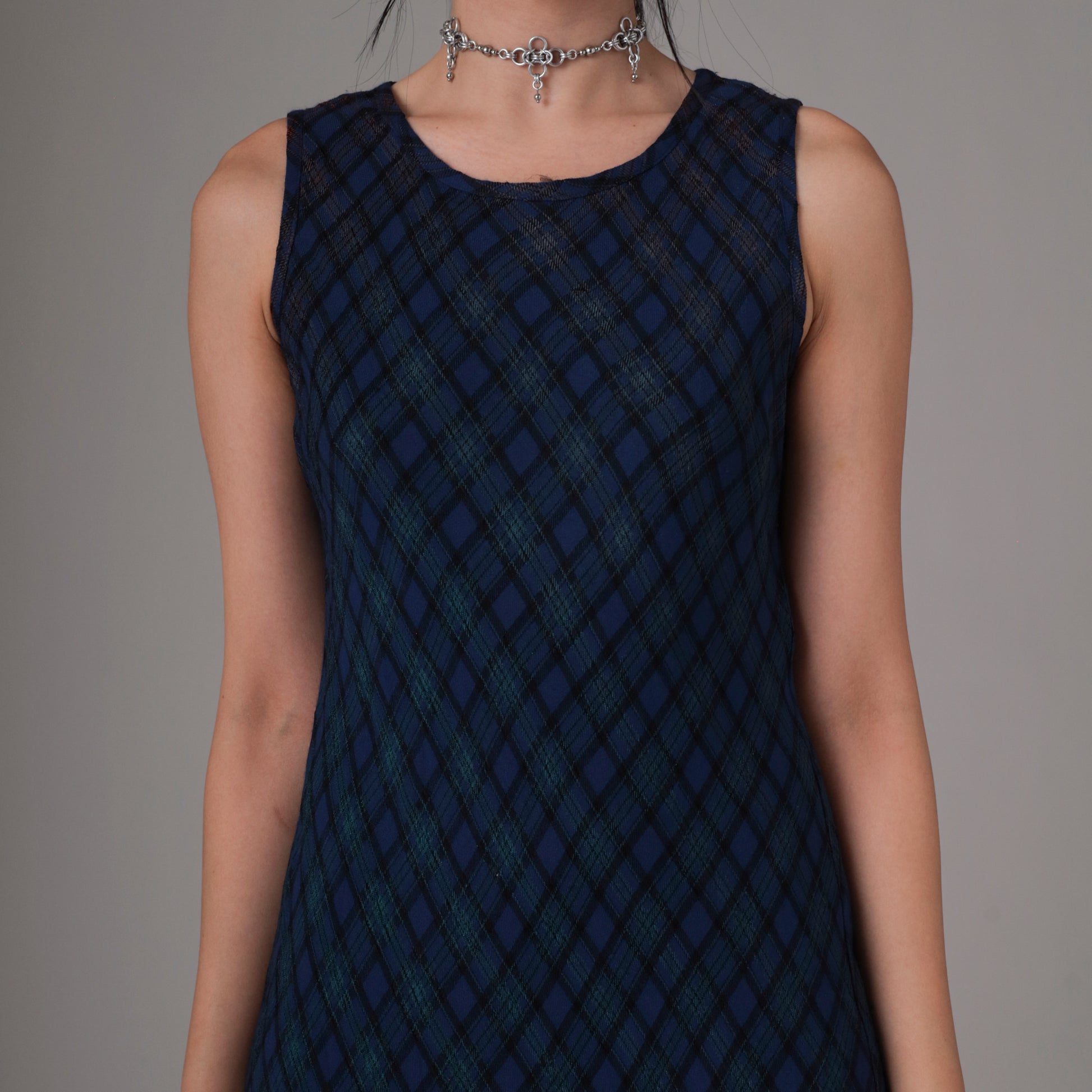 Vintage 90s dress in a black and blue checkered print. Sleeveless.