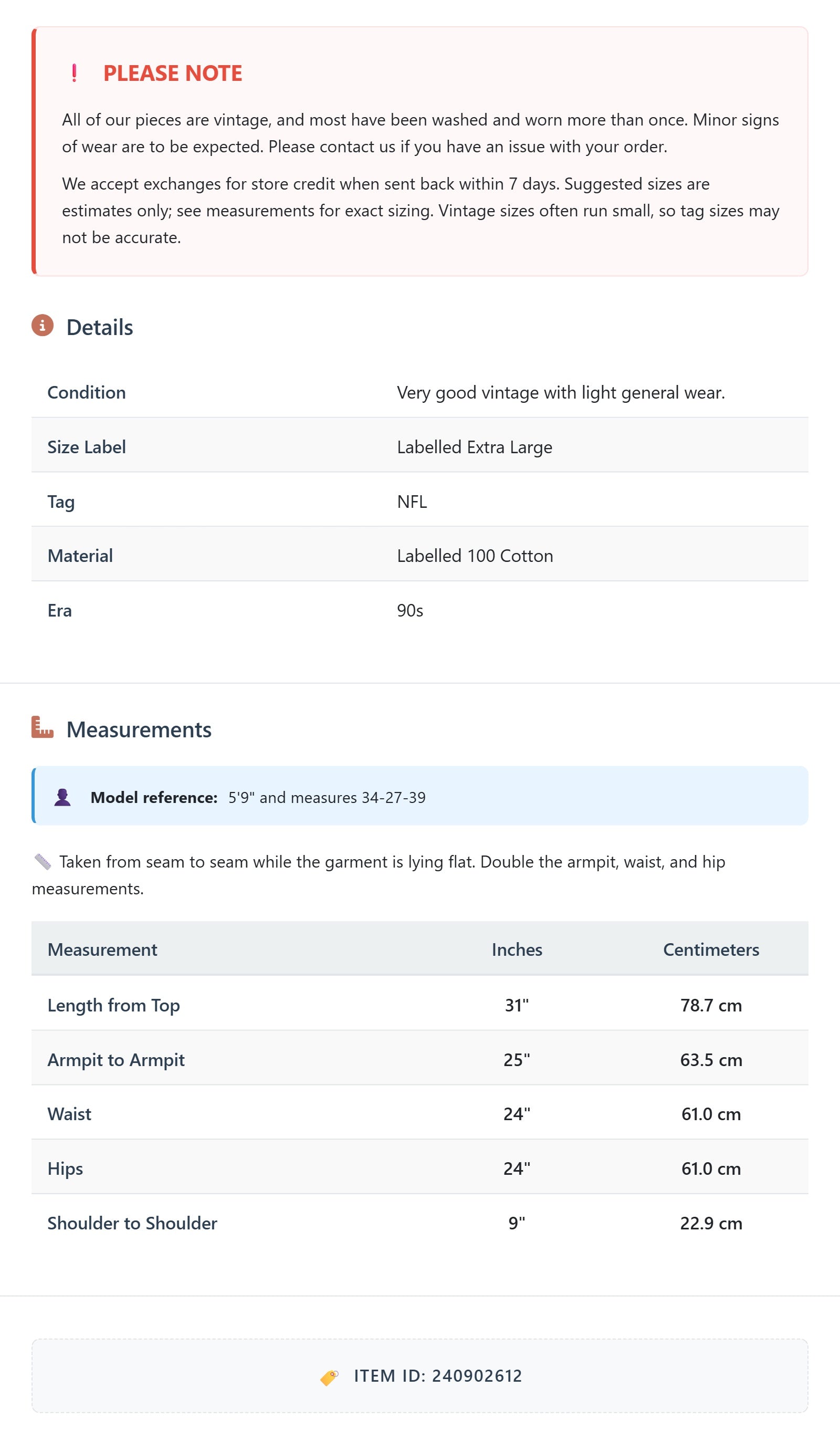 All of our pieces are vintage, and most have been washed and worn more than once. Minor signs of wear are to be expected. Please contact us if you have an issue with your order. We accept exchanges for store credit when sent back within 7 days.