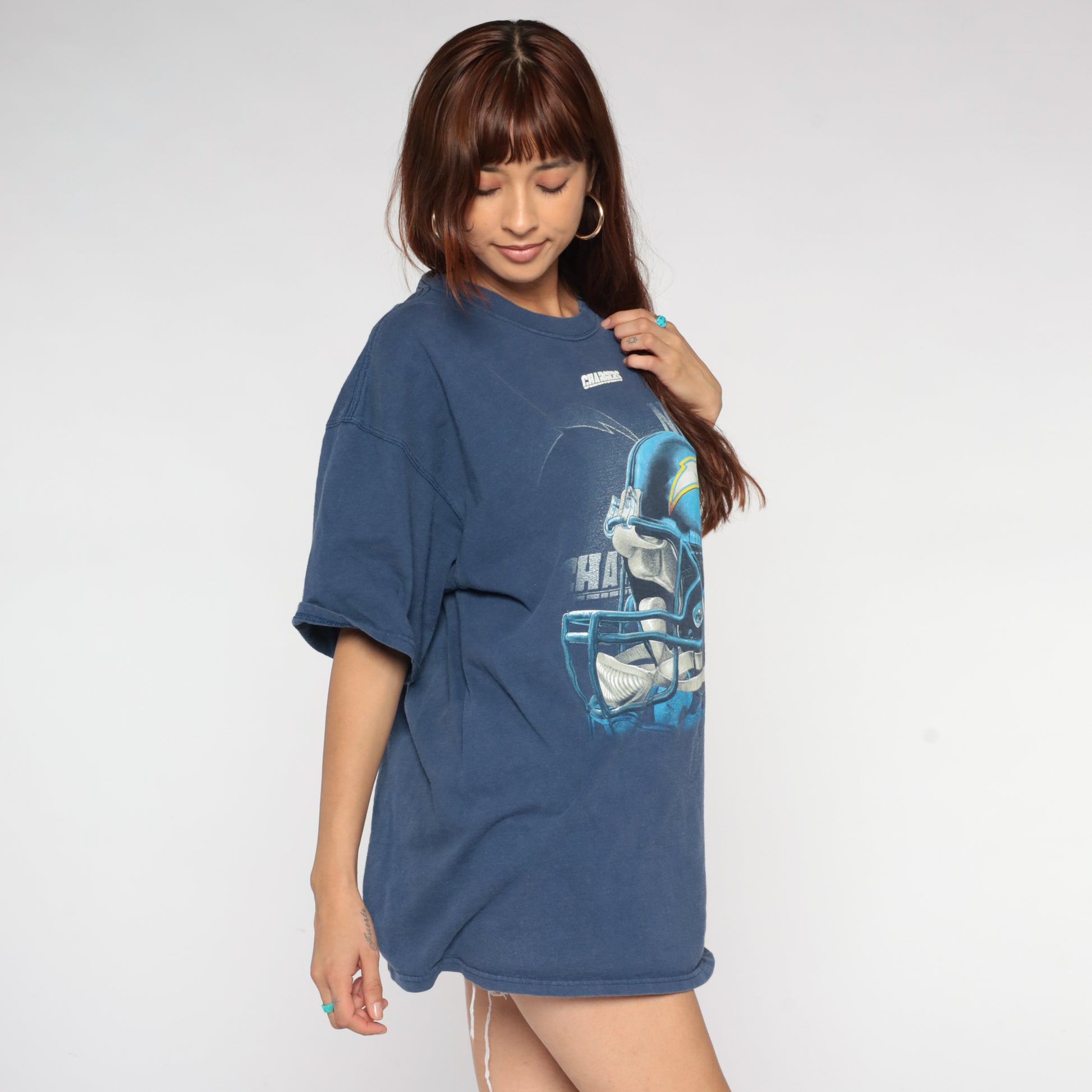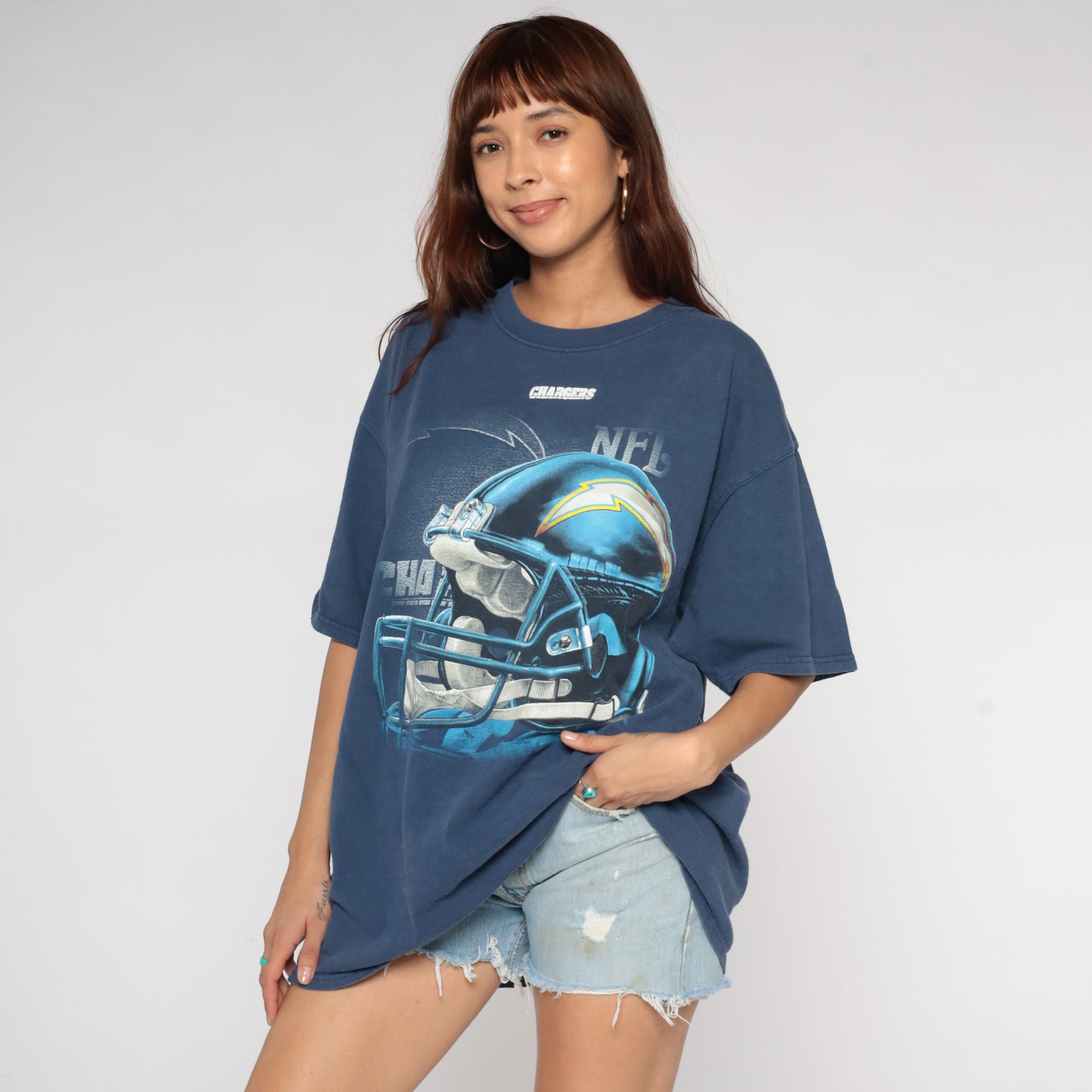 Vintage 90s NFL Chargers t-shirt featuring a bold helmet graphic on the front with "CHARGERS" text and NFL branding. Oversized fit with crew neckline and short sleeves in a faded navy blue color.