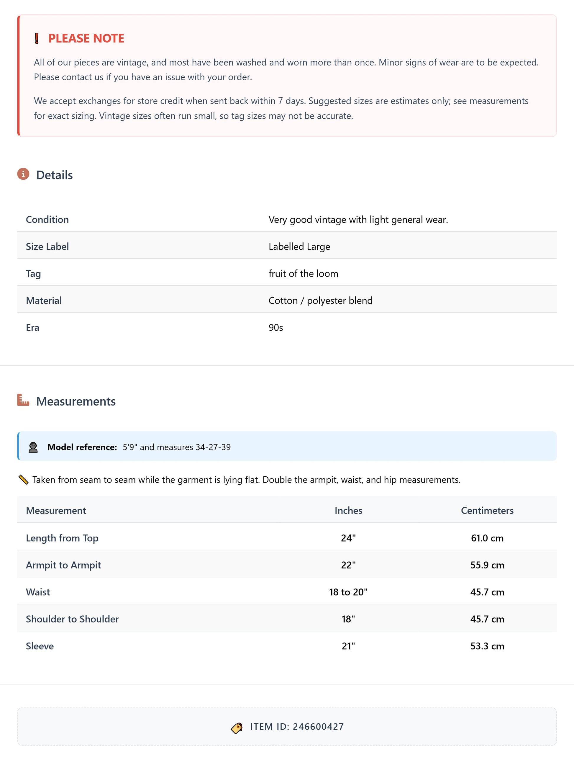 All of our pieces are vintage, and most have been washed and worn more than once. Minor signs of wear are to be expected. Please contact us if you have an issue with your order. We accept exchanges for store credit when sent back within 7 days.
