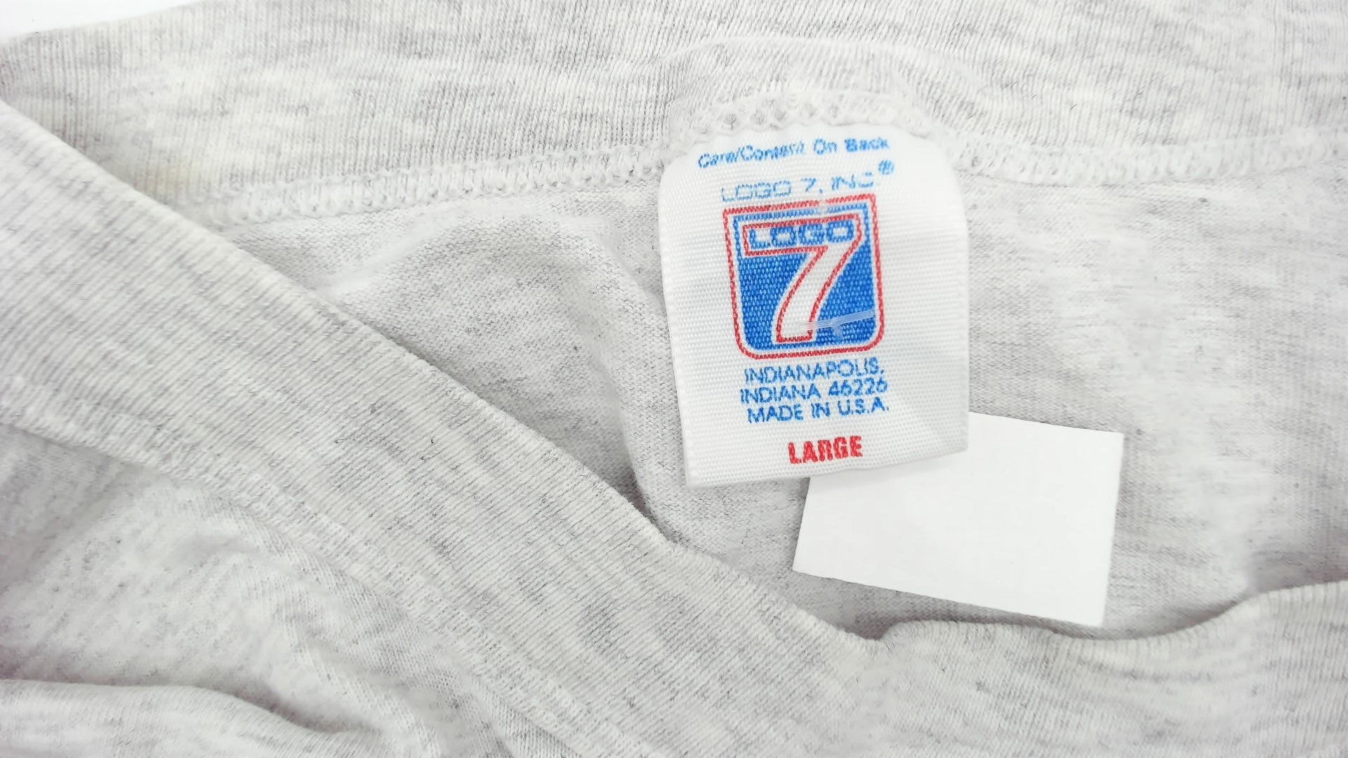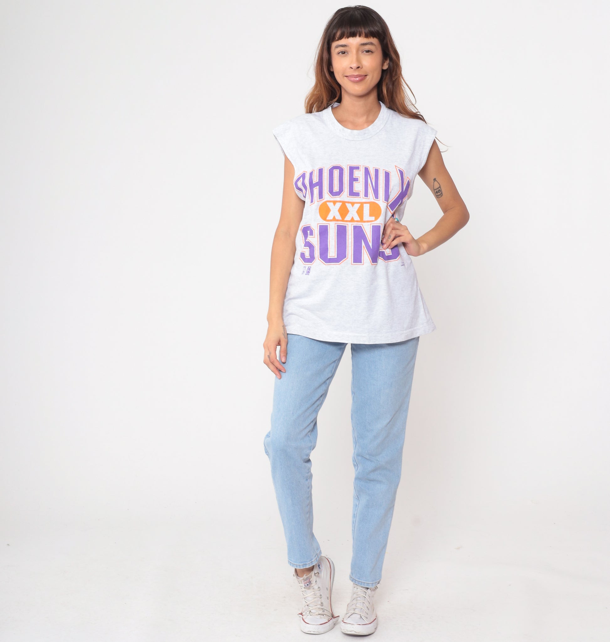 90s Phoenix Suns sleeveless t-shirt from Logo 7 in heather gray with purple and orange lettering. "XXL" printed across the center, team name arched above and below.
