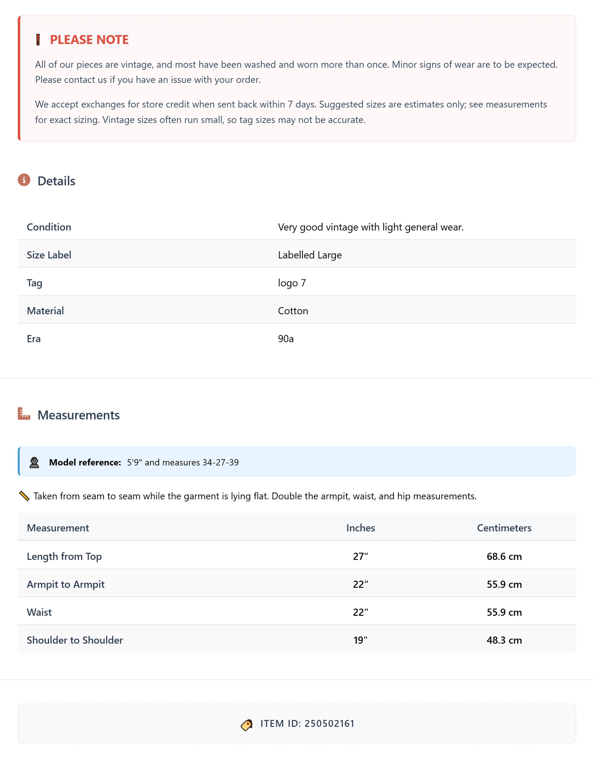 All of our pieces are vintage, and most have been washed and worn more than once. Minor signs of wear are to be expected. Please contact us if you have an issue with your order. We accept exchanges for store credit when sent back within 7 days.