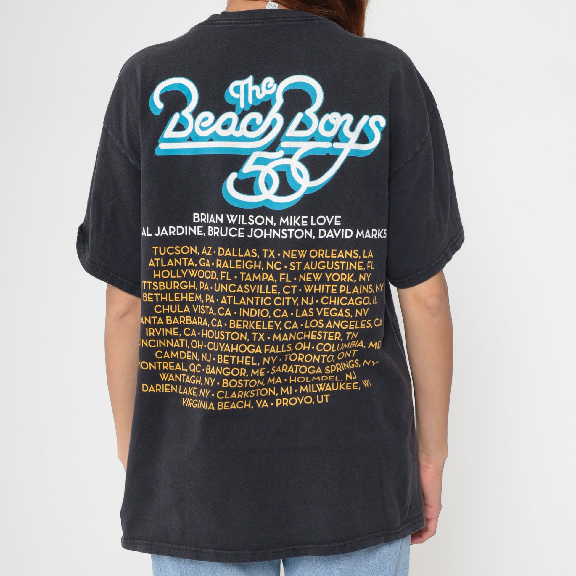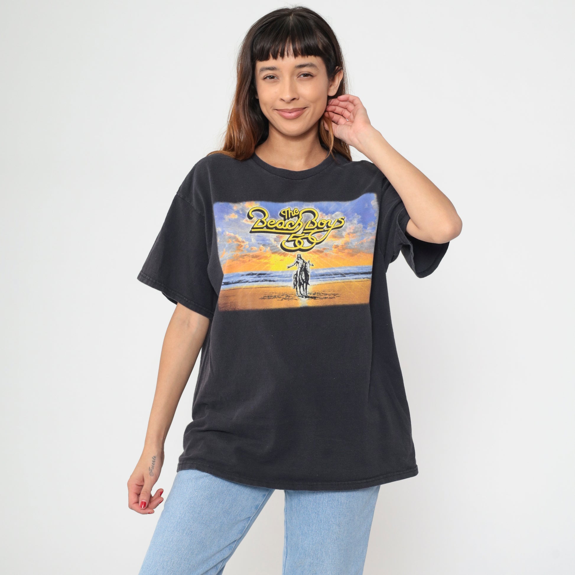 Y2K black The Beach Boys band t-shirt from delta with sunset beach scene and horseback rider graphic on front, band logo in yellow and gold lettering above. Back features band member names and tour dates across multiple cities in yellow and gold text.