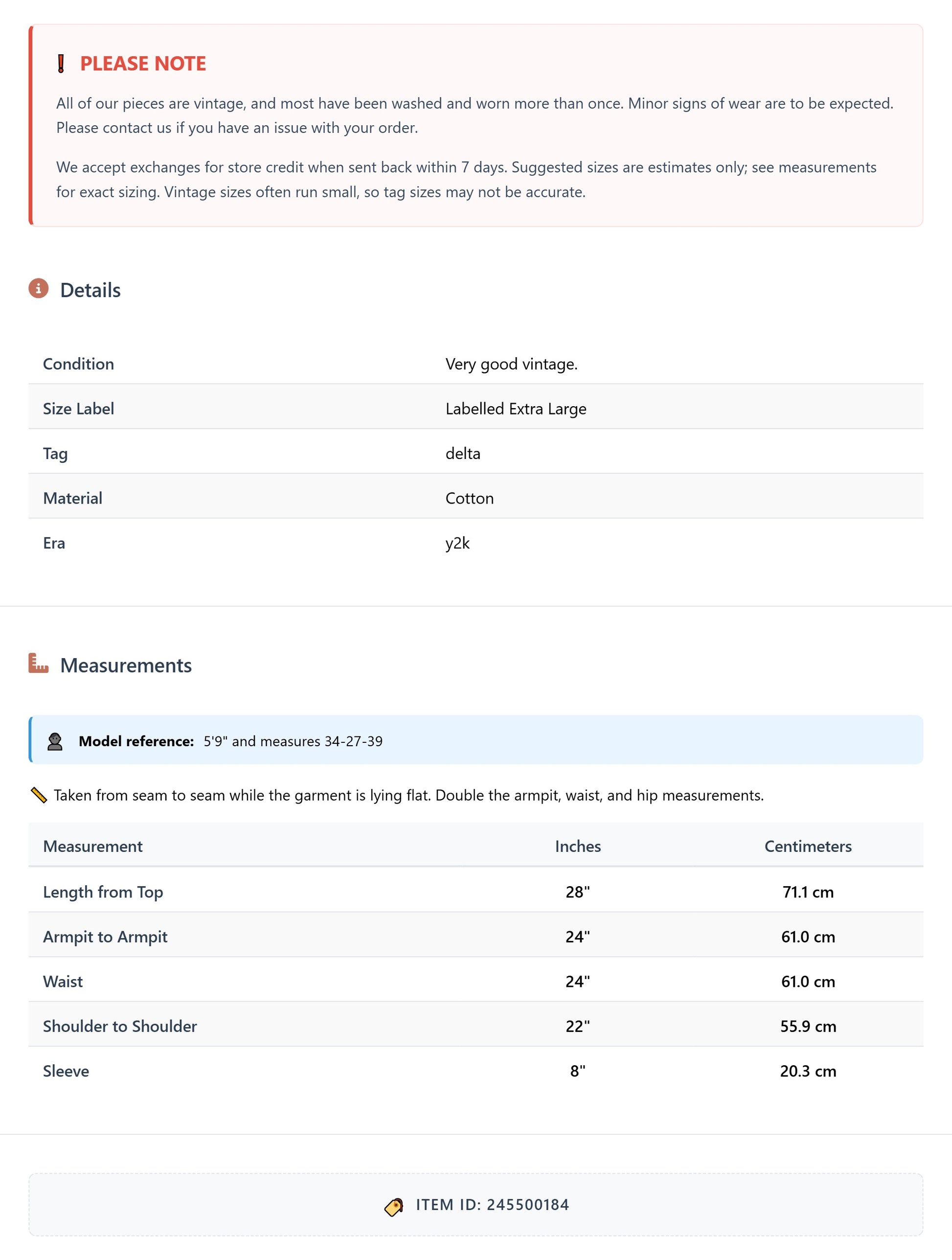 All of our pieces are vintage, and most have been washed and worn more than once. Minor signs of wear are to be expected. Please contact us if you have an issue with your order. We accept exchanges for store credit when sent back within 7 days.