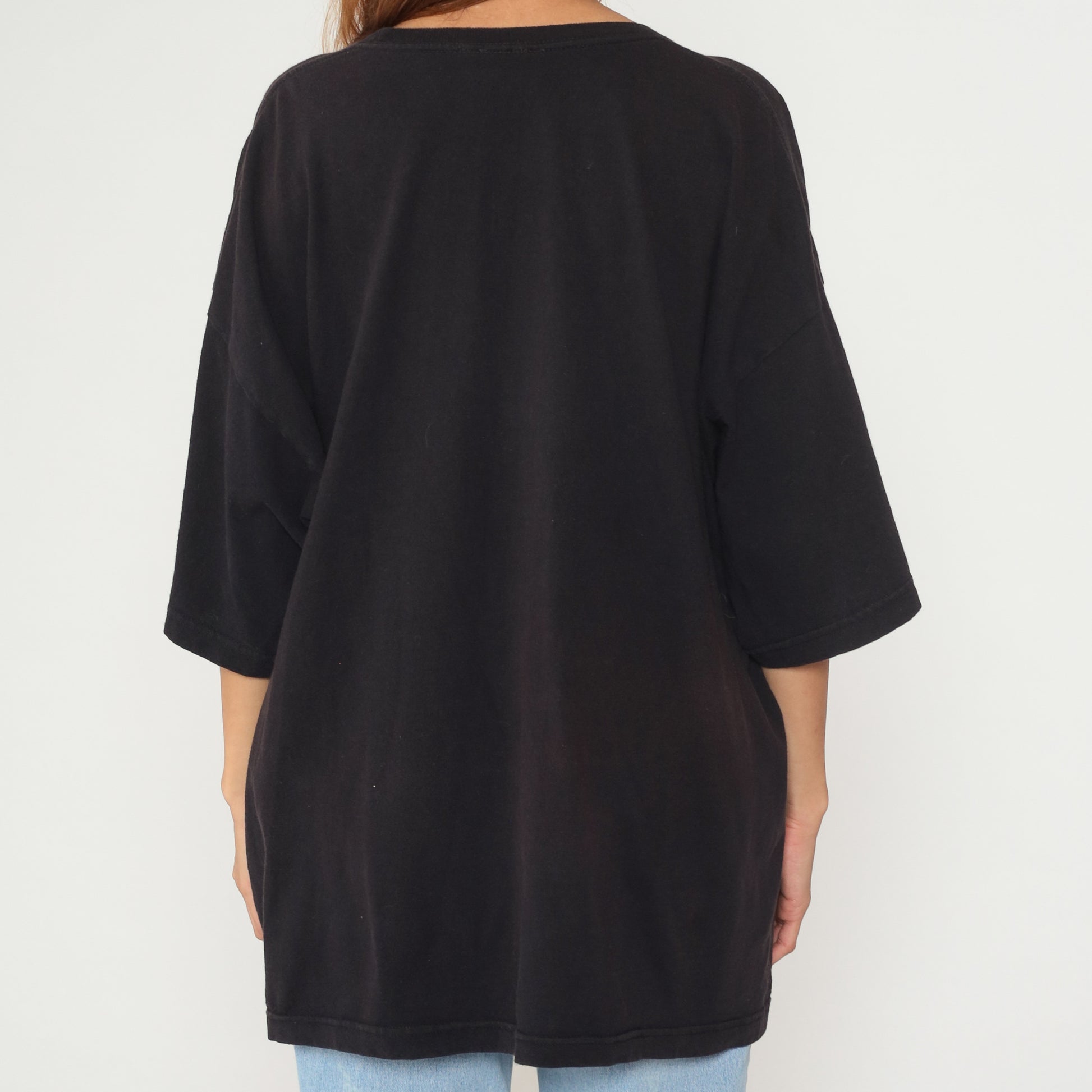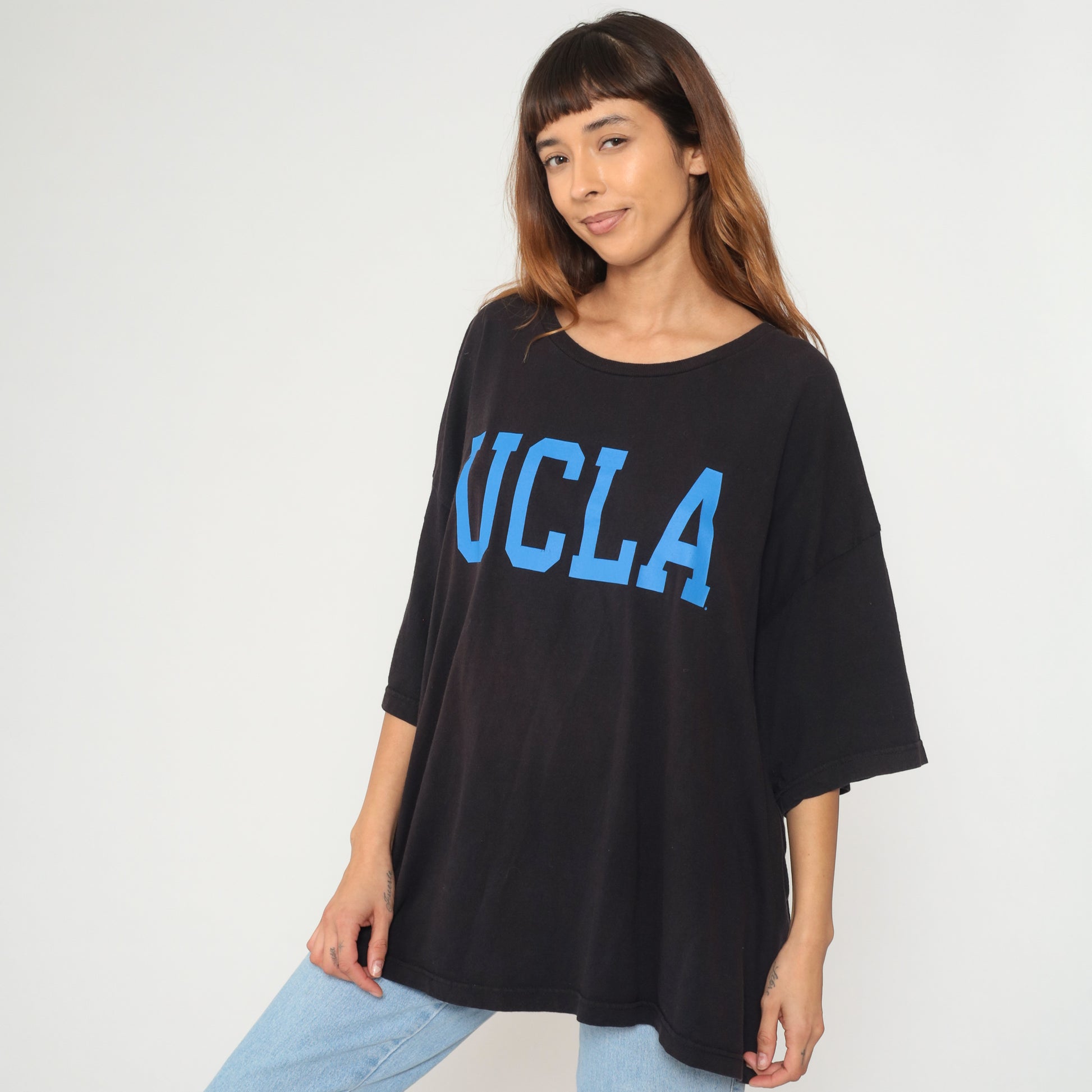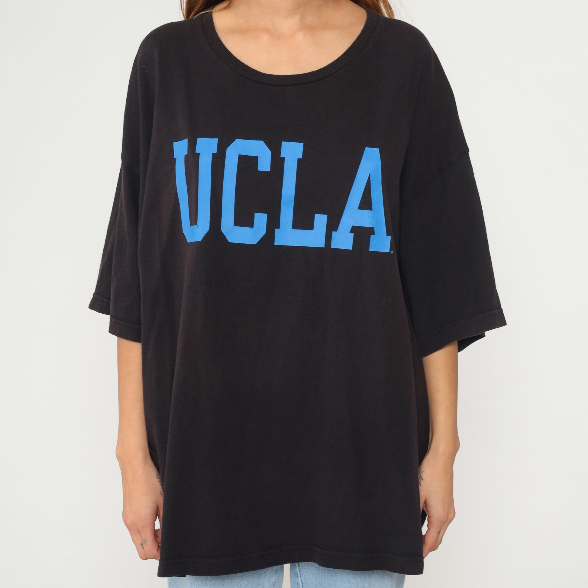 Y2K black oversized t-shirt with UCLA in large blue letters across the front. Short sleeves and round neckline in a relaxed, boxy silhouette.