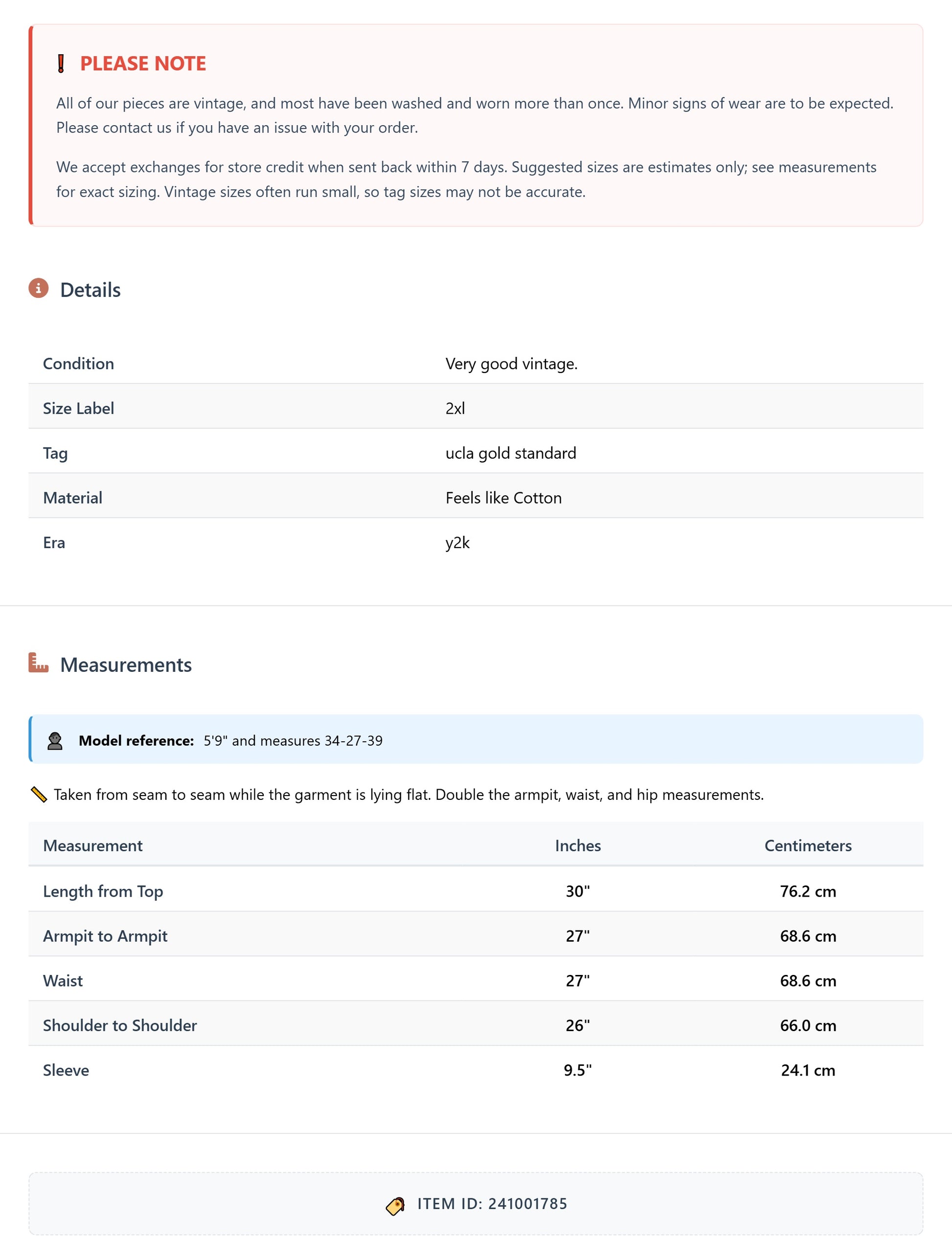 All of our pieces are vintage, and most have been washed and worn more than once. Minor signs of wear are to be expected. Please contact us if you have an issue with your order. We accept exchanges for store credit when sent back within 7 days.