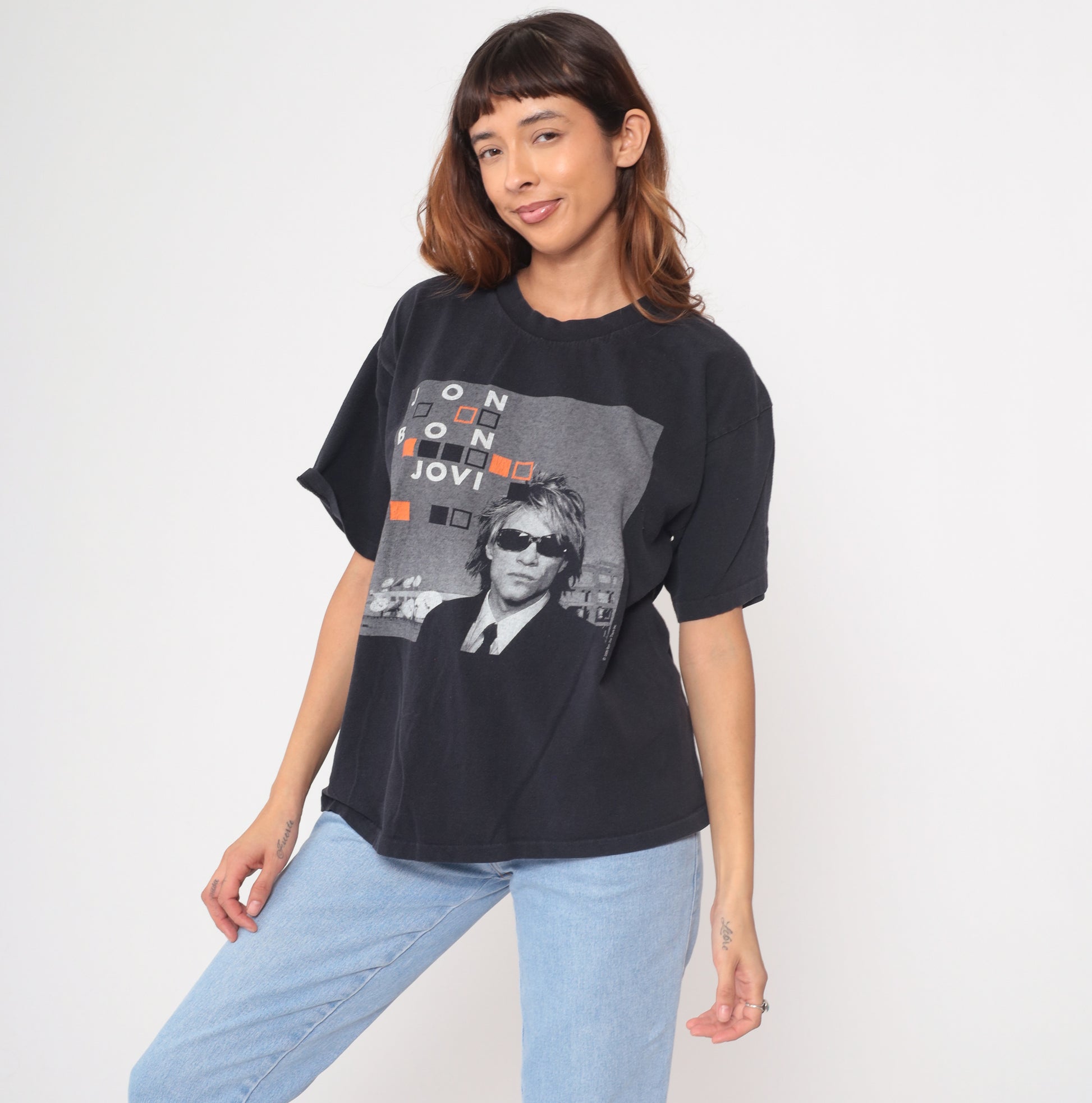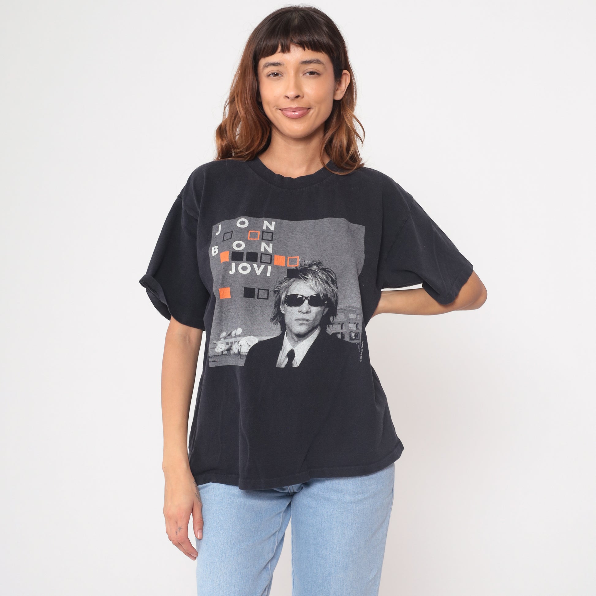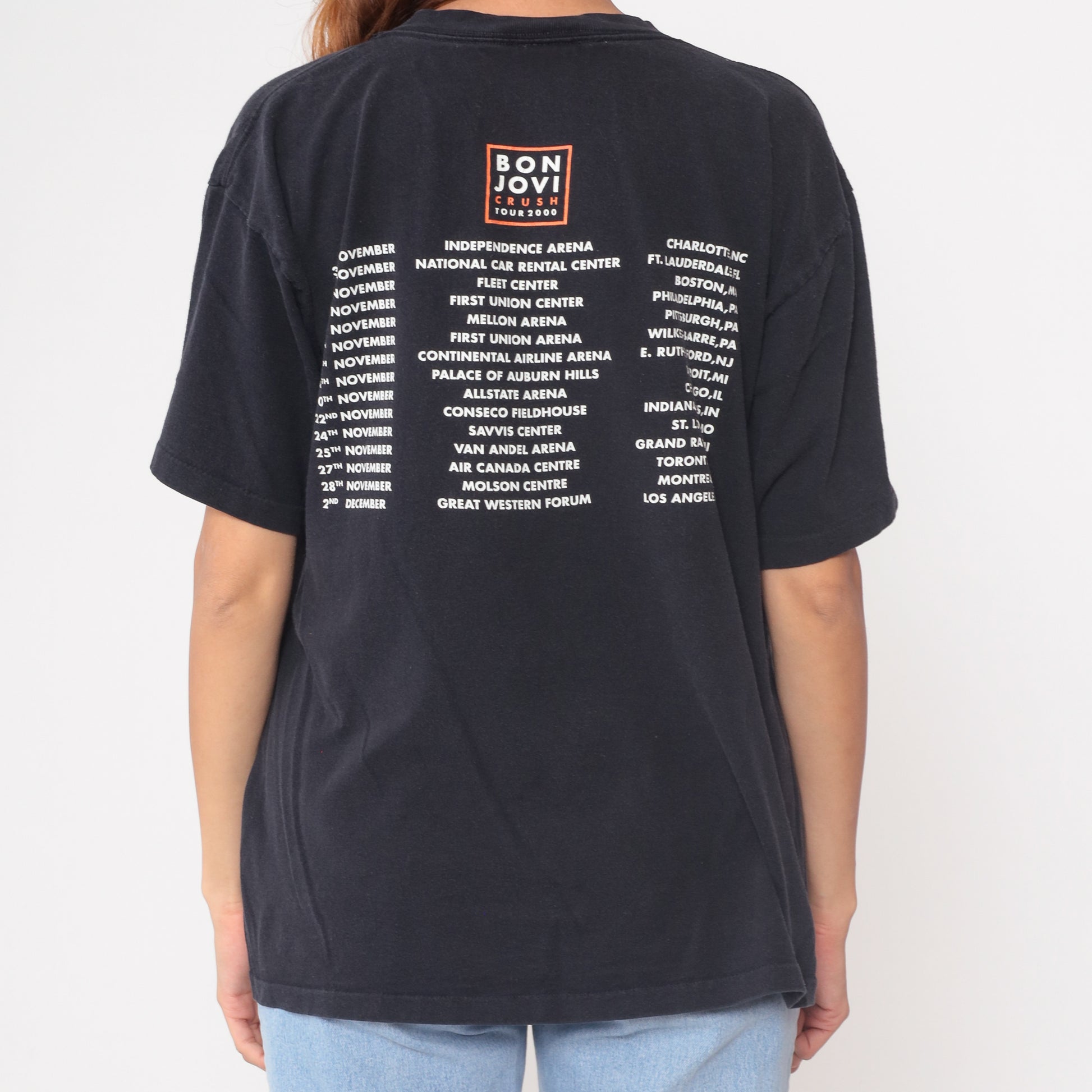 Y2K Bon Jovi Crush Tour 2000 shirt in black cotton with tour dates across the back listing venues including Independence Arena, Mellon Arena, Continental Airlines Arena, and Air Canada Centre. Front features Jon Bon Jovi photo with geometric square design in orange and gray.