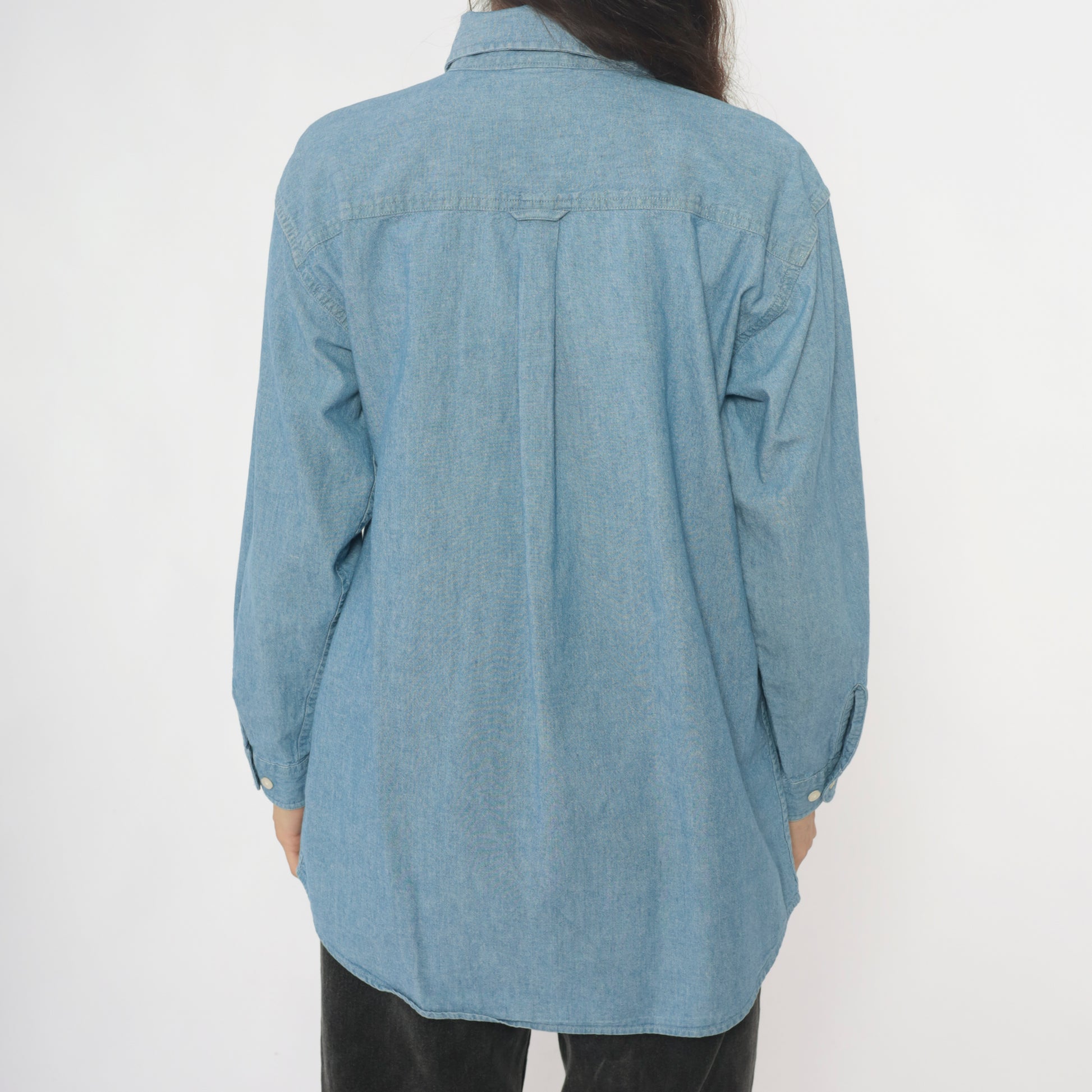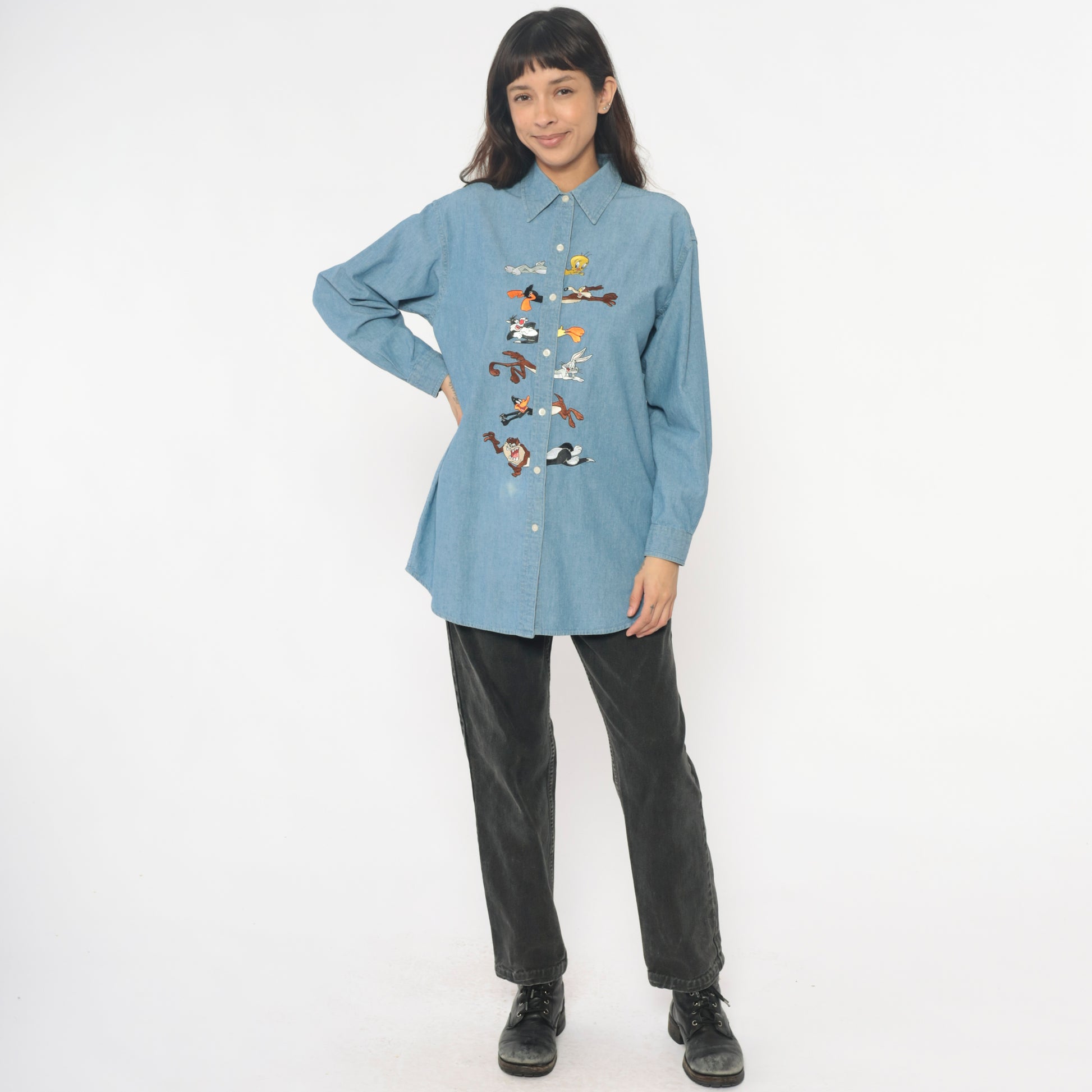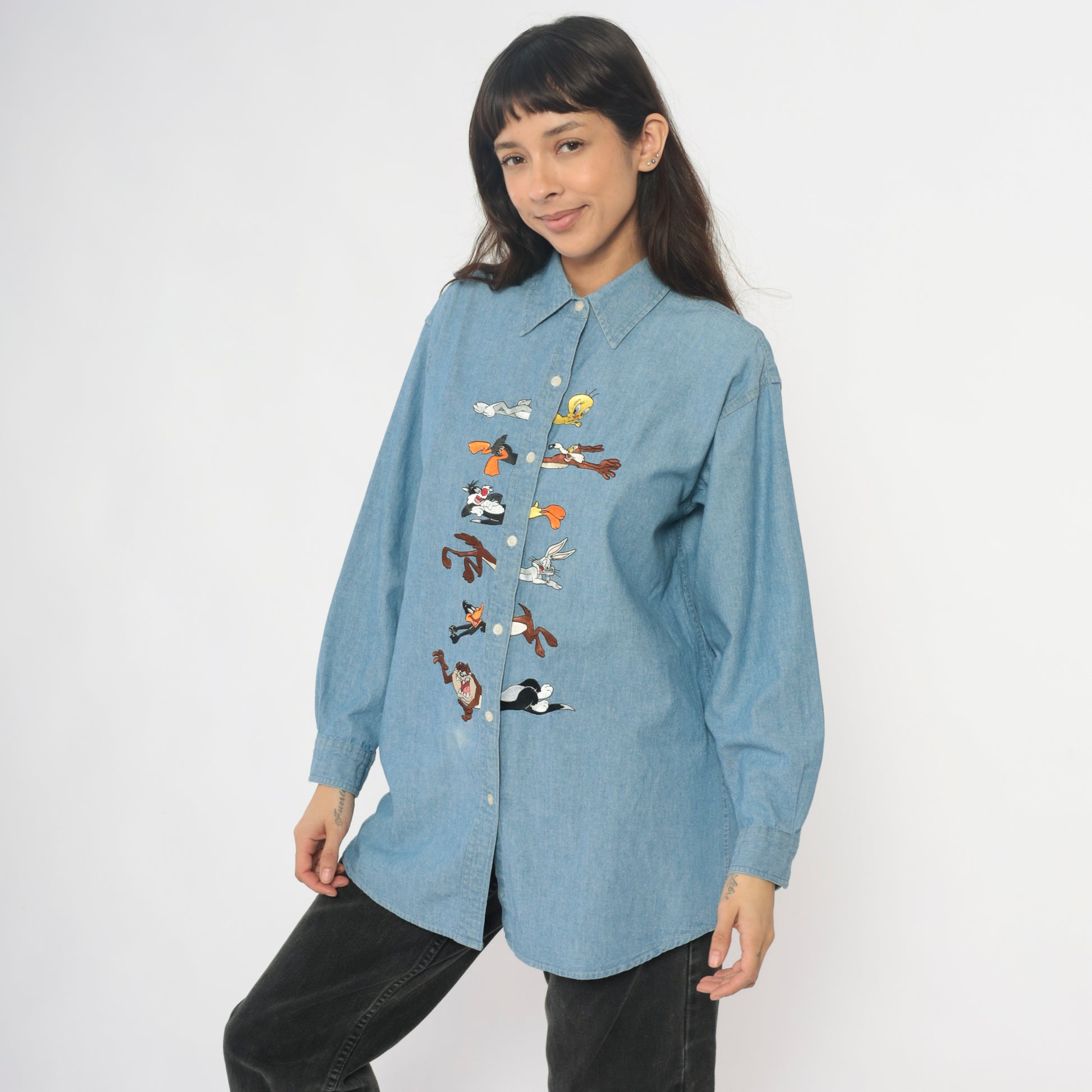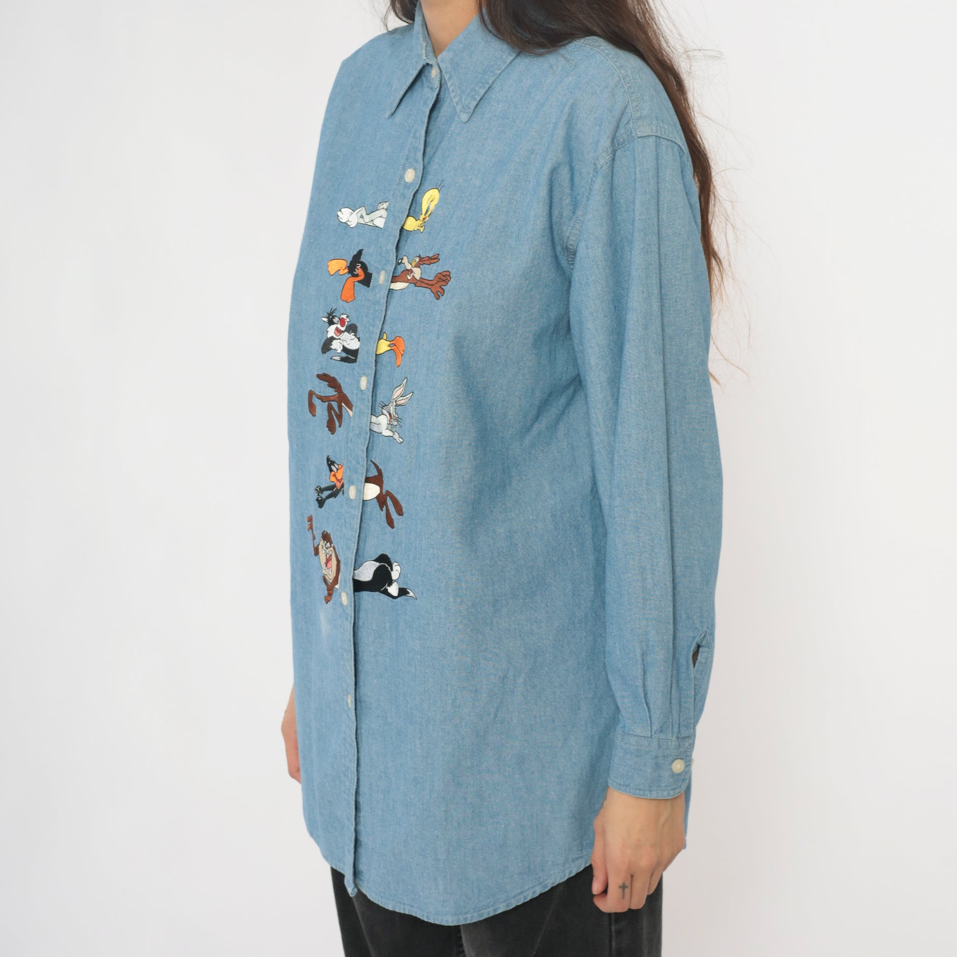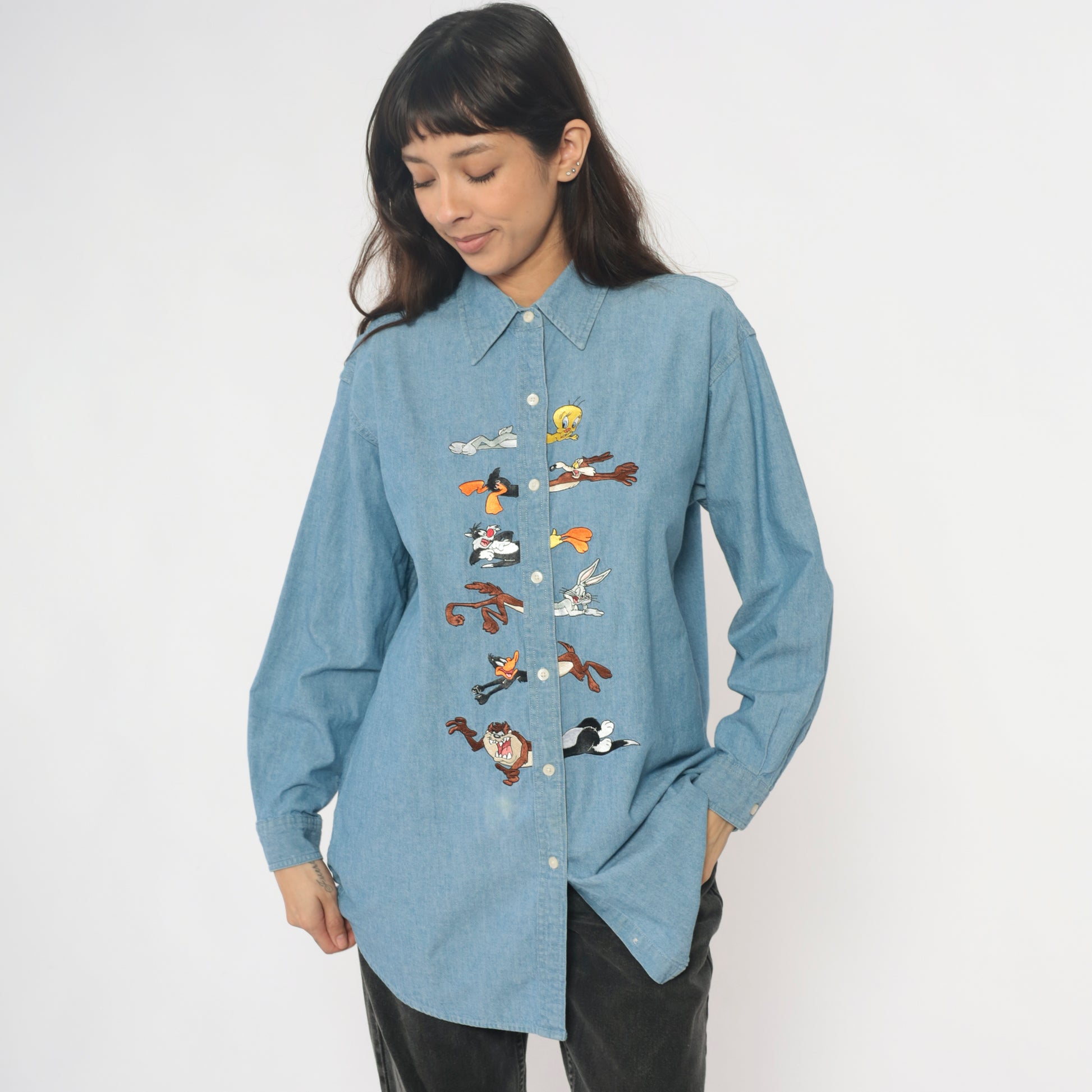 Looney Tunes Shirt Y2K Warner Bros Chambray Blue Denim Embroidered Cartoon Character Cotton Vintage Tweety Bugs Bunny Sylvester Taz Medium M