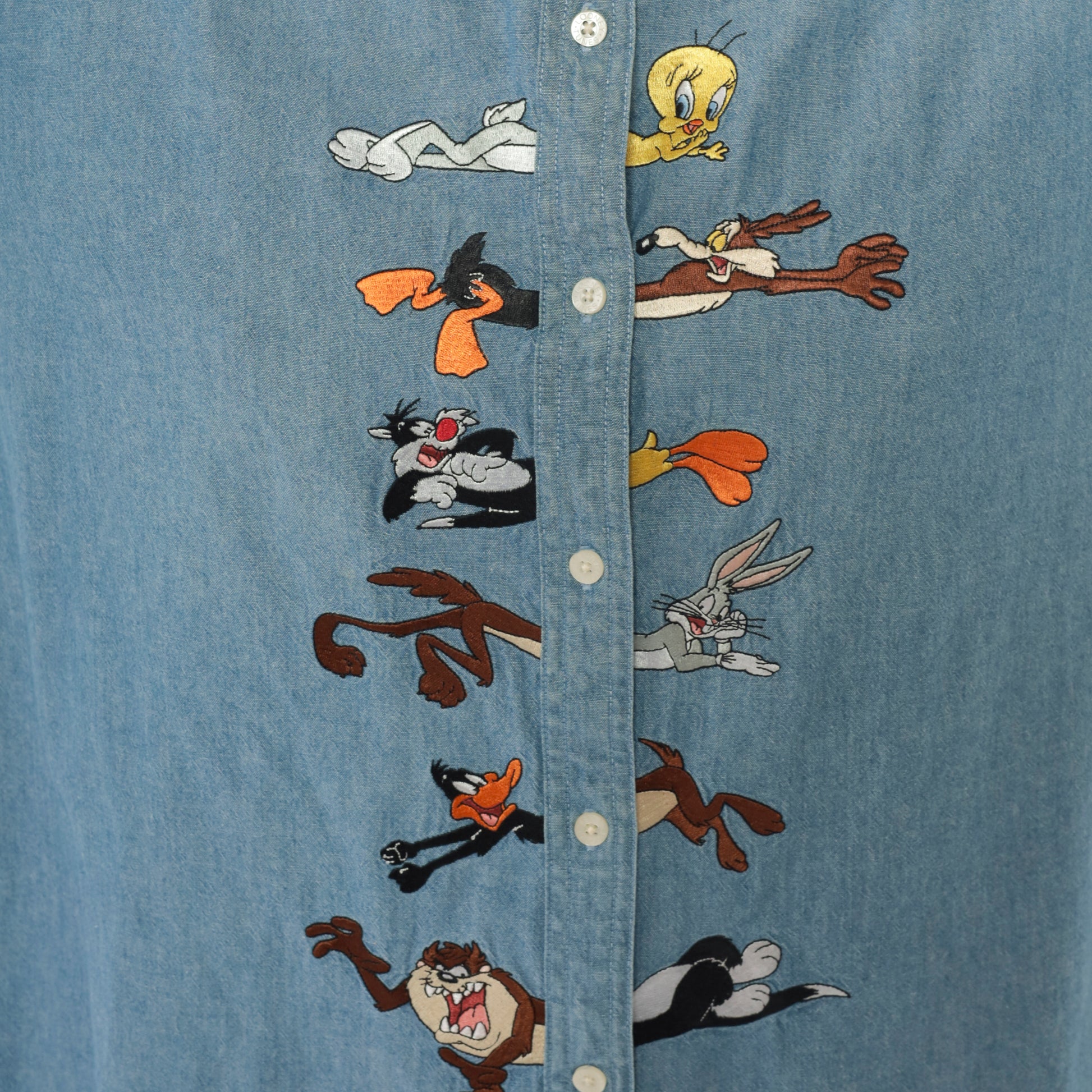 Y2K light blue chambray shirt from Warner Bros Studio Store with embroidered Looney Tunes characters down the front placket including Tweety Bird, Bugs Bunny, Daffy Duck, Sylvester, Taz, Wile E. Coyote, and Road Runner. Pointed collar, button front closure with white buttons, long sleeves with button cuffs.