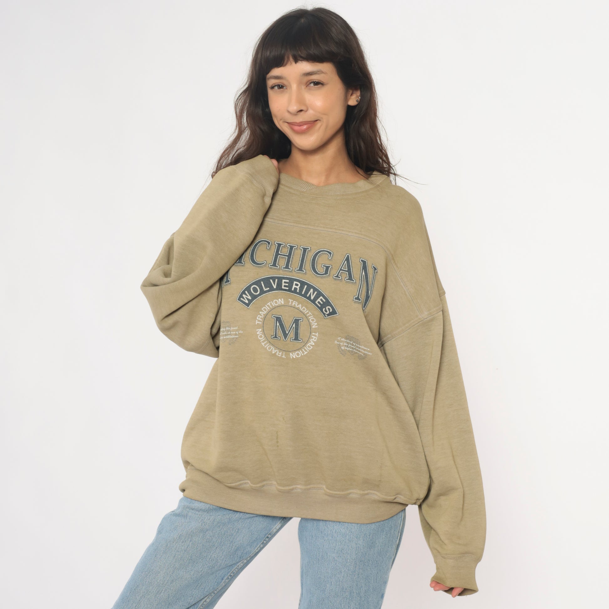 Michigan Wolverines Sweatshirt 90s College University Athletic Crewneck Beige Tan Sand Faded Graphic Cotton Vintage Pullover Extra Large XL