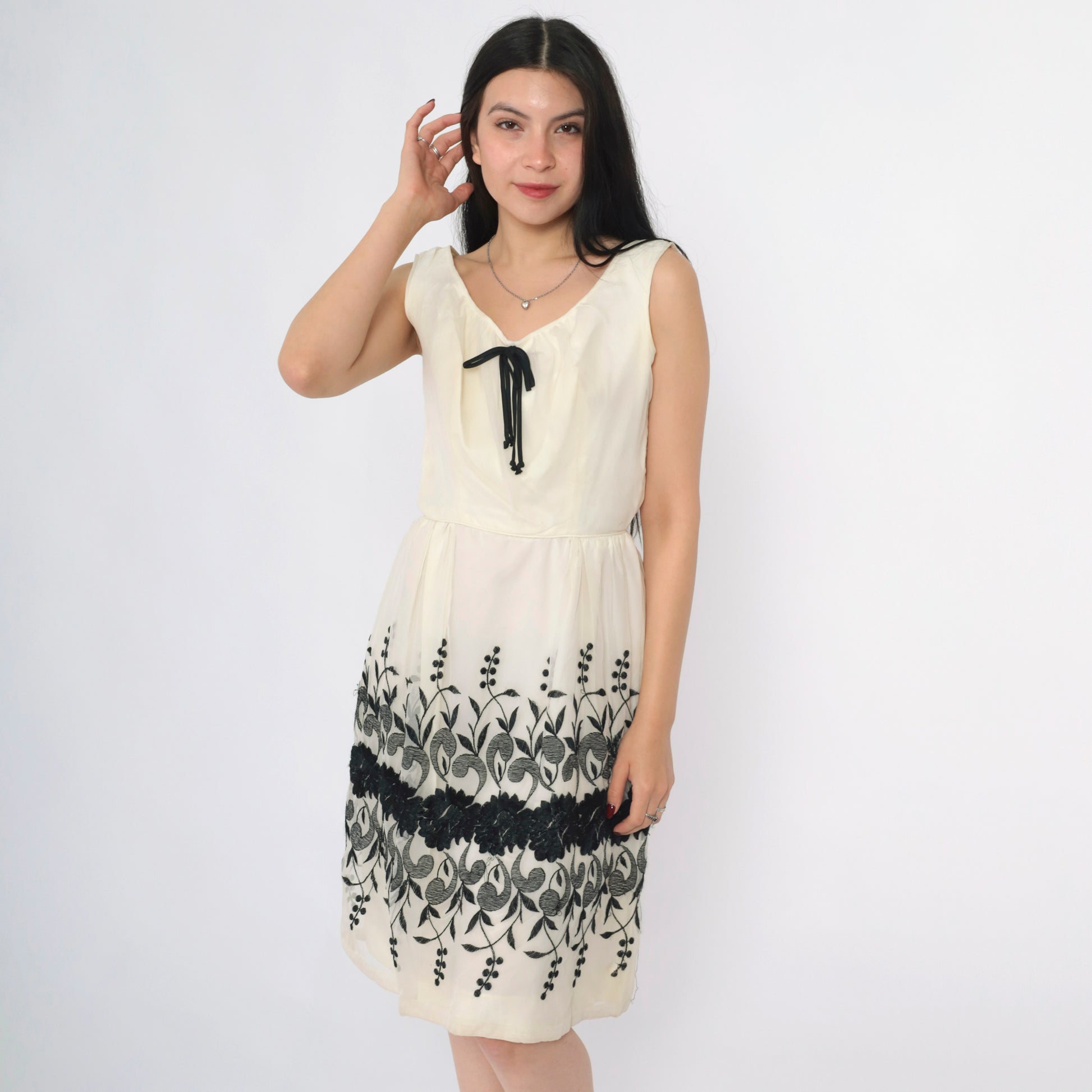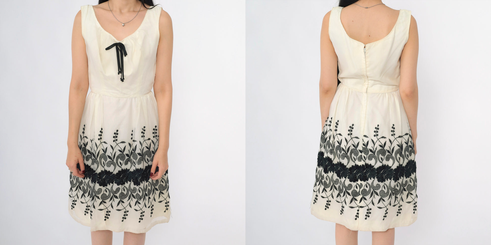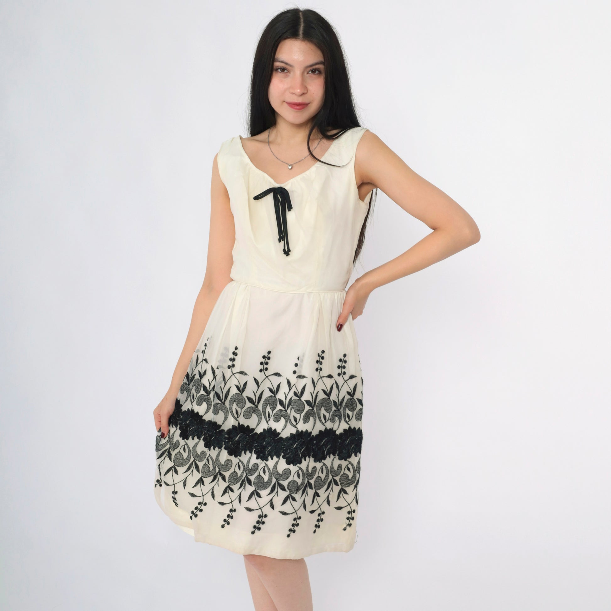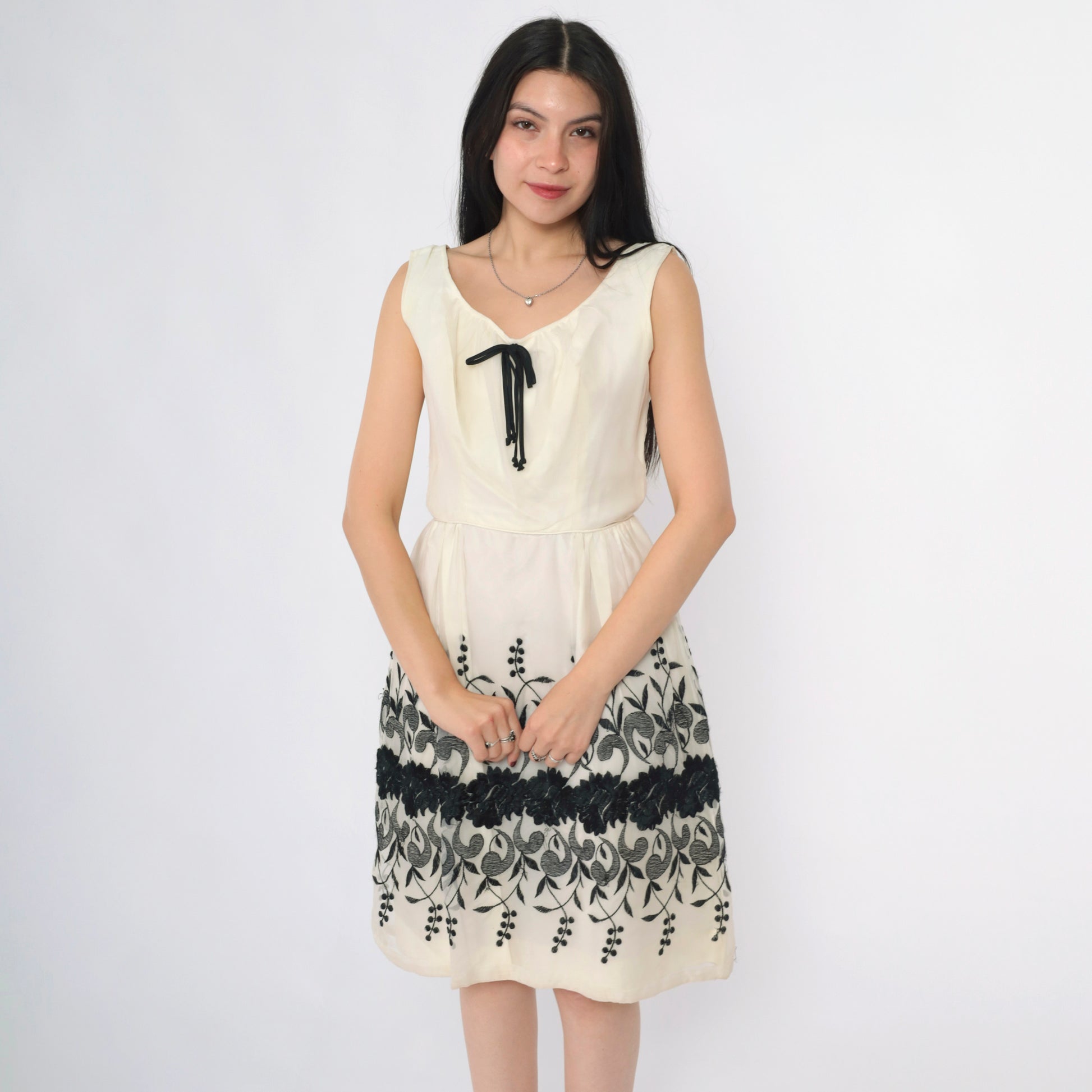 Vintage 60s party dress in ivory with black floral embroidery and a bow at the chest. Sleeveless with a high waist and a flared skirt. Knee length with a rear zipper.