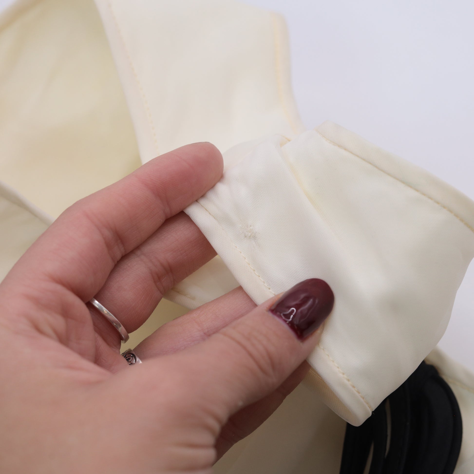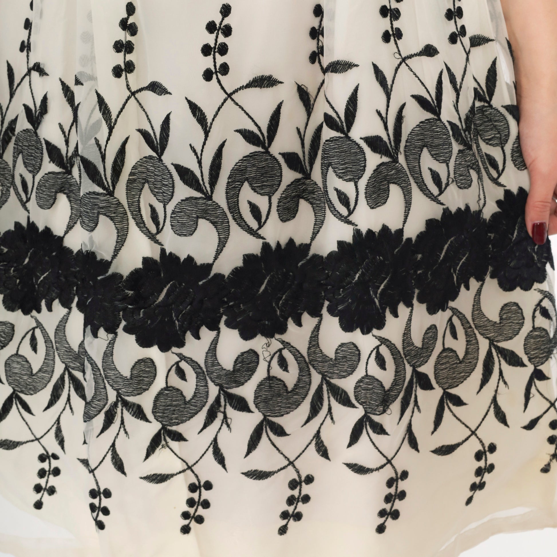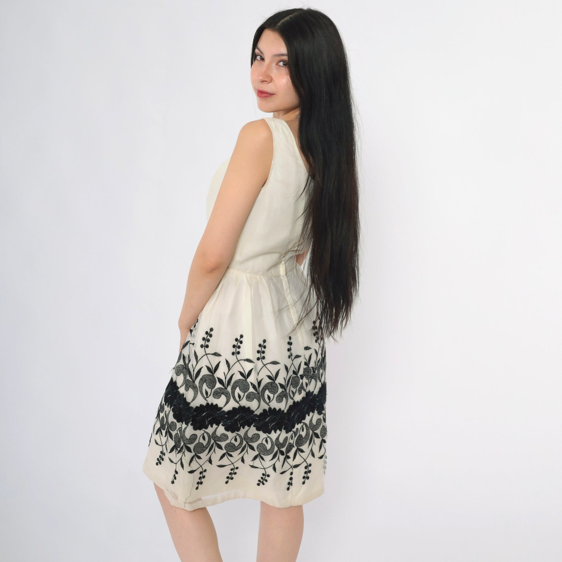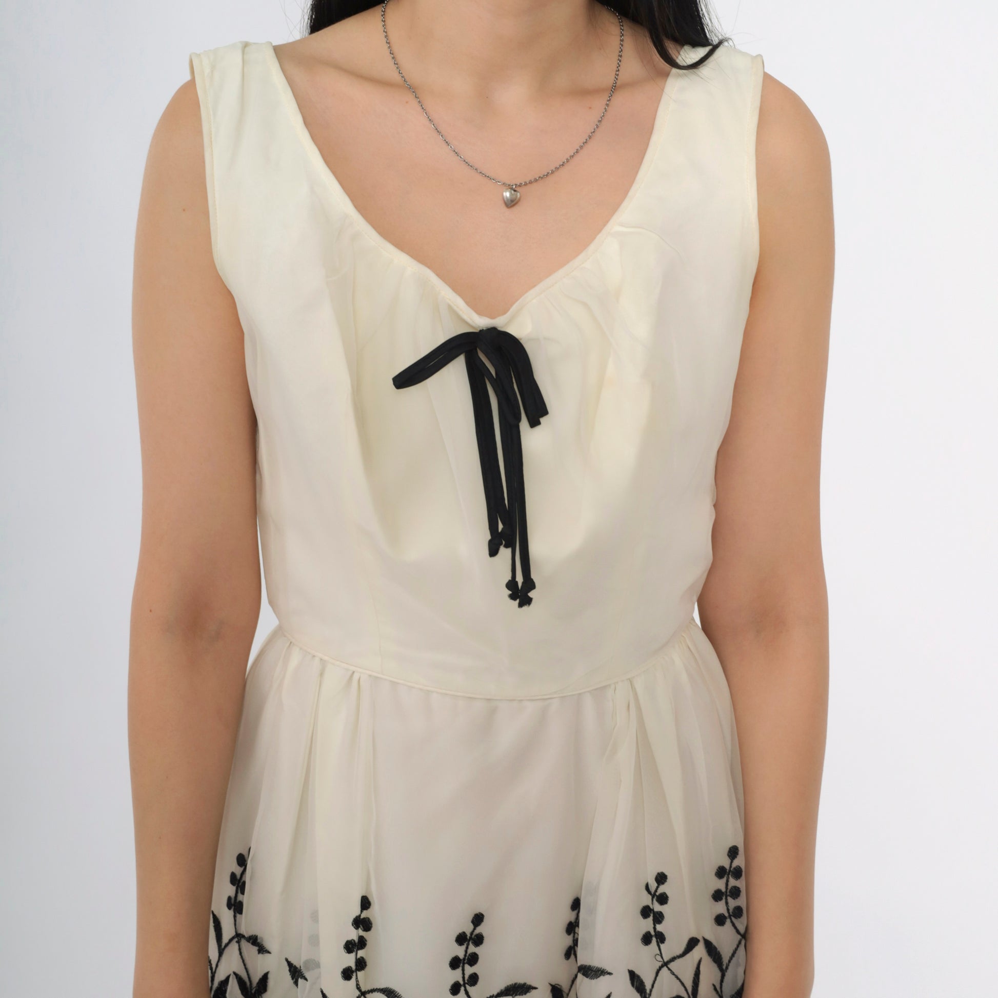 Vintage 60s party dress in ivory with black floral embroidery and a bow at the chest. Sleeveless with a high waist and a flared skirt. Knee length with a rear zipper.