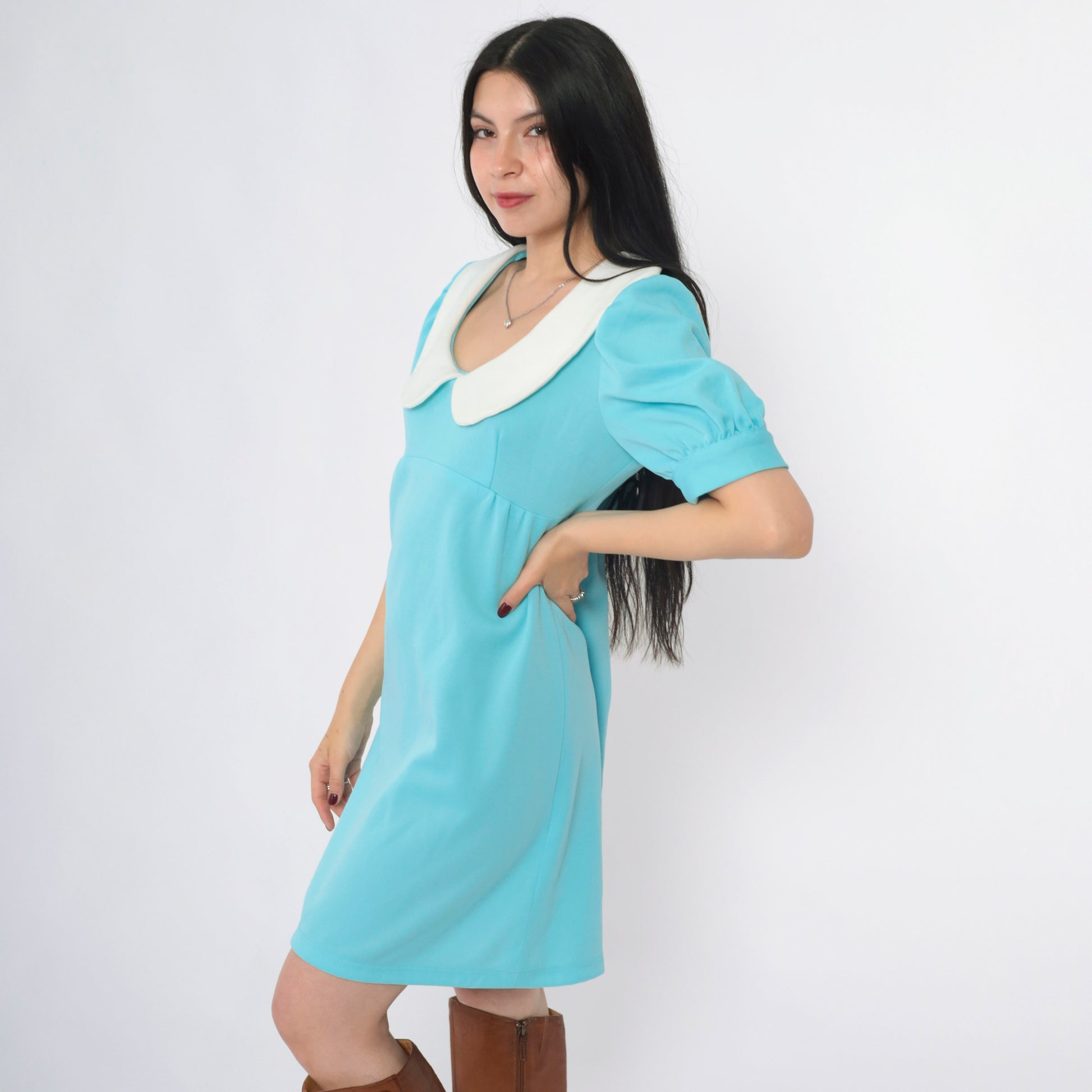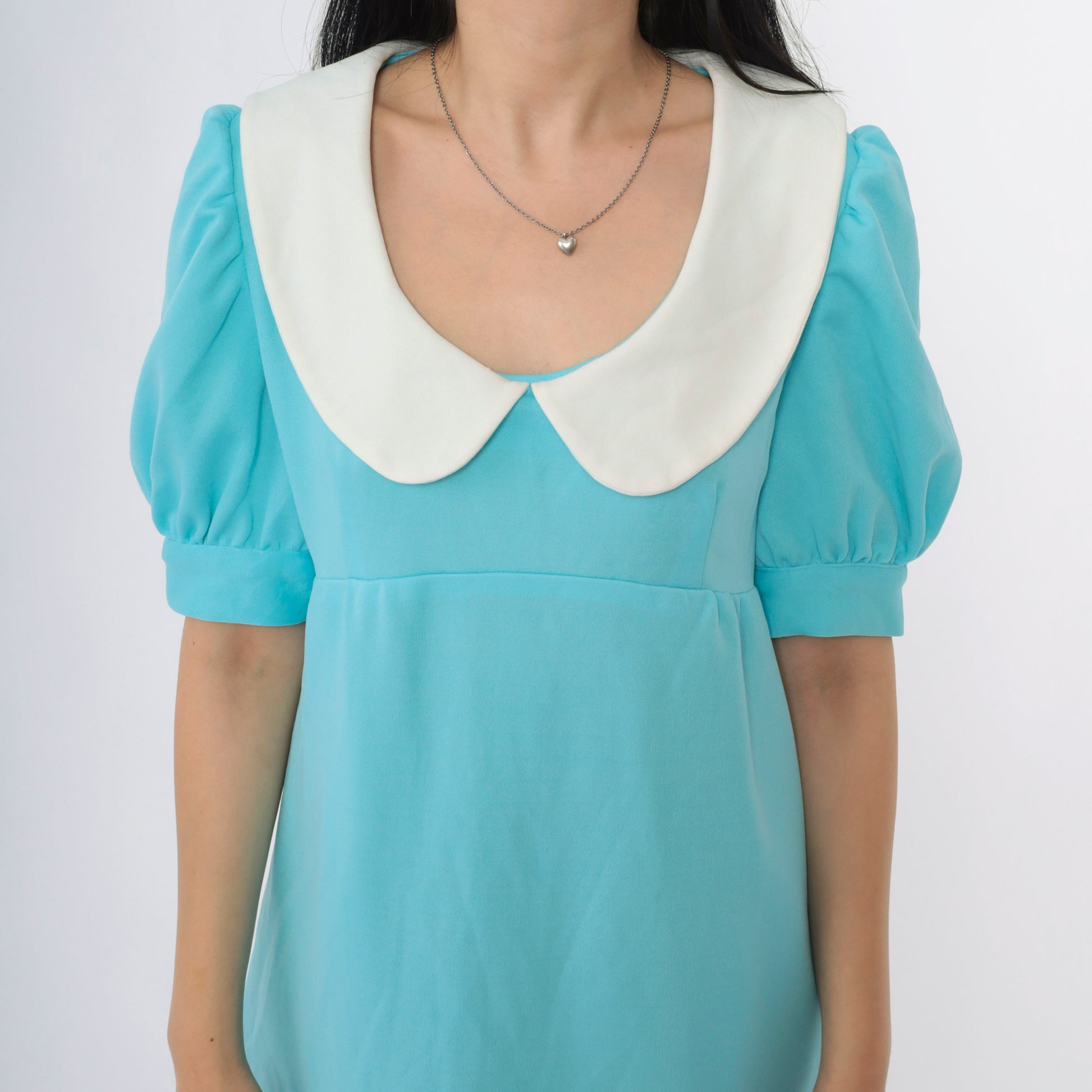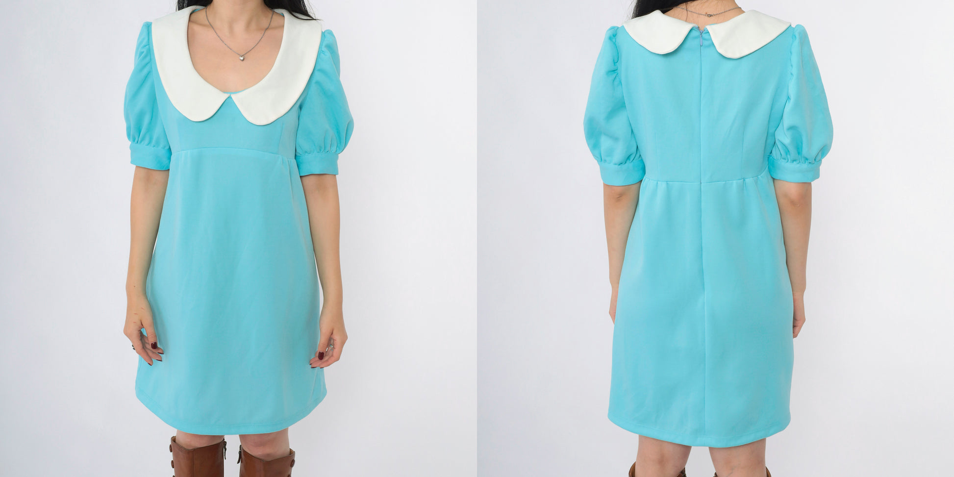Vintage 60s 70s dress in blue with a white peter pan collar. It has puff sleeves with an empire waist and a rear zip. Mini length.
