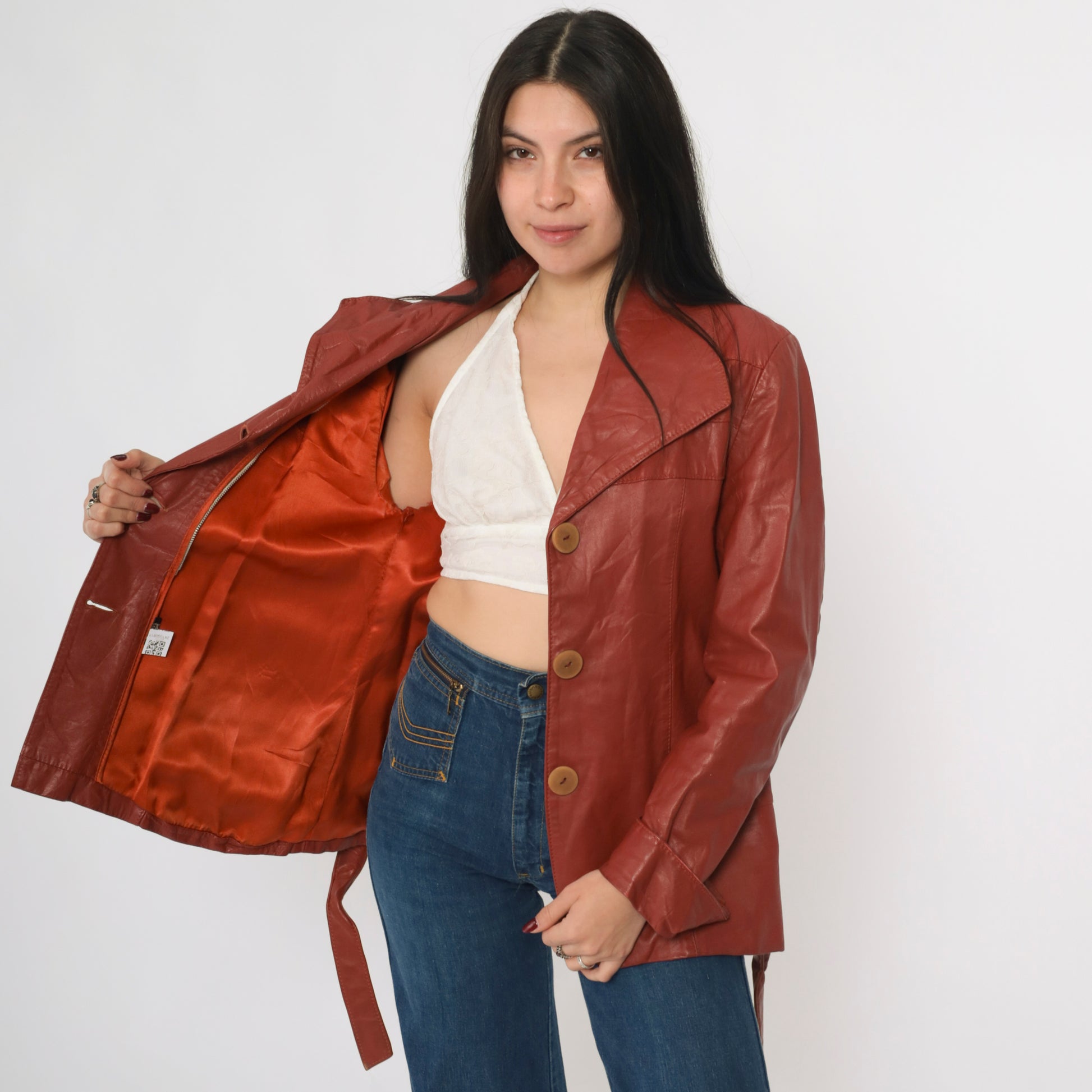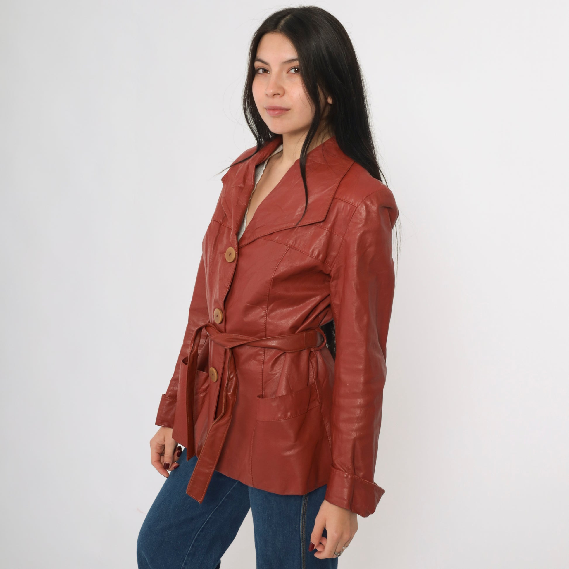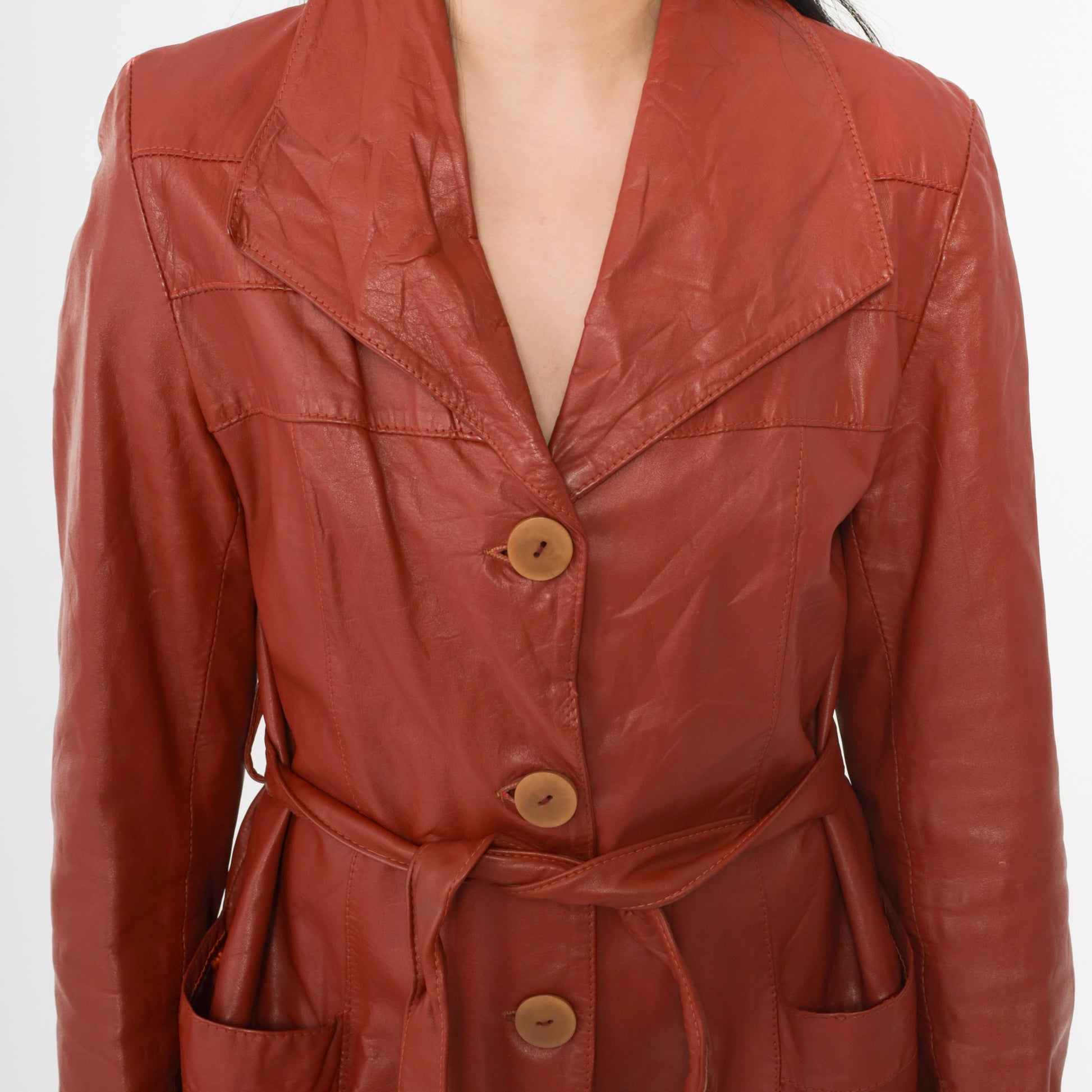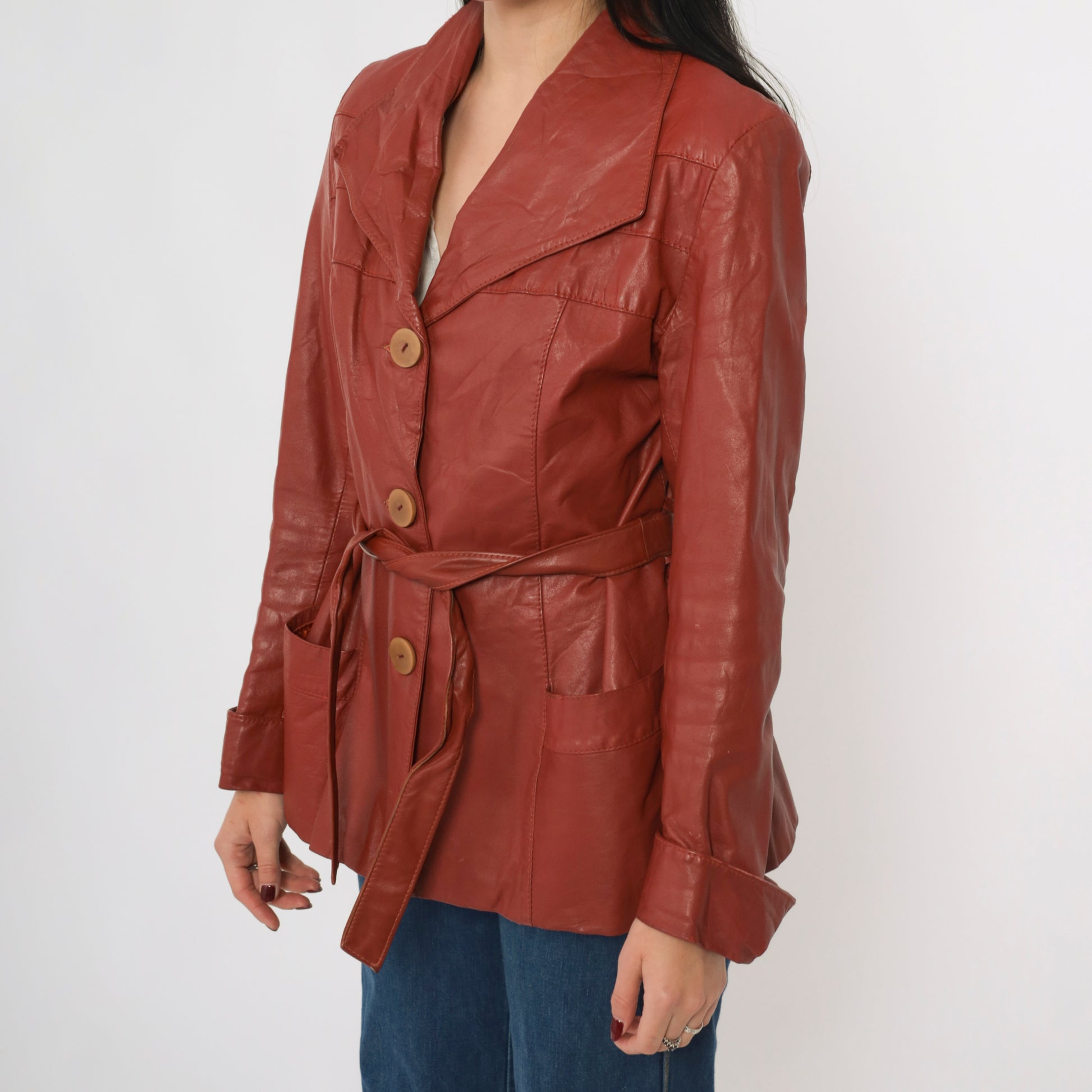 Vintage 70s jacket in brick red leather. It has a matching belt, buttons up the front and patch pockets.