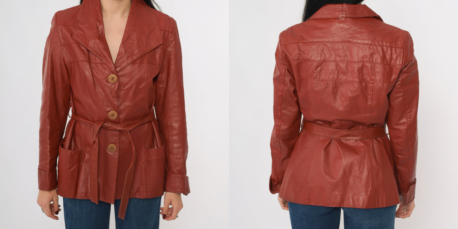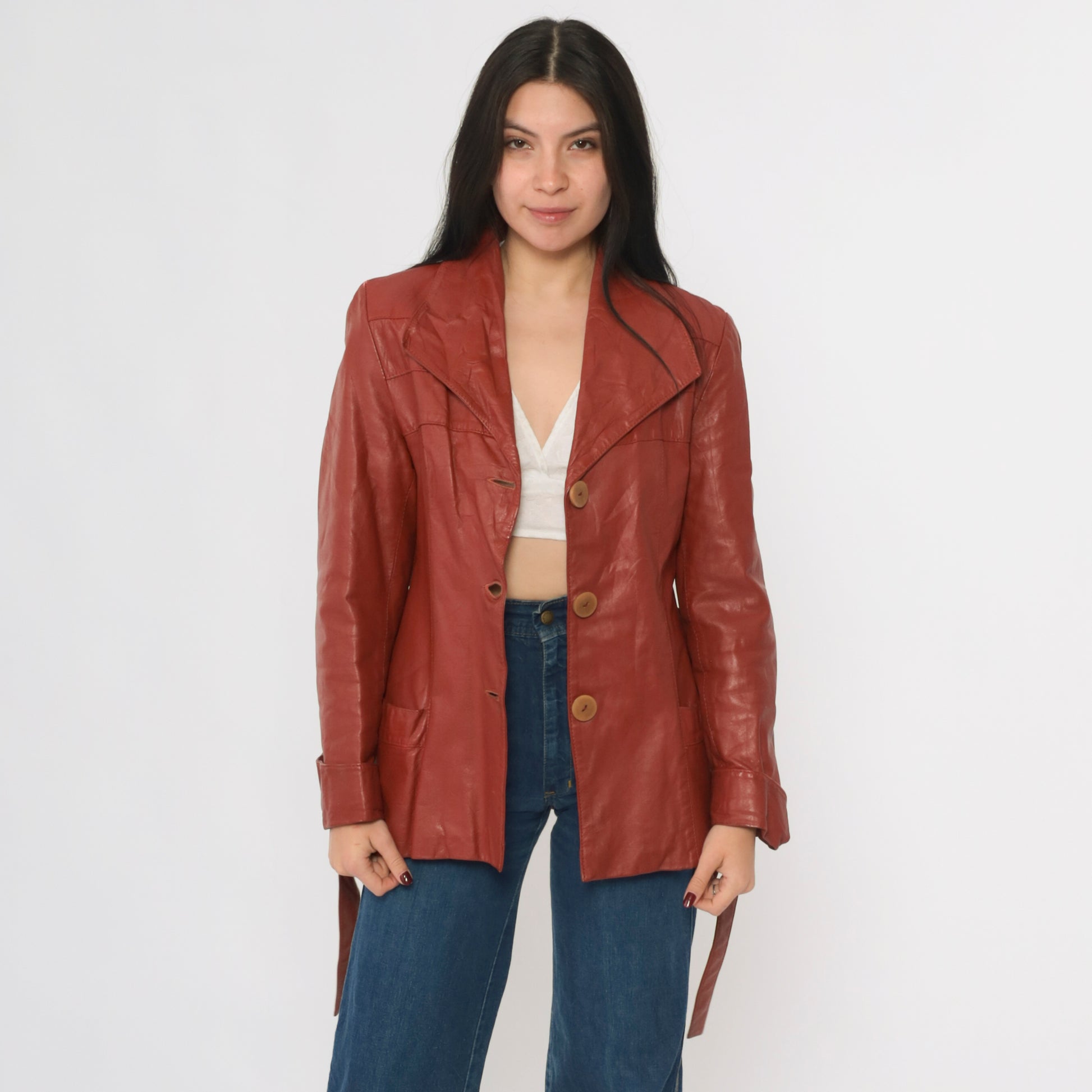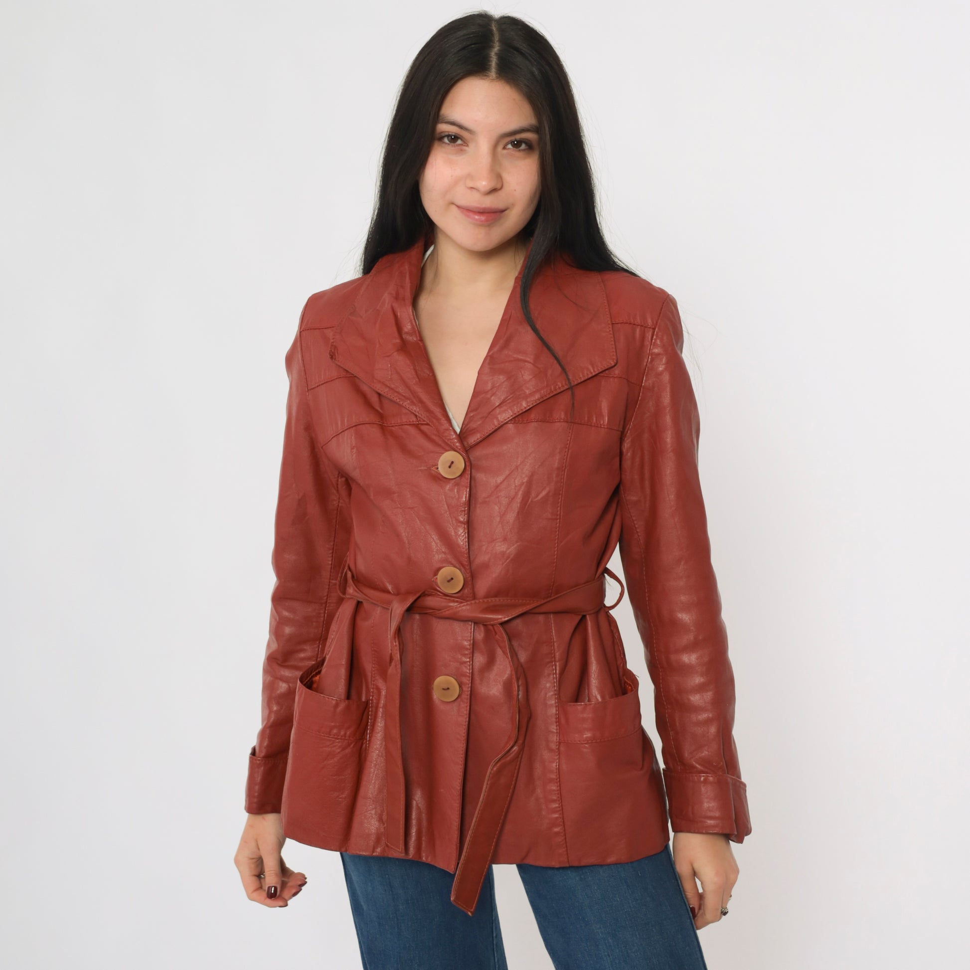 Vintage 70s jacket in brick red leather. It has a matching belt, buttons up the front and patch pockets.