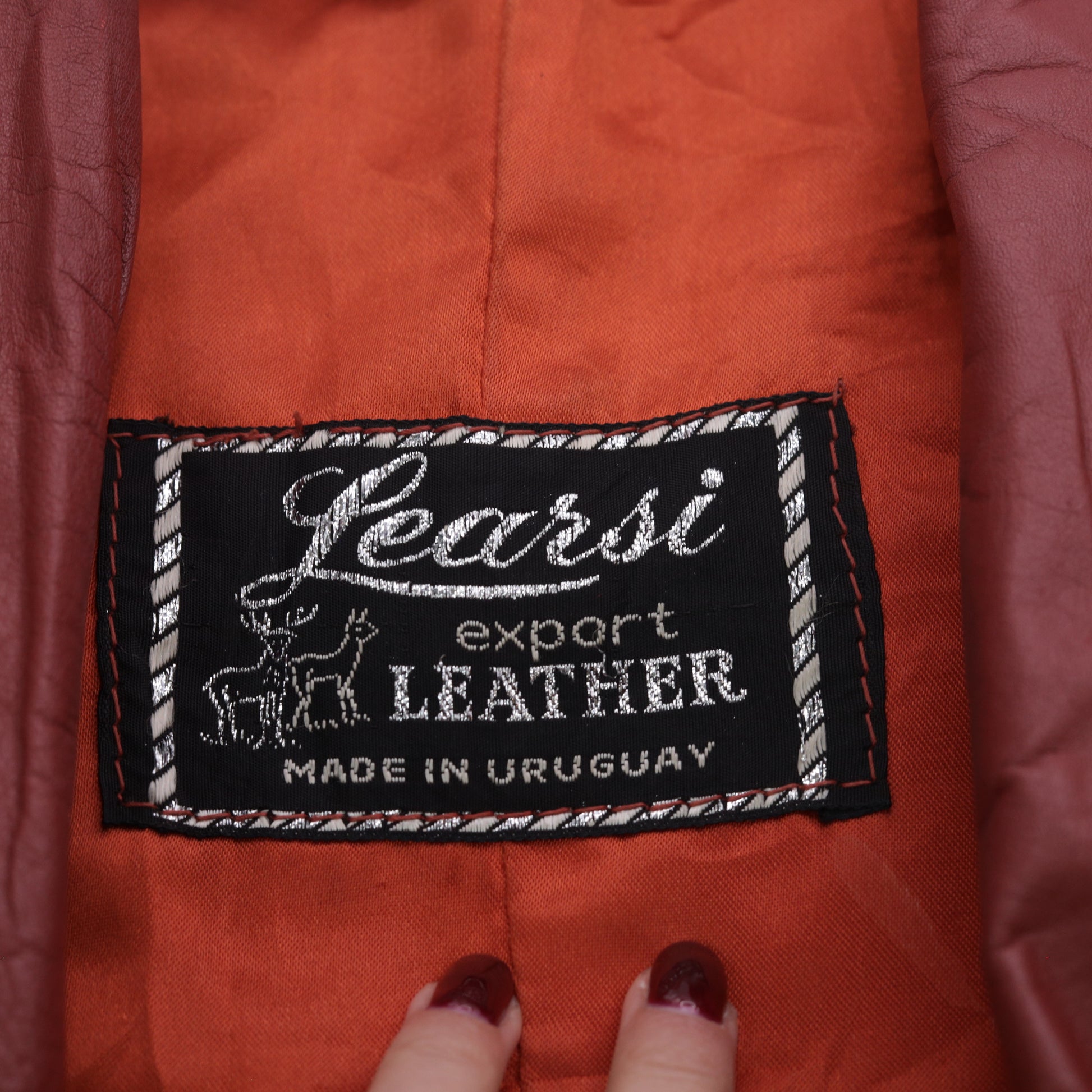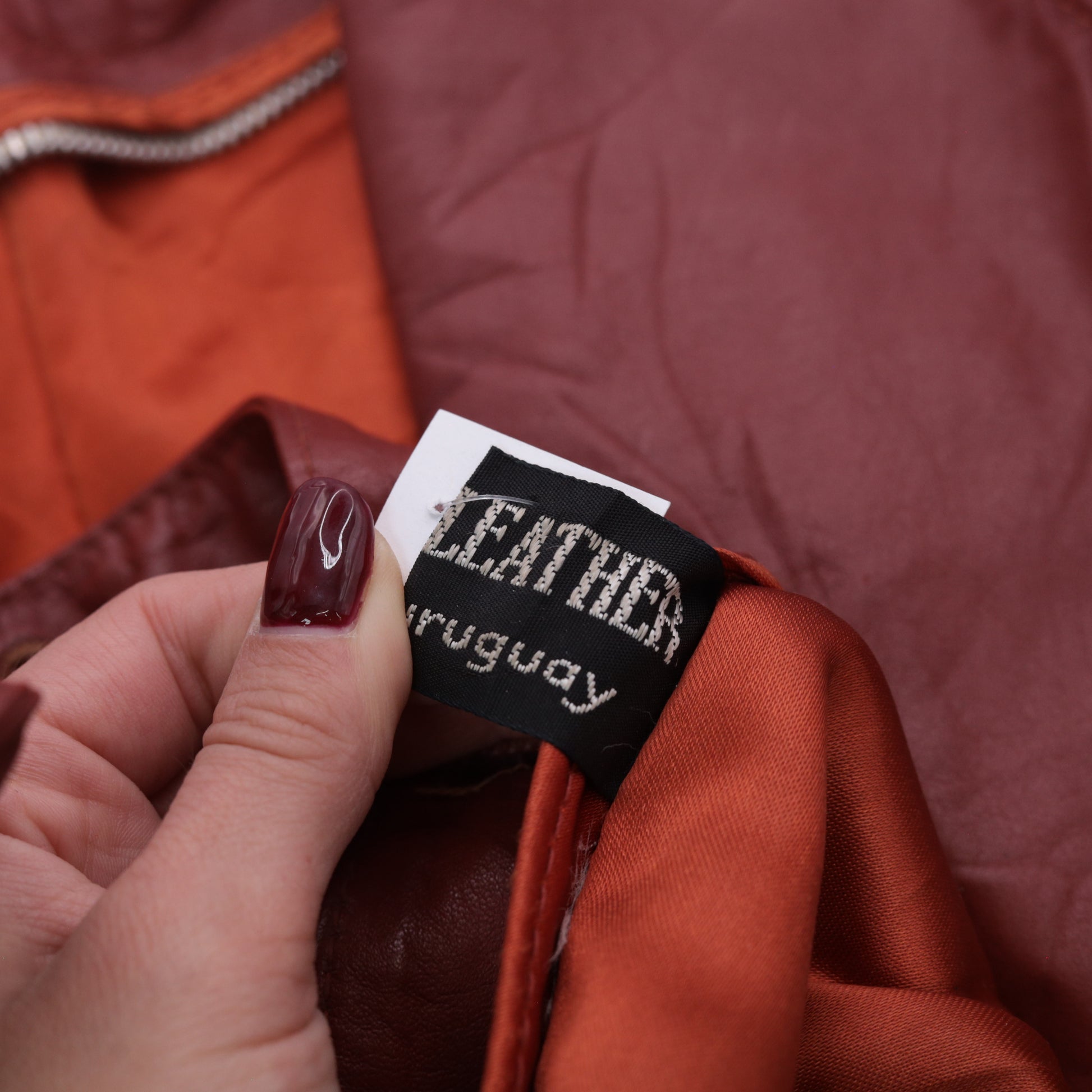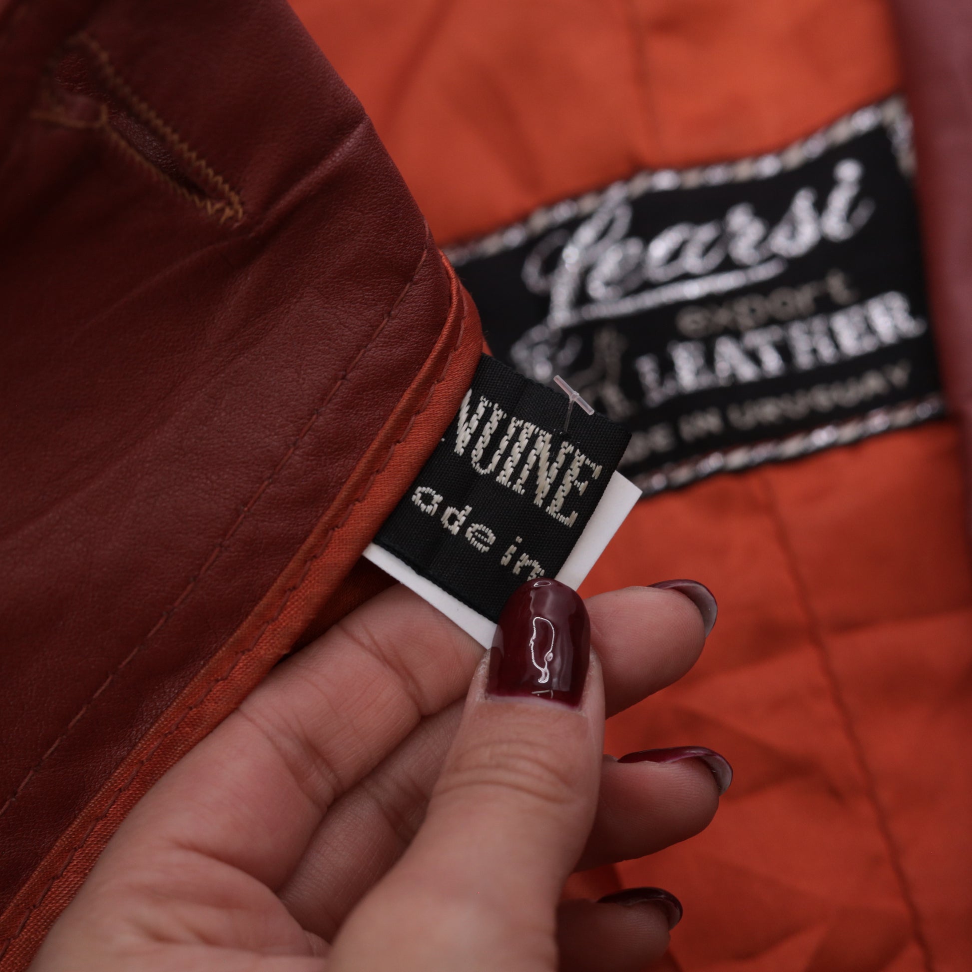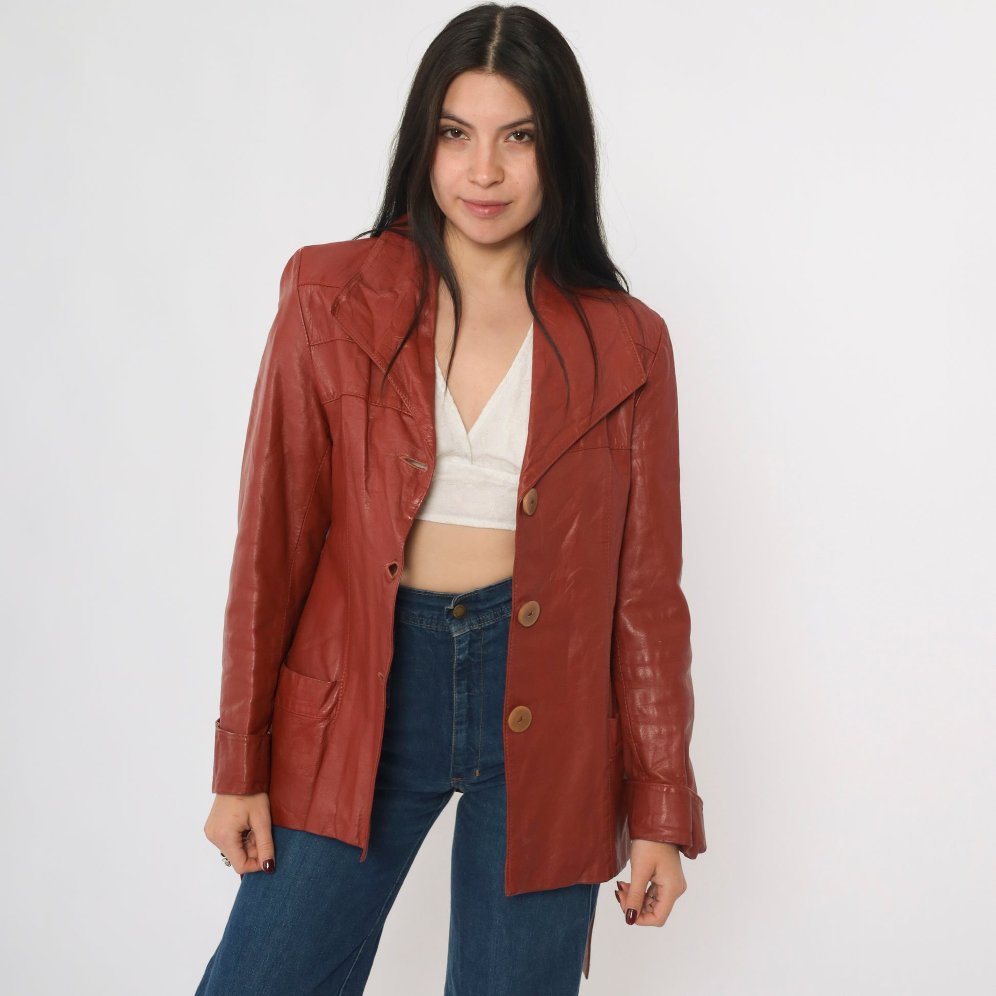 Vintage 70s jacket in brick red leather. It has a matching belt, buttons up the front and patch pockets.