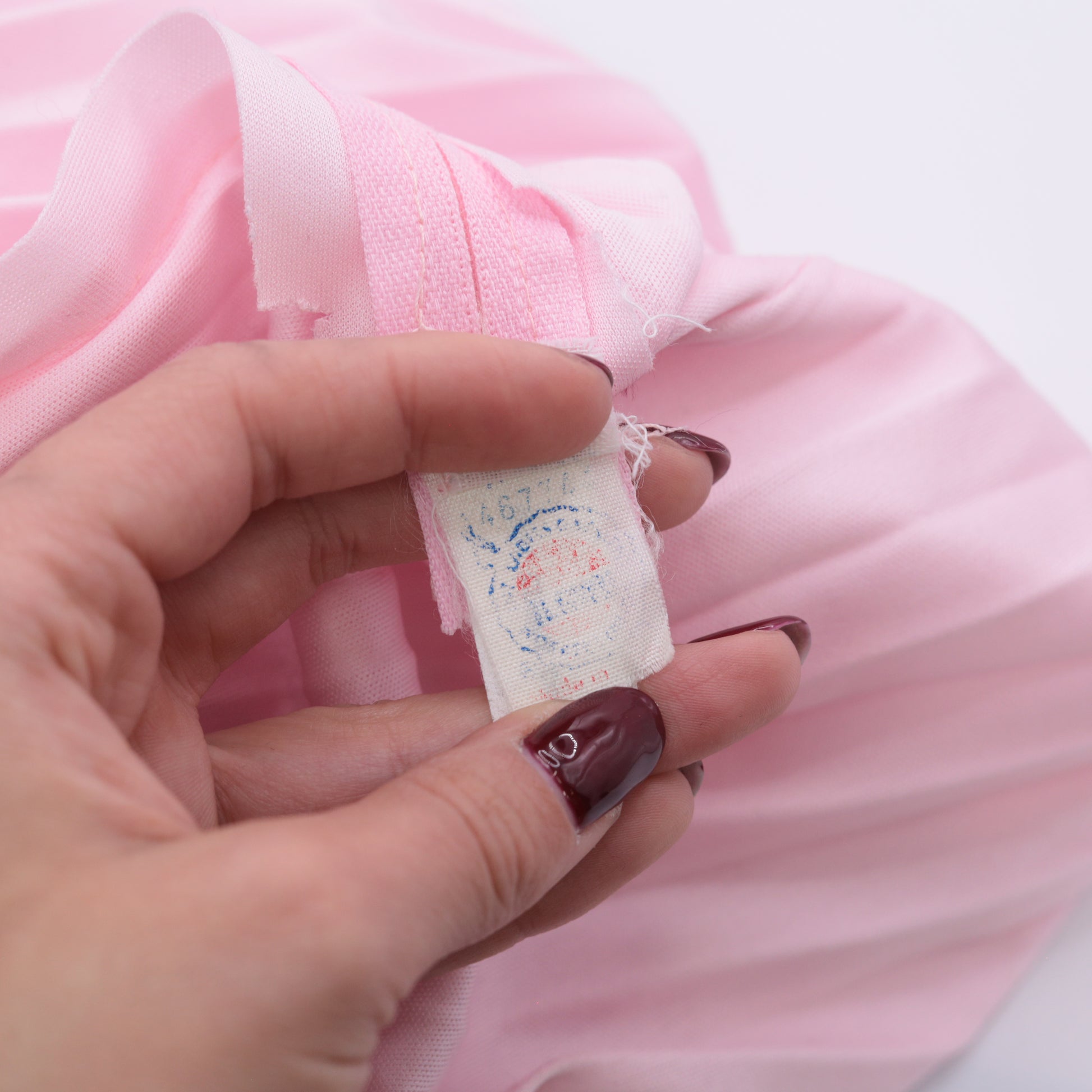 Vintage 70s dress in pink with deep burgundy red velvet panels on the chest. It features an empire waist, cap sleeves, and a cowl neck. Maxi length with a pleated skirt.