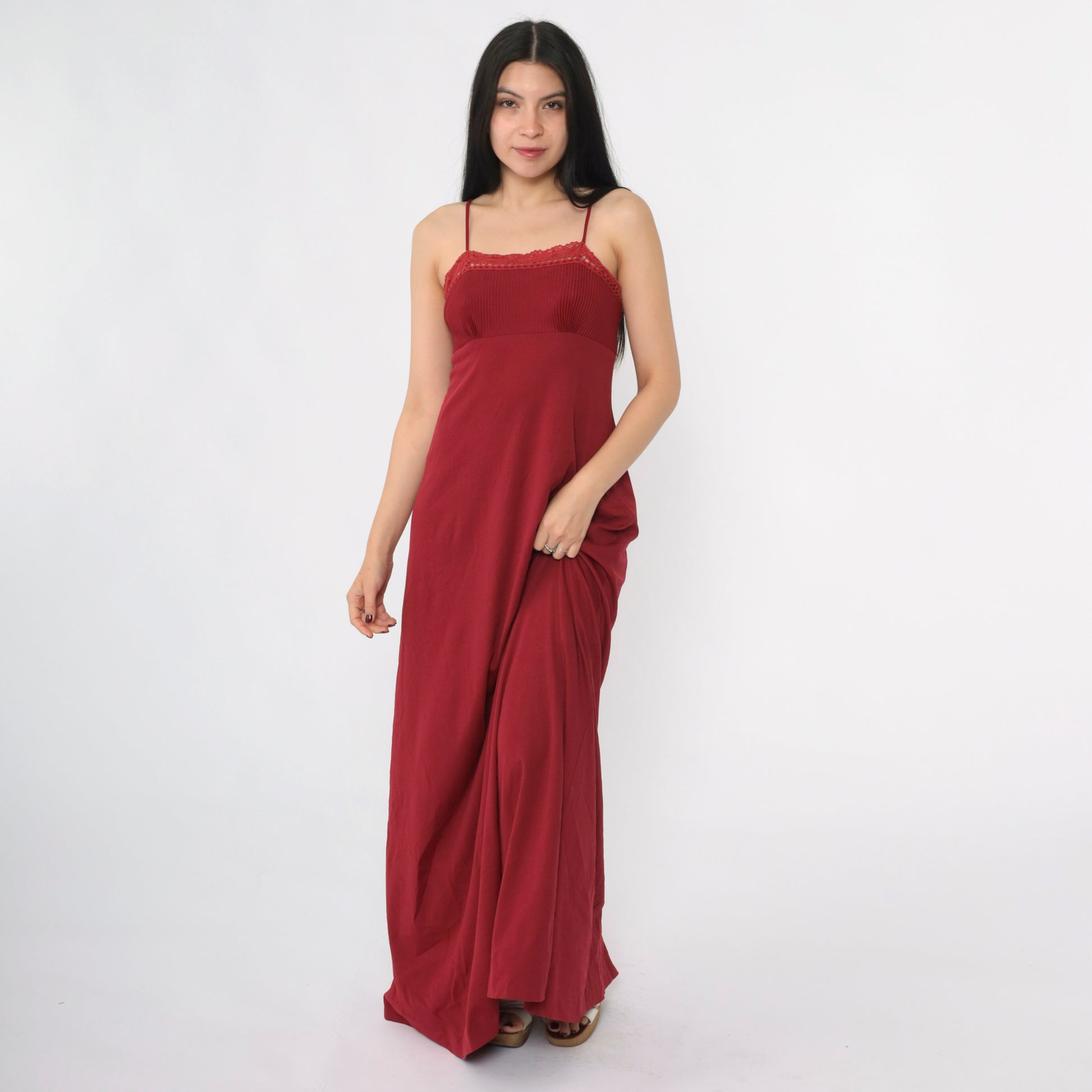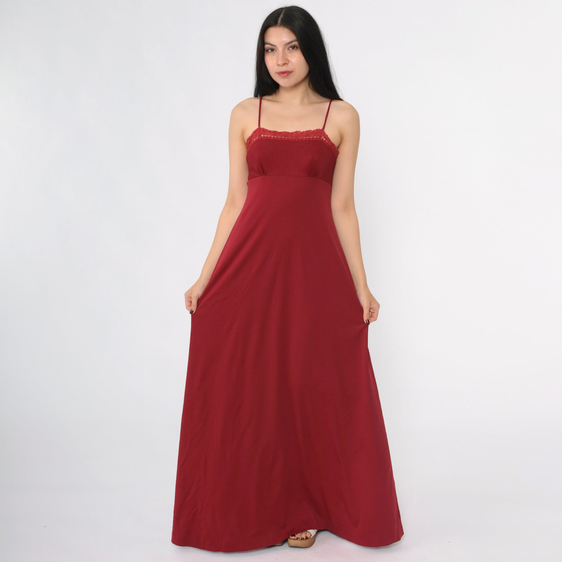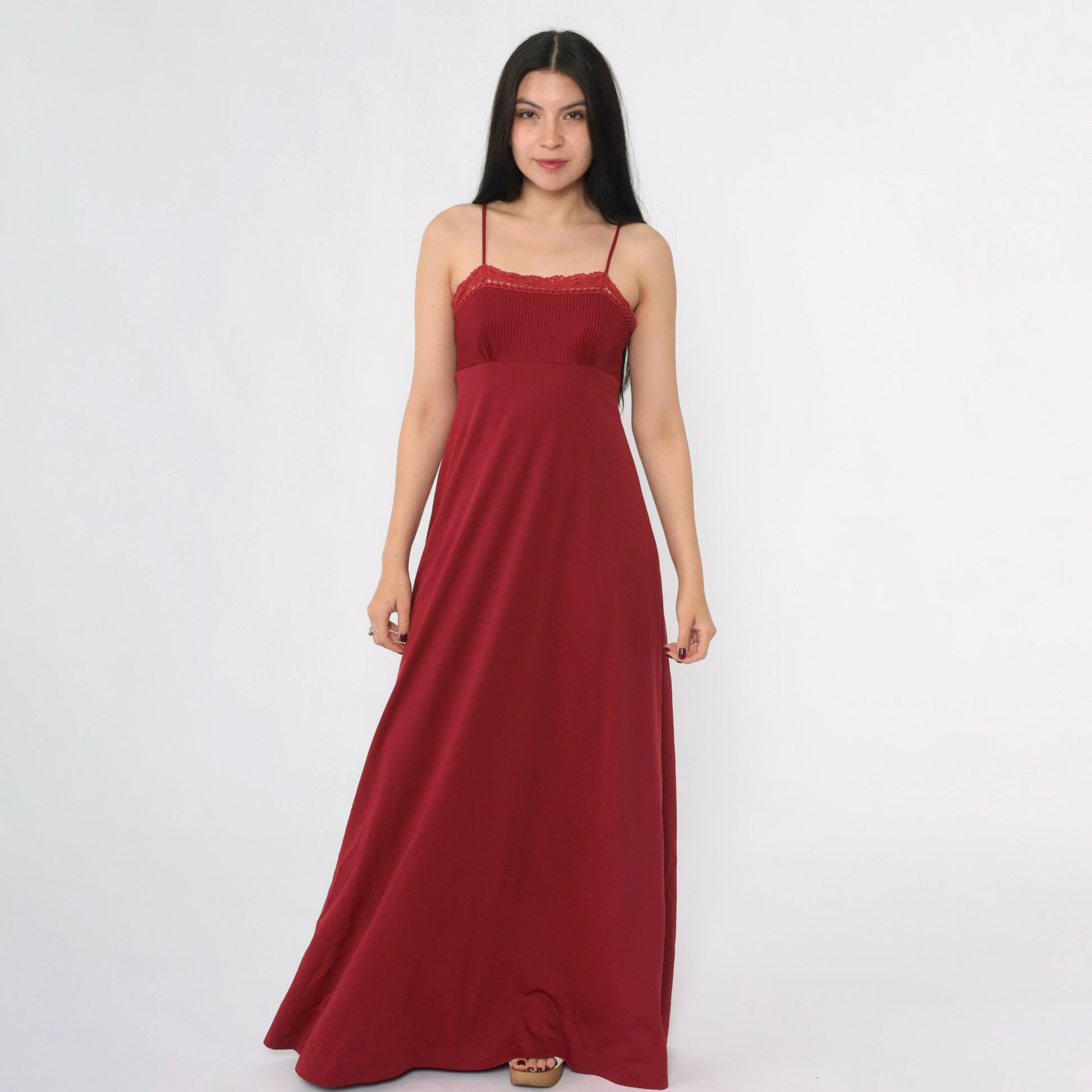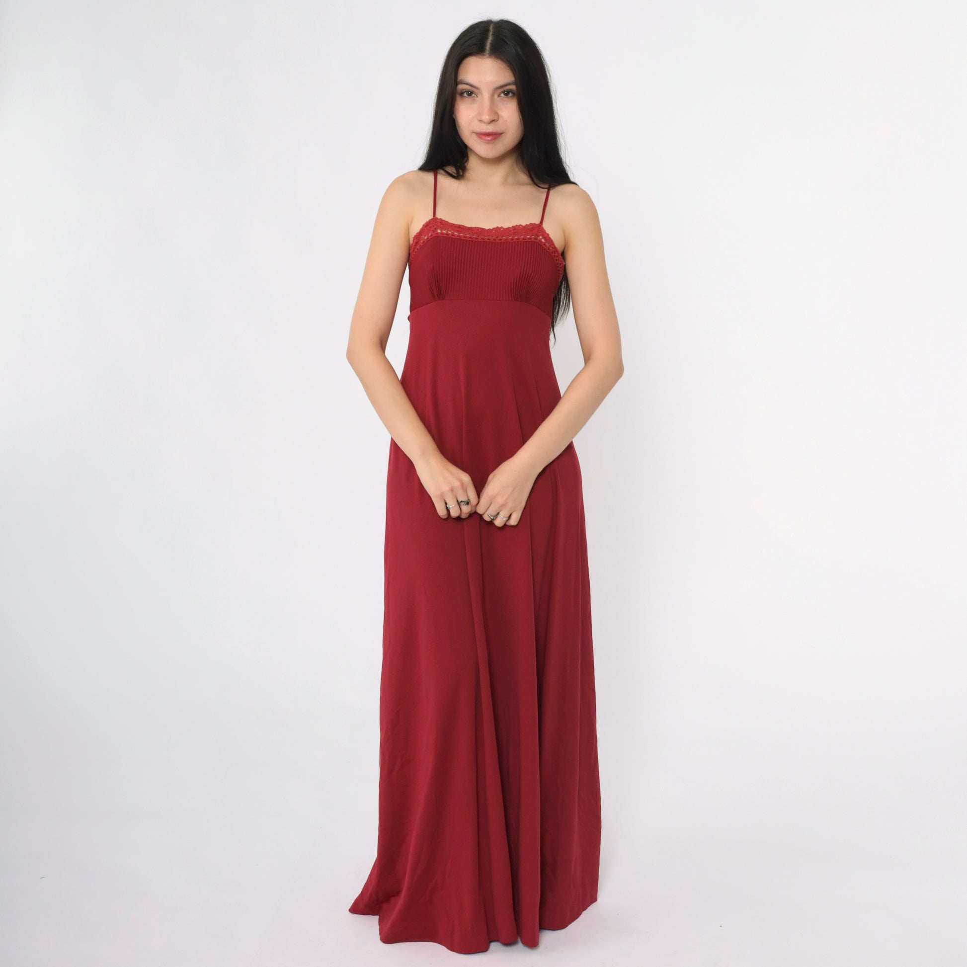 Vintage 70s maxi dress in burgundy red with a pleated bodice and crochet lace trim. Sleeveless with an empire waist, spaghetti straps and a long flowing skirt. Full length.