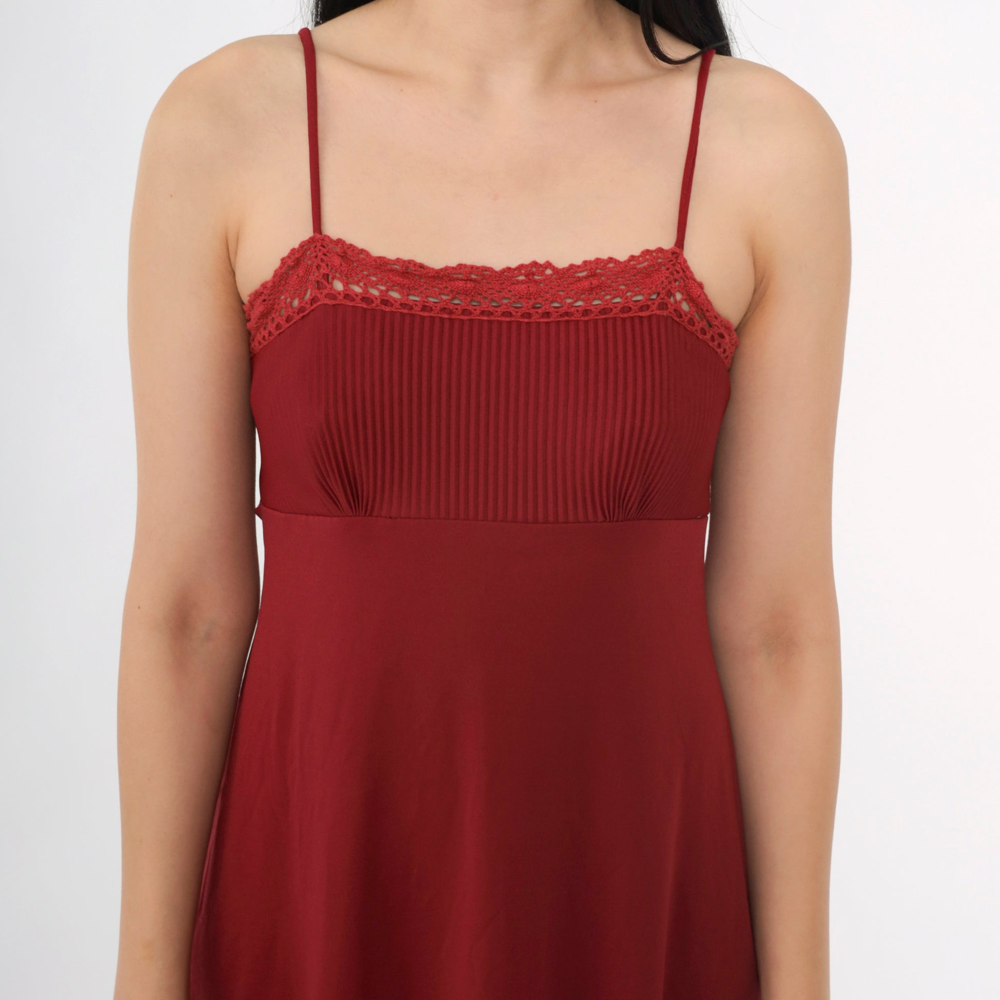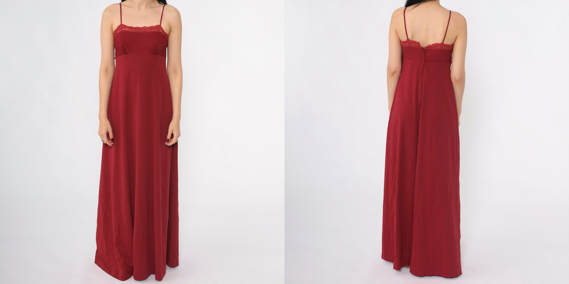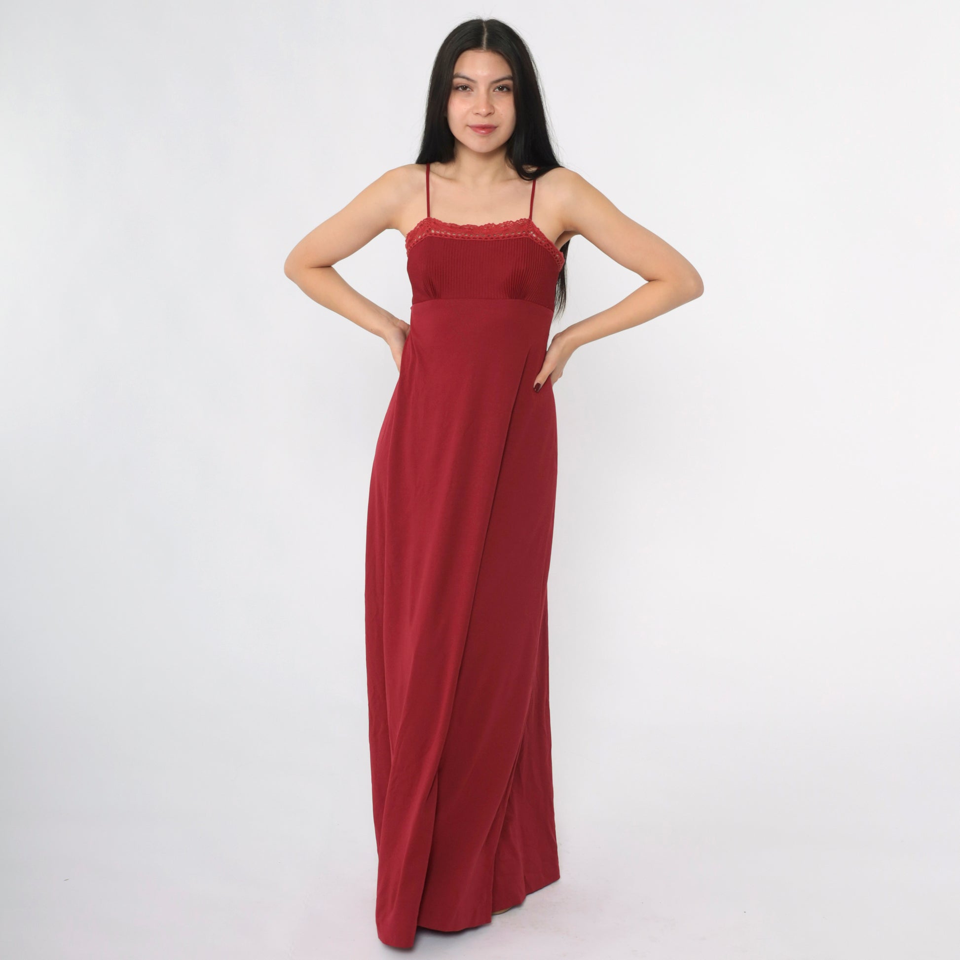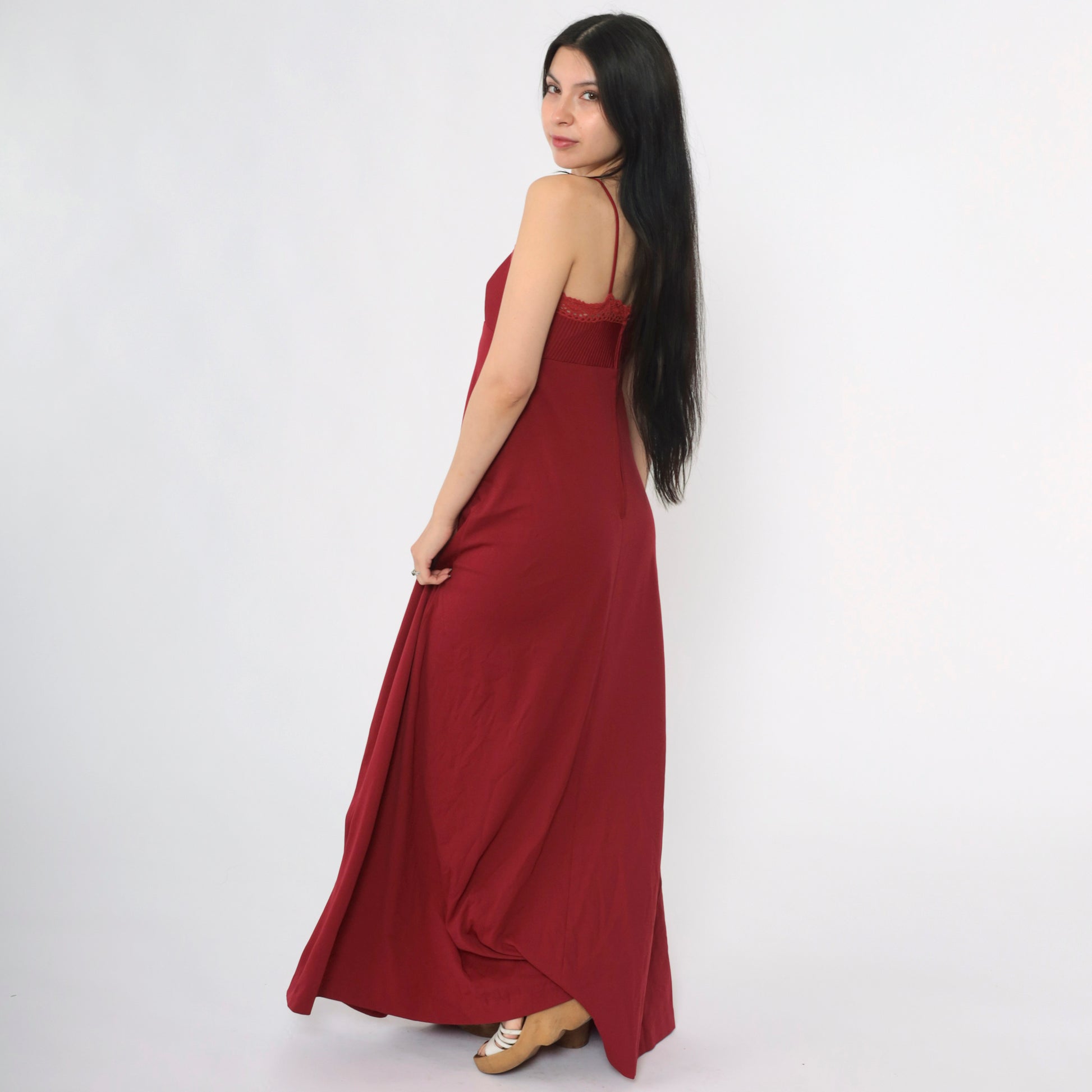 Vintage 70s maxi dress in burgundy red with a pleated bodice and crochet lace trim. Sleeveless with an empire waist, spaghetti straps and a long flowing skirt. Full length.