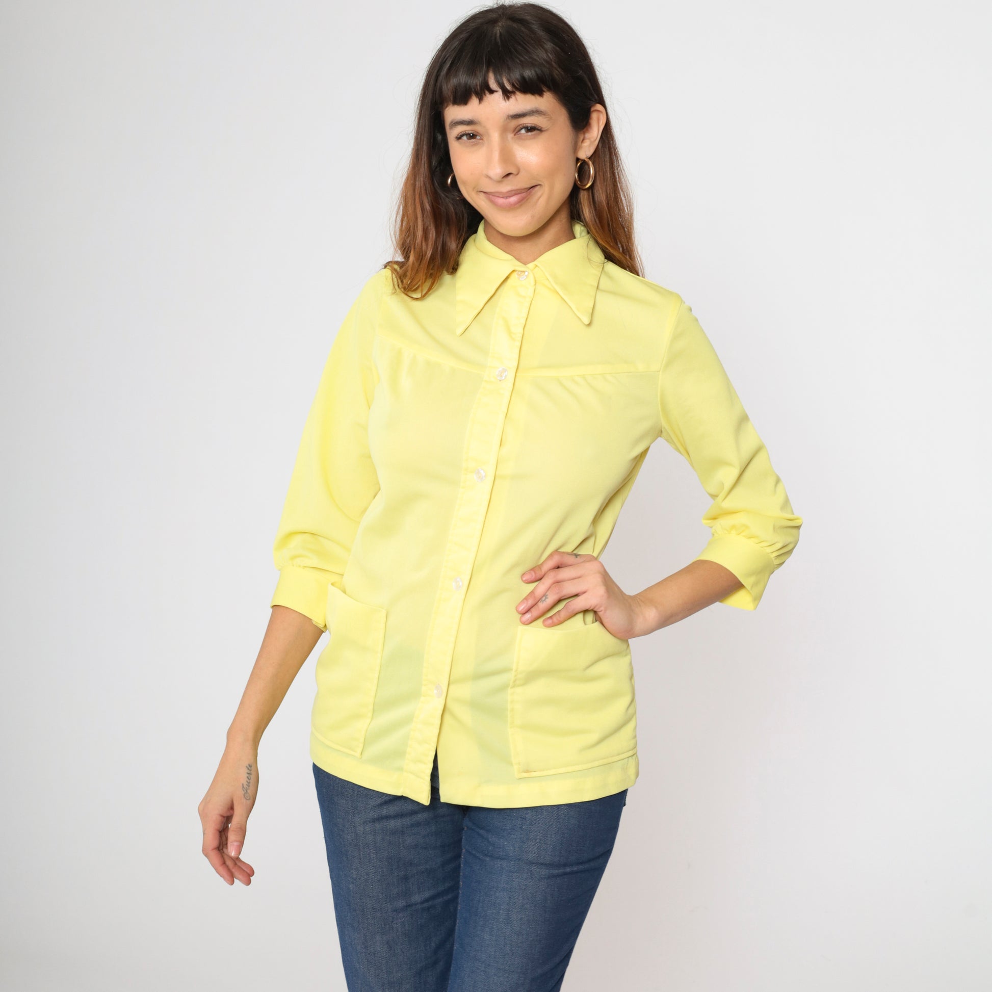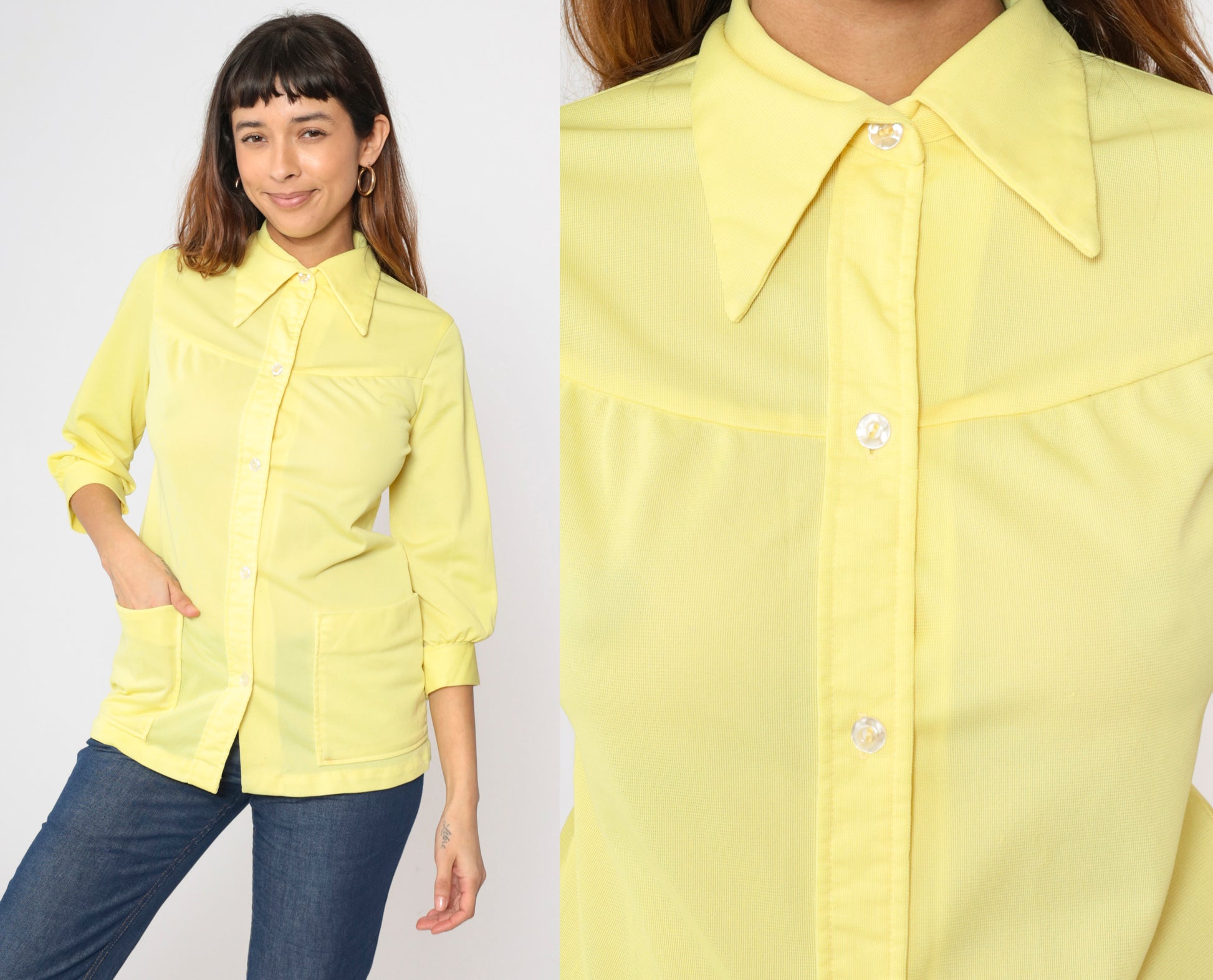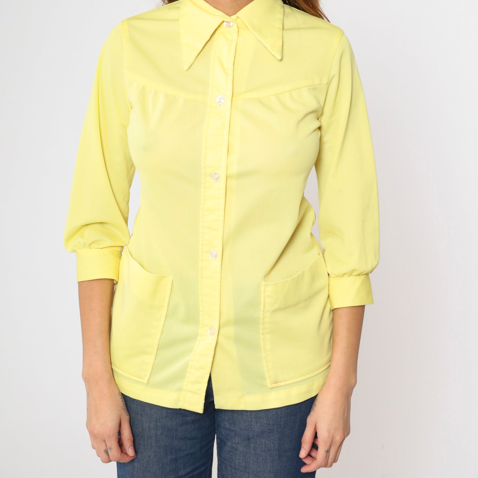 Vintage 70s shirt in yellow with a dagger collar and patch pockets on the chest. Buttons down the front.