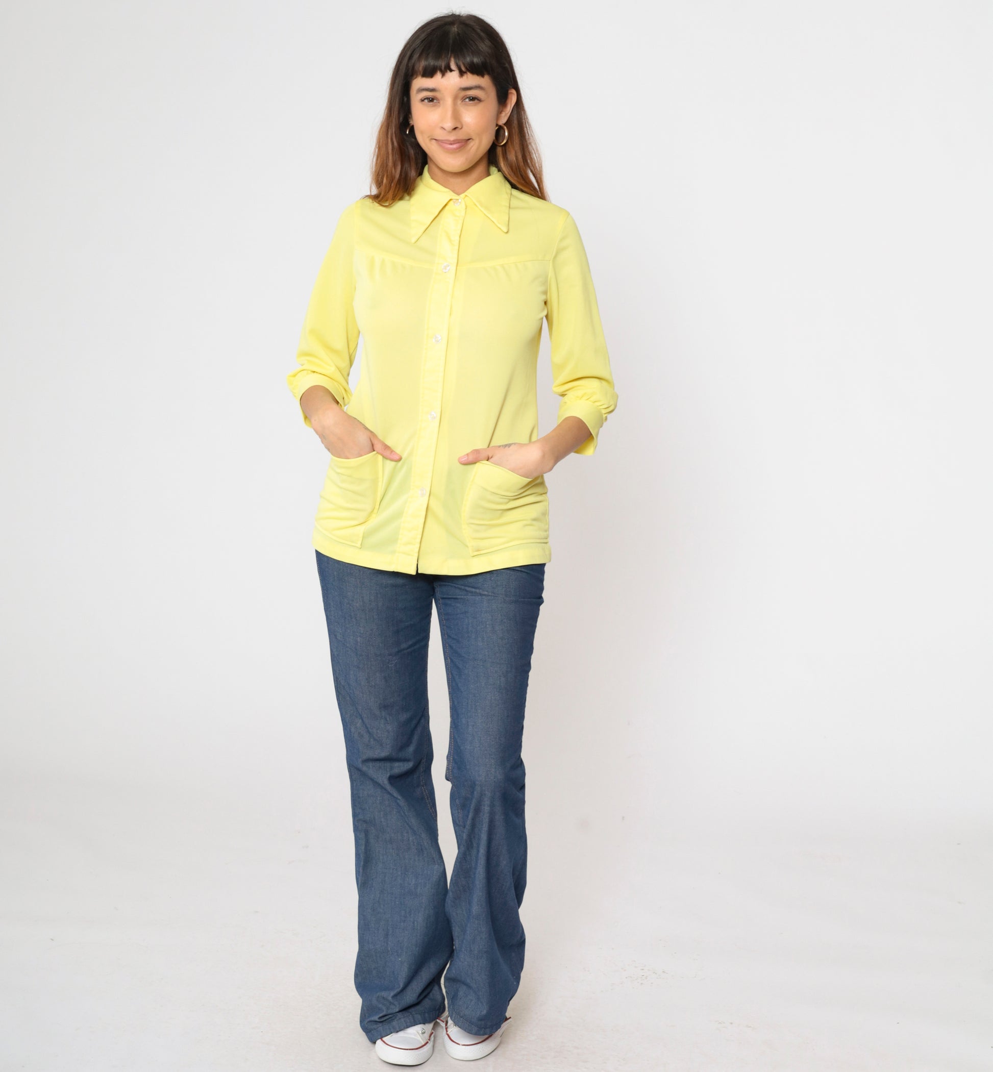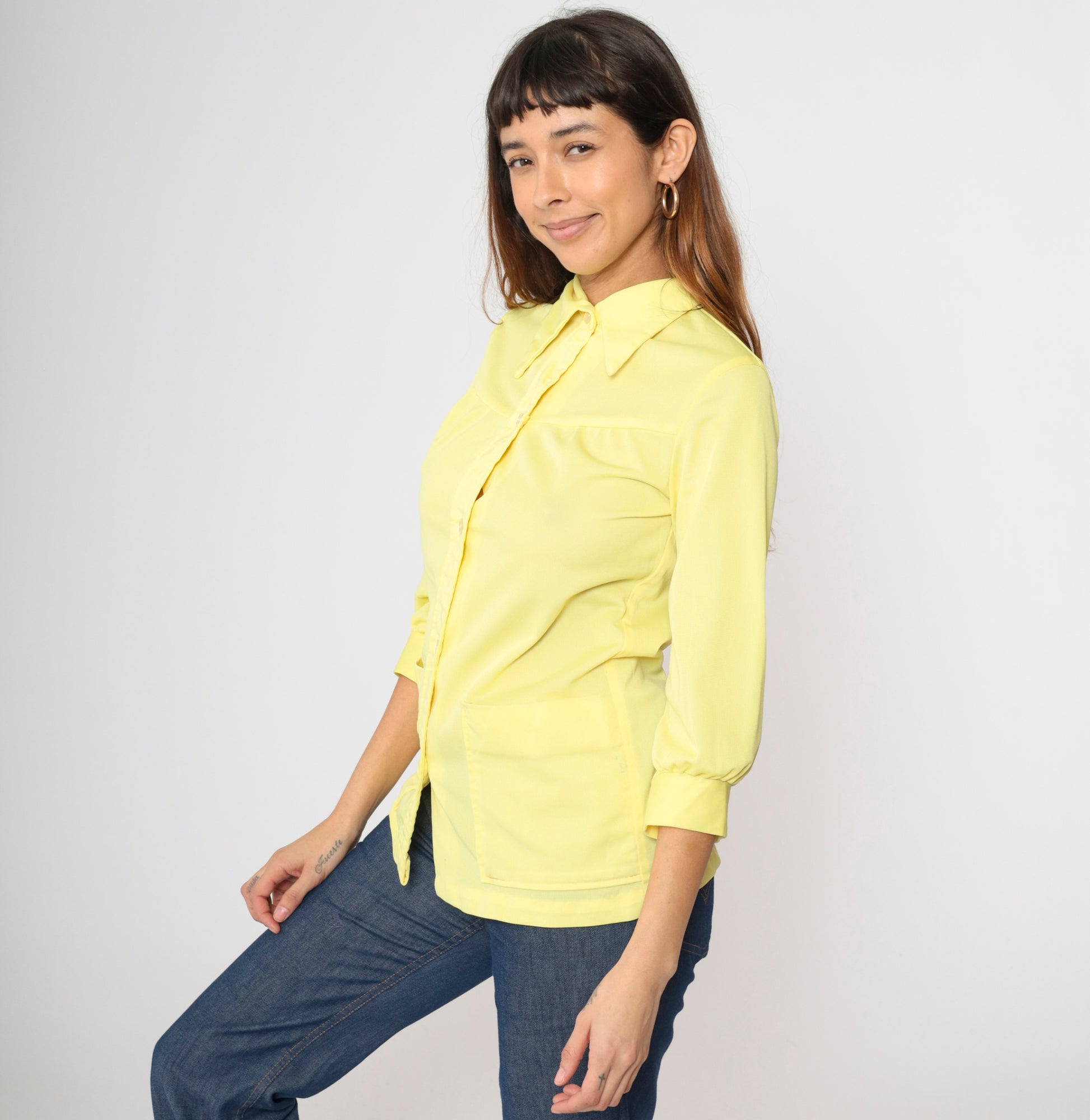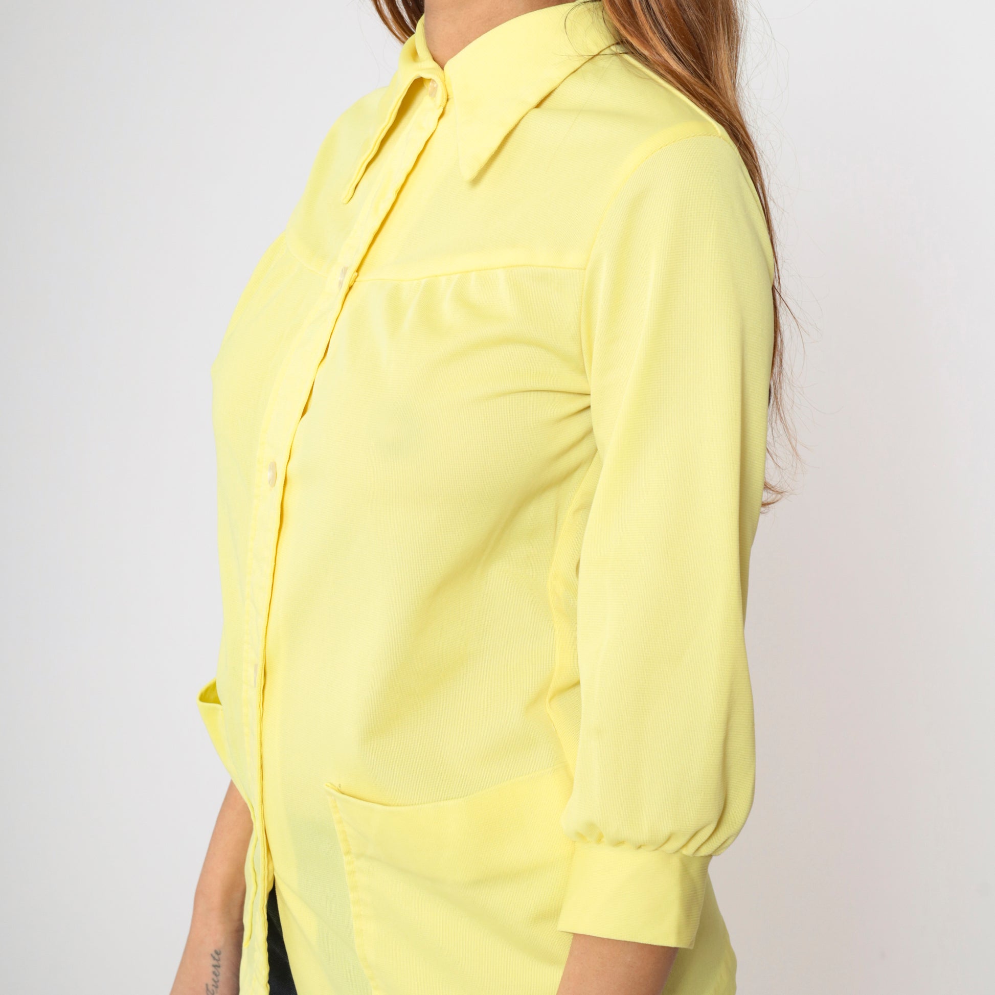 Vintage 70s shirt in yellow with a dagger collar and patch pockets on the chest. Buttons down the front.