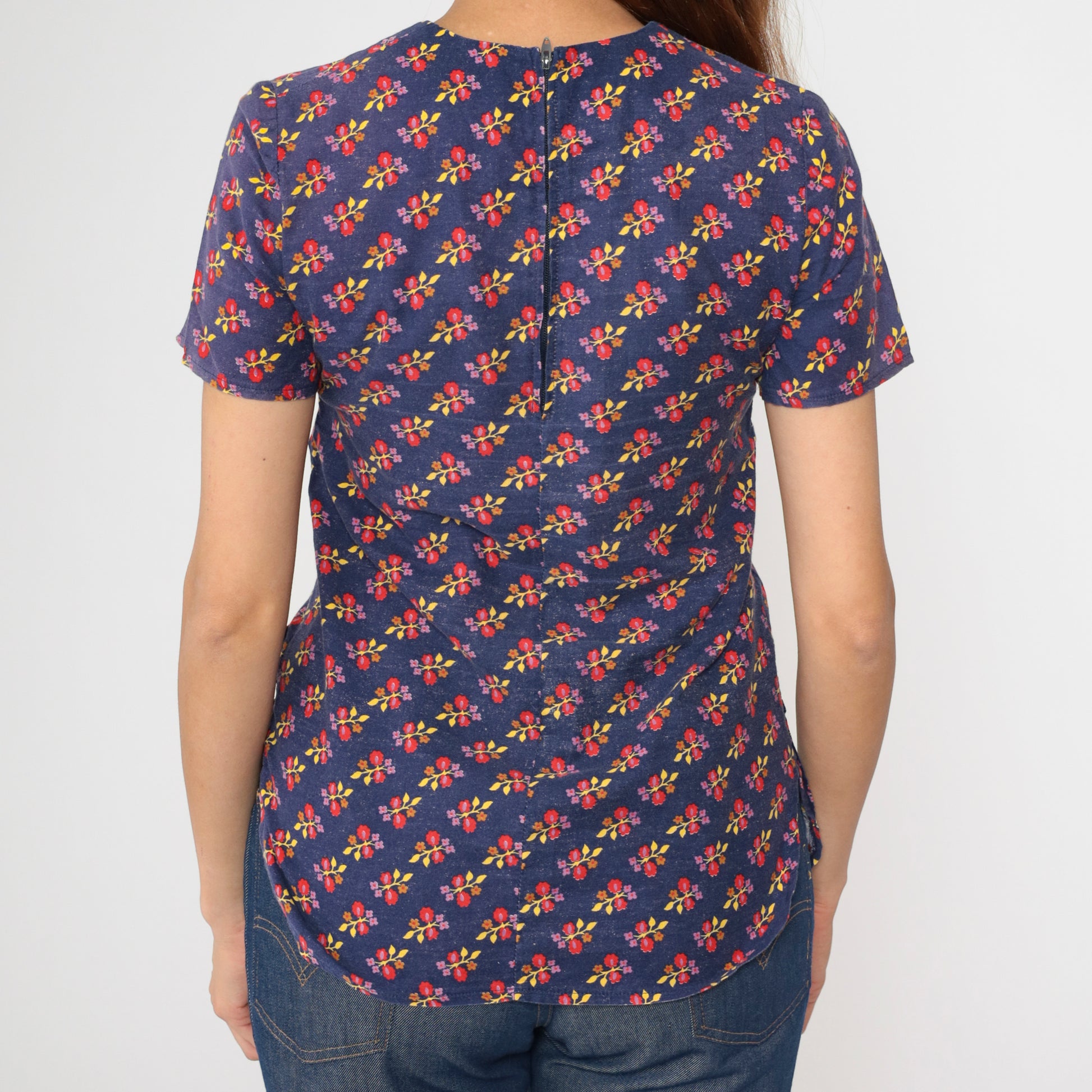 Vintage 70s top in dark blue with floral print and short sleeves. It features front patch pockets, a curved hem, and rear zipper.