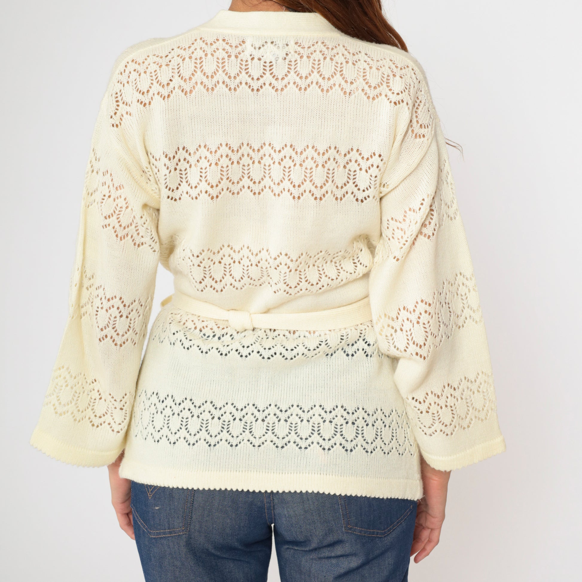 Vintage 70s cardigan sweater in a cream pointelle knit with pockets and an wrap front. Comes with a tie belt.