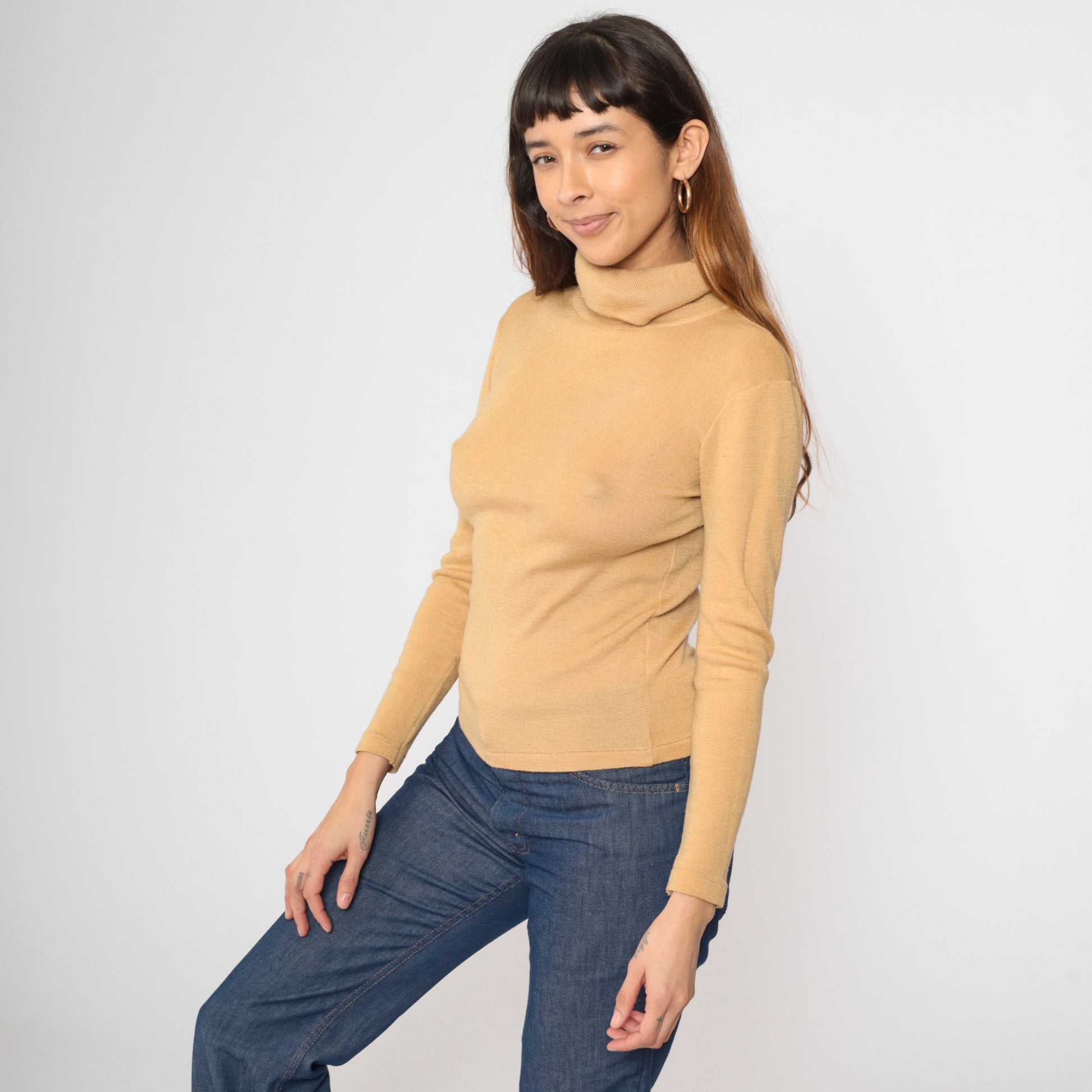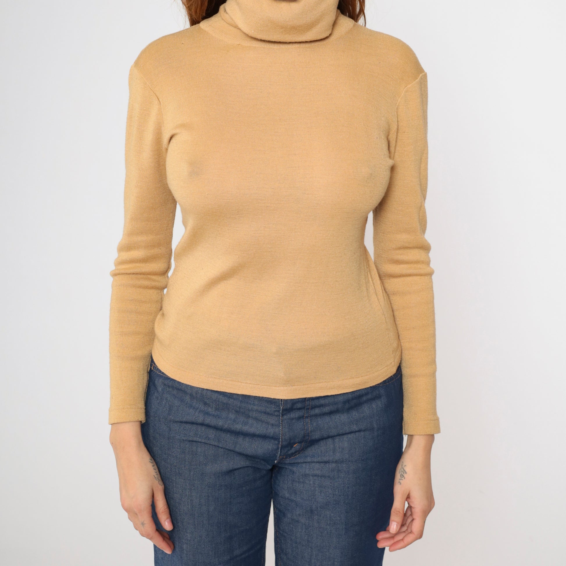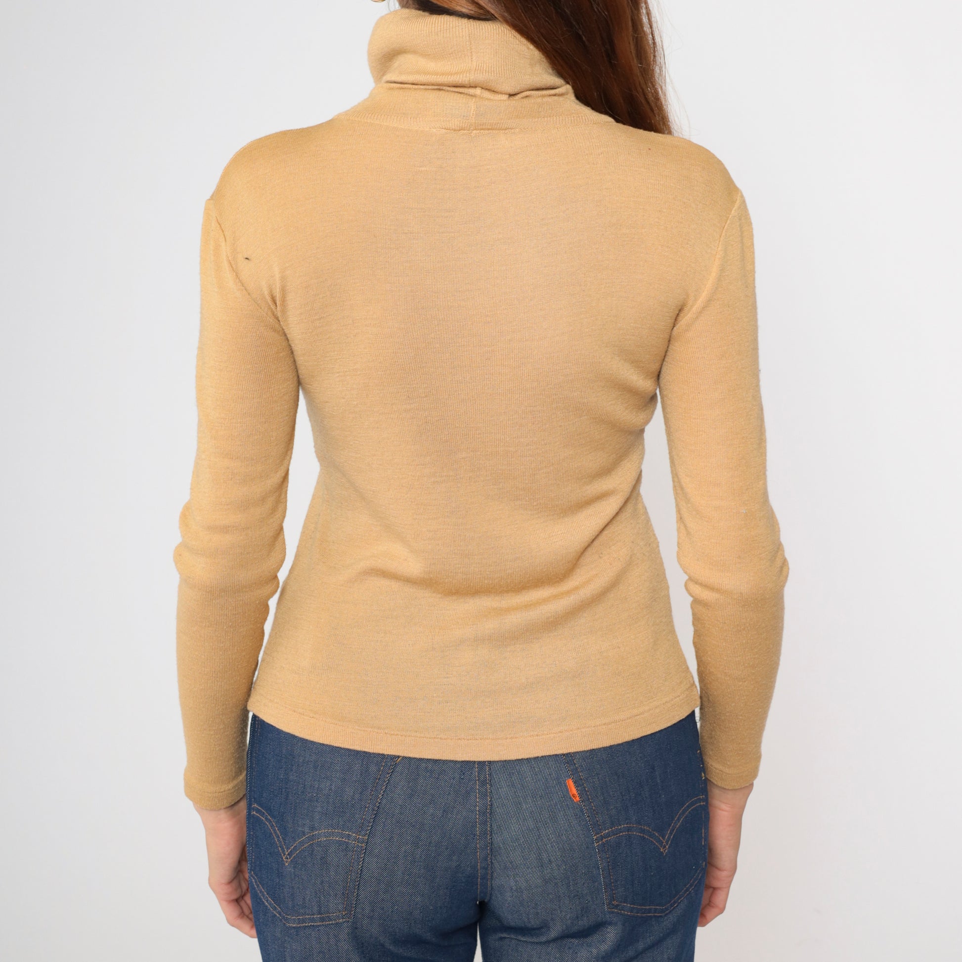 Vintage 70s knit top in a tan acrylic wool blend with a turtleneck and long sleeves. Lightweight knit.