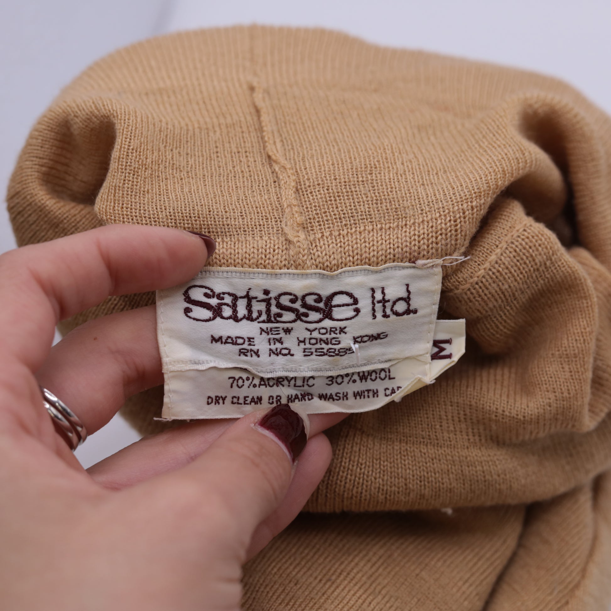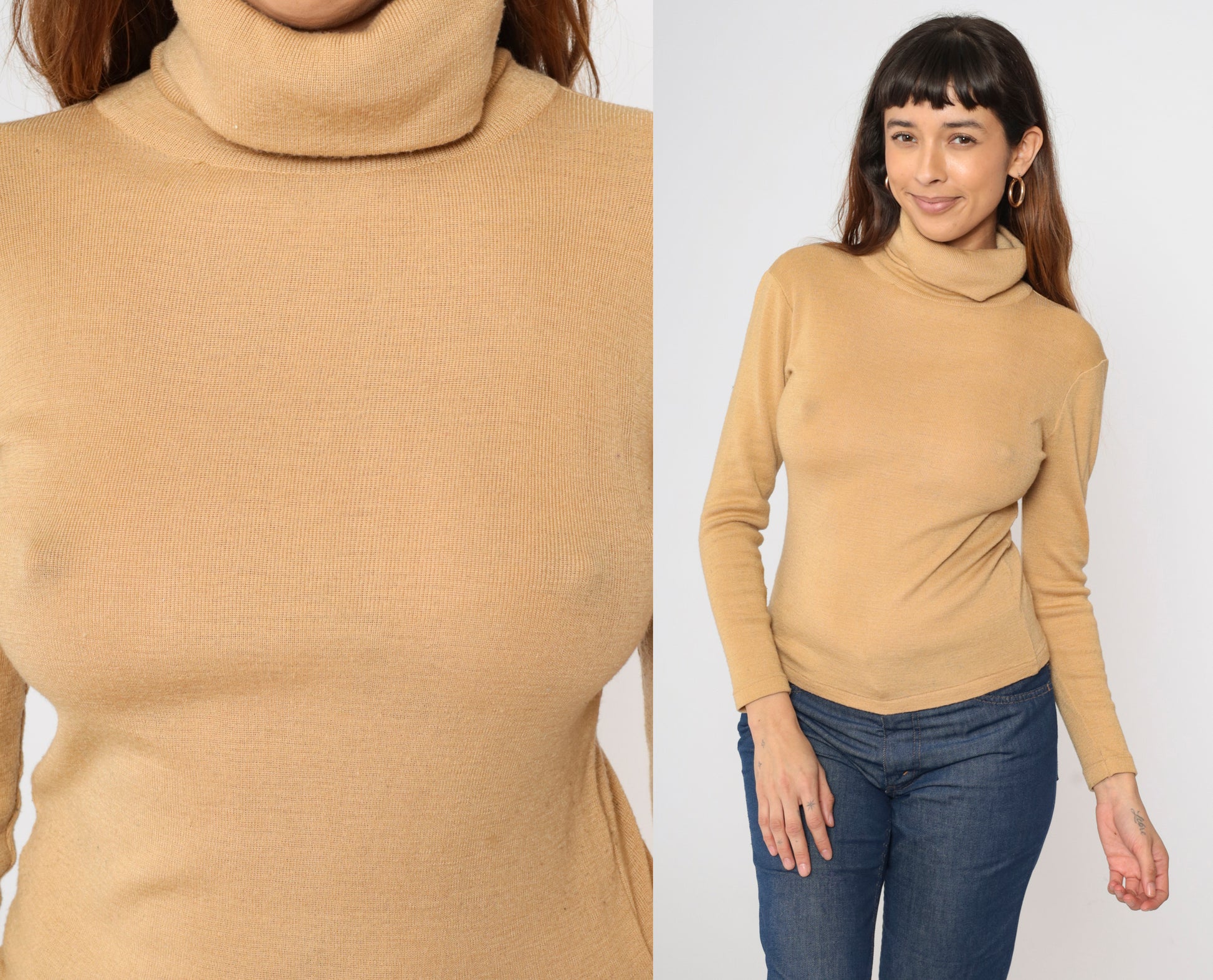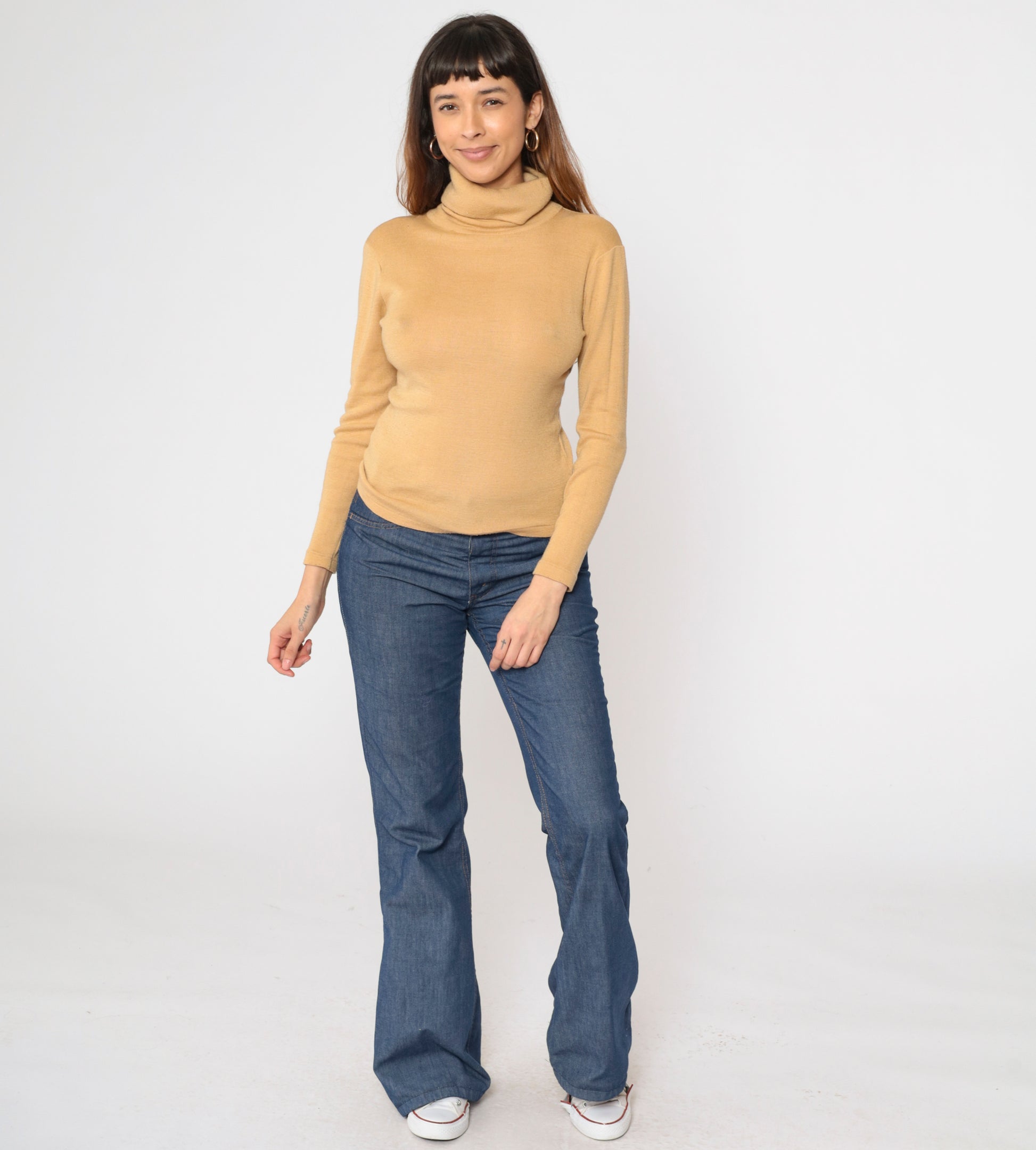 Vintage 70s knit top in a tan acrylic wool blend with a turtleneck and long sleeves. Lightweight knit.