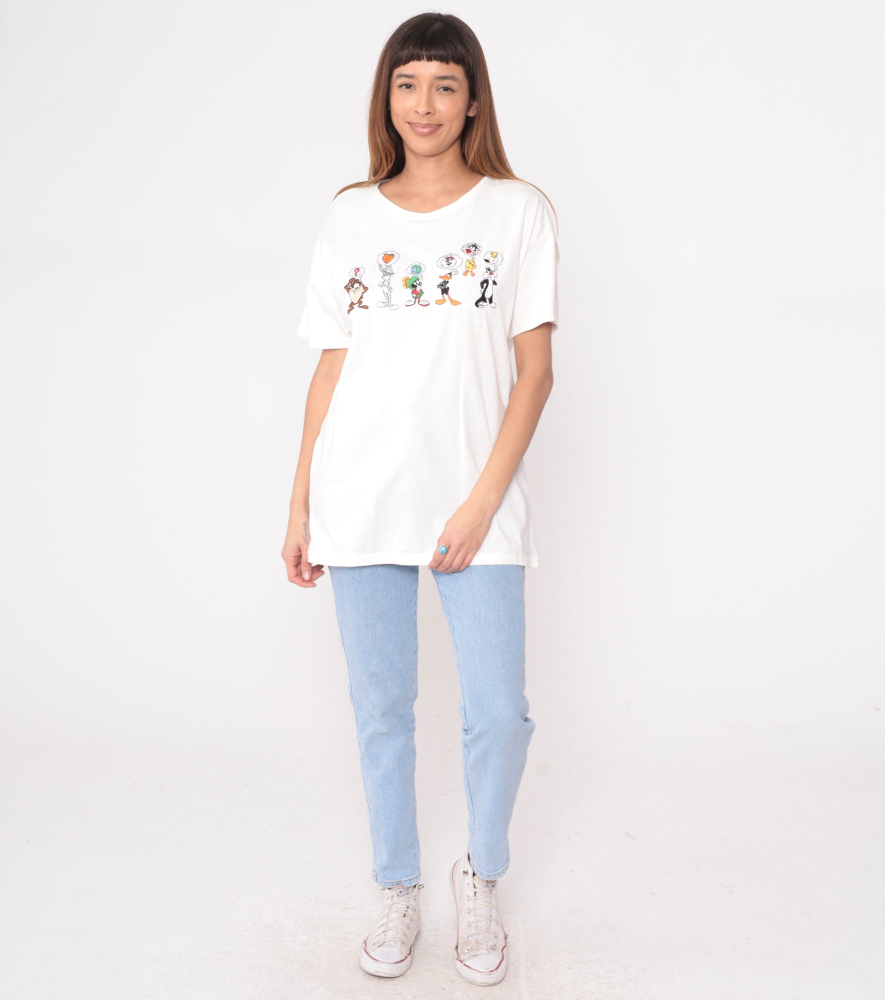 Y2K Looney Tunes Shirt White Cotton Tee Warner Bros Bugs Bunny Daffy Duck Pepe Le Pew Tasmanian Devil Marvin Martian Cartoon Graphic Vintage 2000s Studio Store Large L